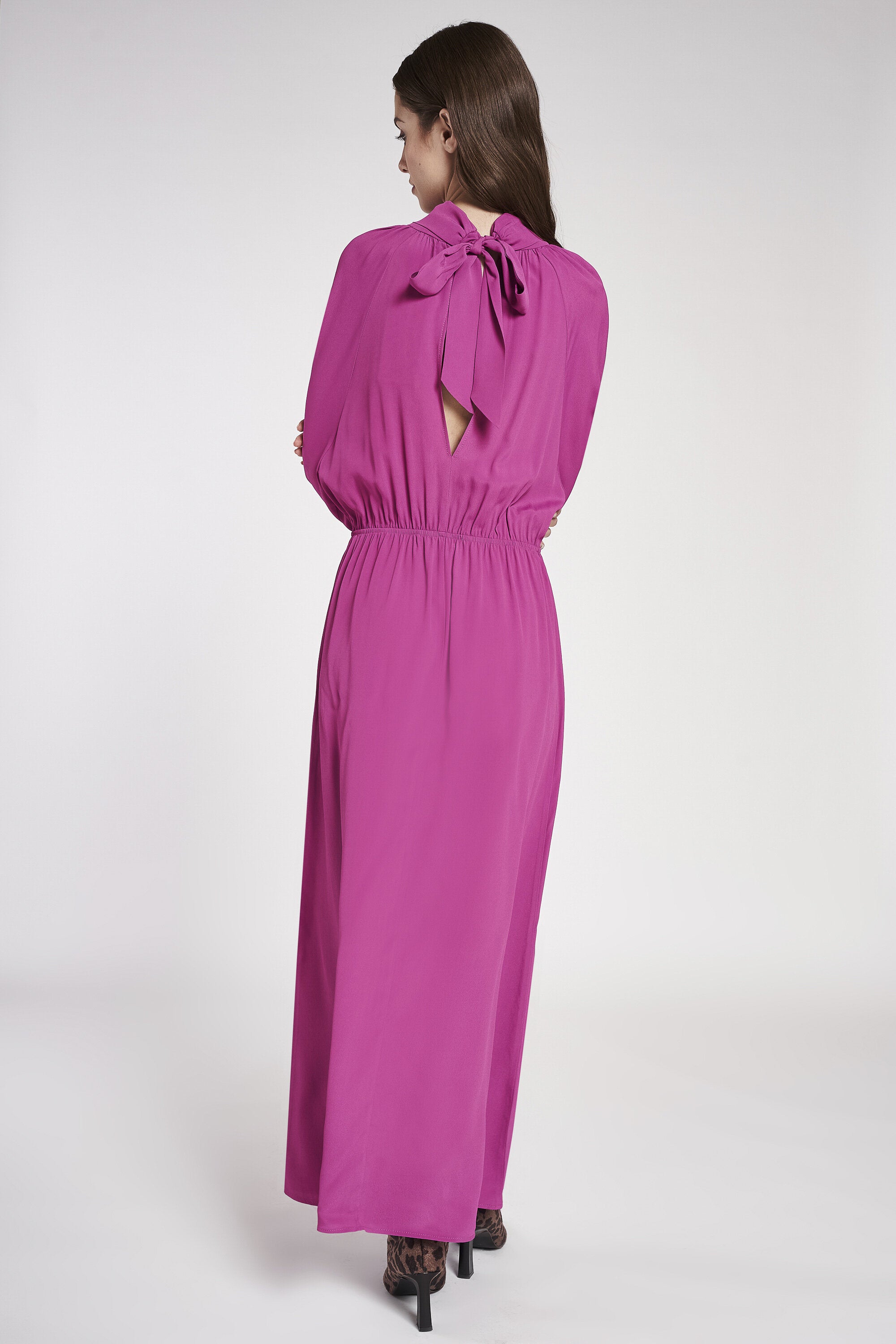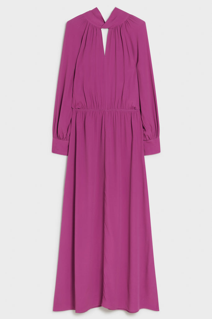 Abito in crepe de chine con collo alto avvitato che diventa nastro da annodare dietro. Elastico in vita, maniche ampie e polsini chiusi da bottoni in madreperla. Linea svasata.