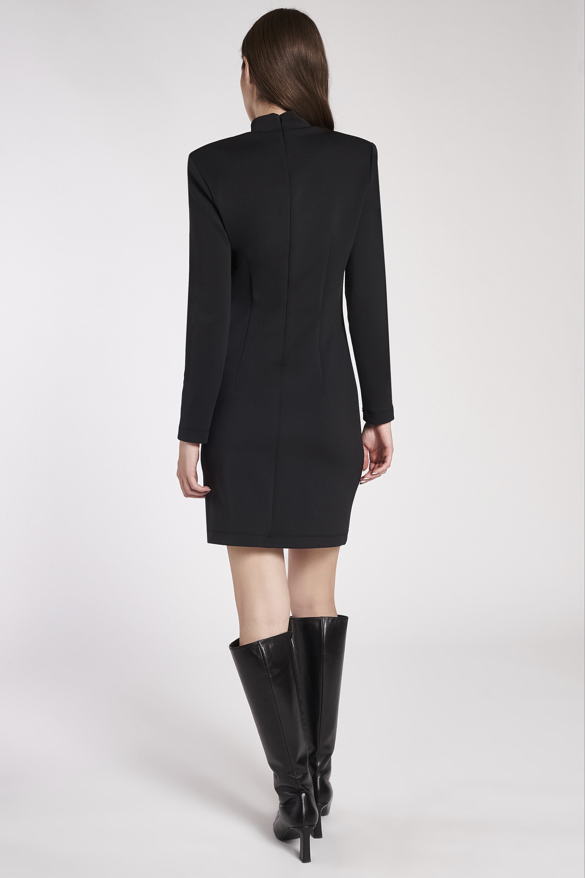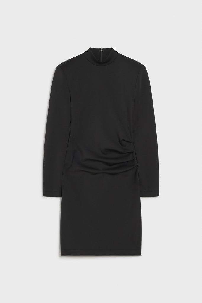 Abito a maniche lughe in jersey elasticizzato con spalline. Collo alto e lampo nel centro dietro. Pieghe nel fianco, lunghezza sopra il ginocchio.