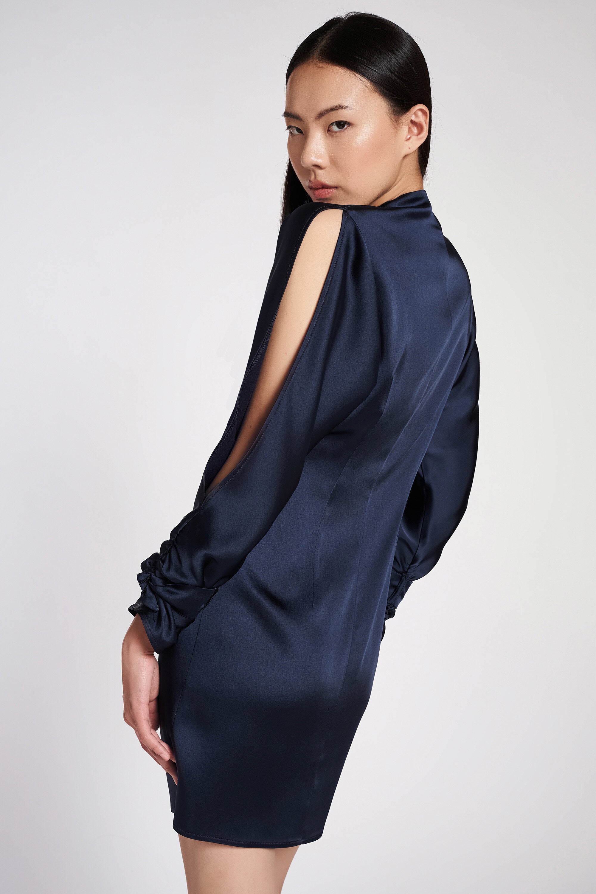 Abito in raso elasticizzato con collo e polsi da annodare. Cut out sulle spalle e arricciatura ai...Learn more
