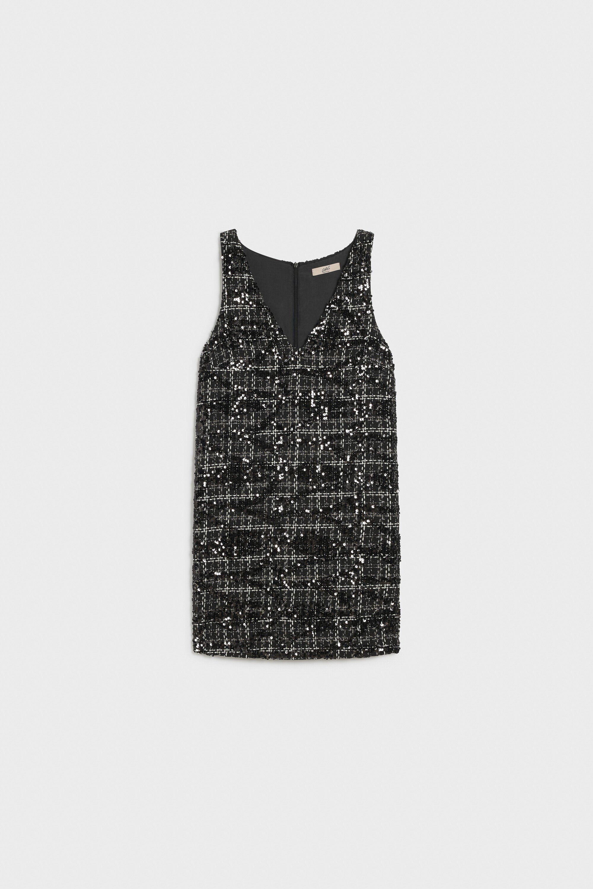 Abito foderato in tessuto bouclè e paillettes. Scollo davanti a V e chiusura lampo nel centro die...Learn more