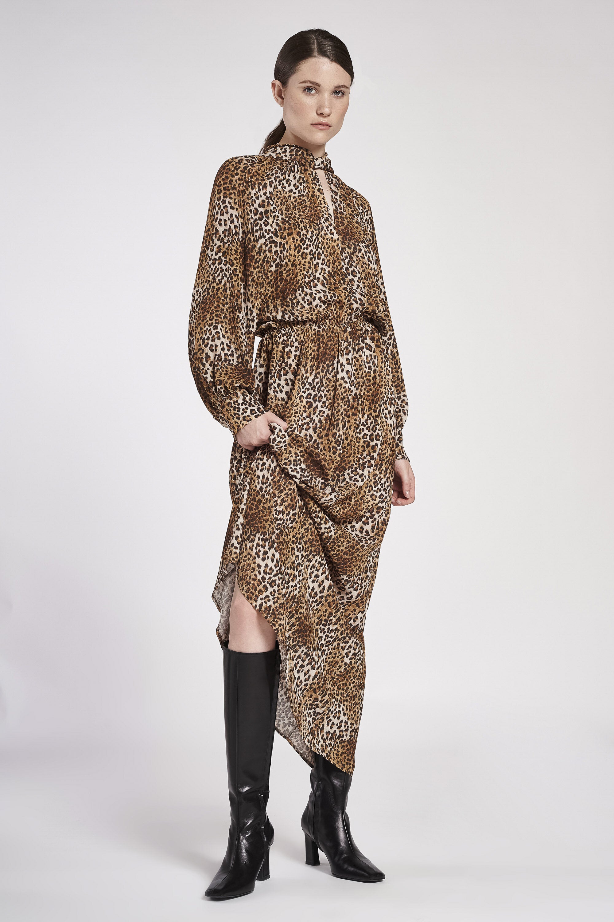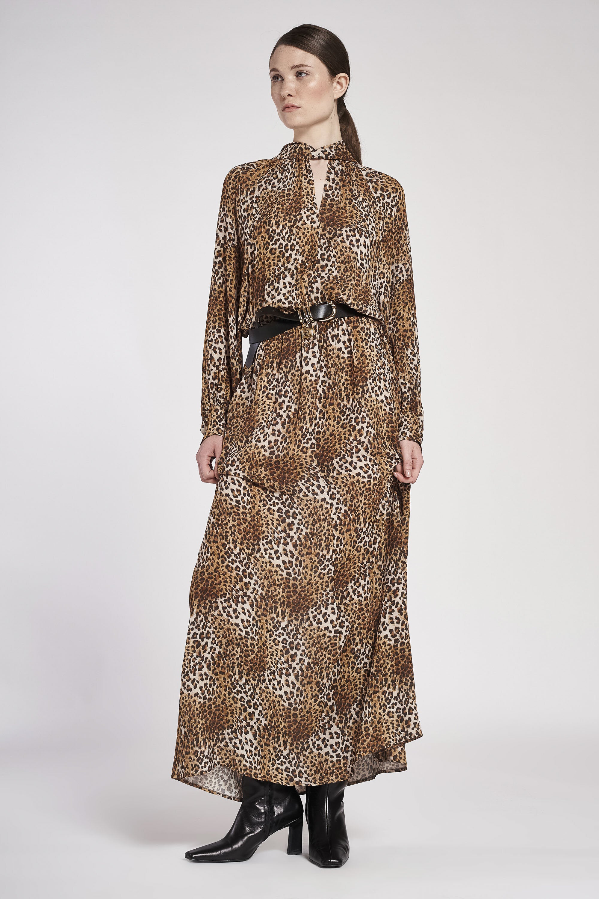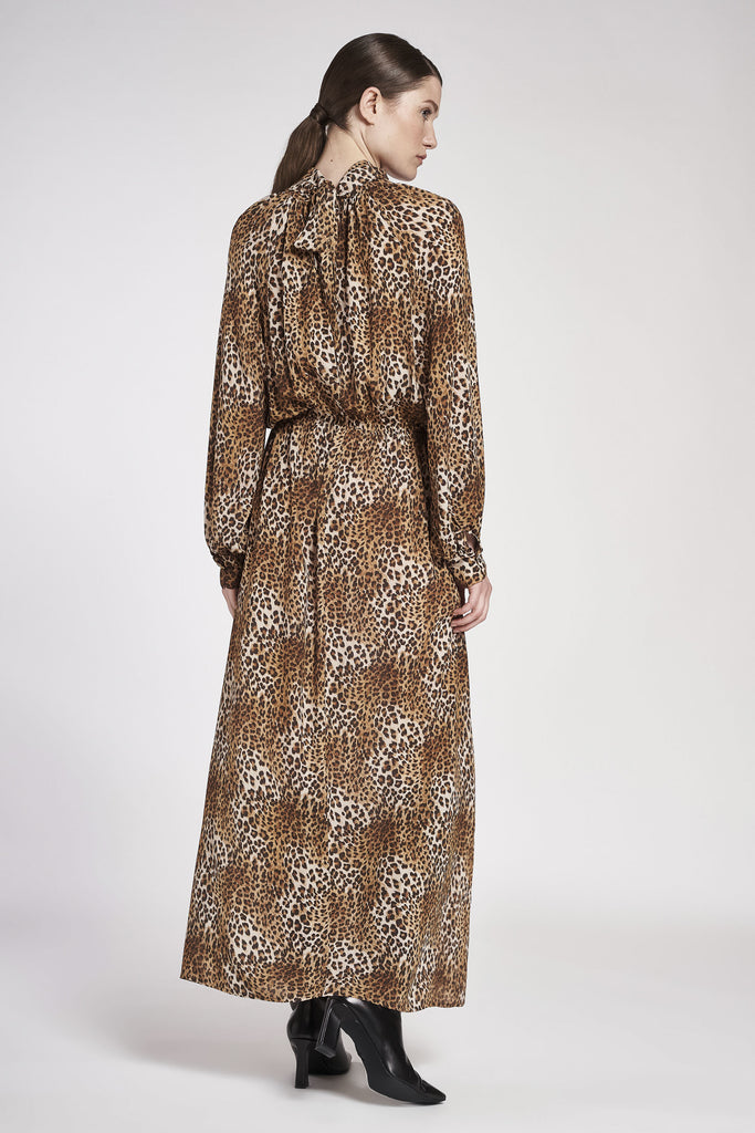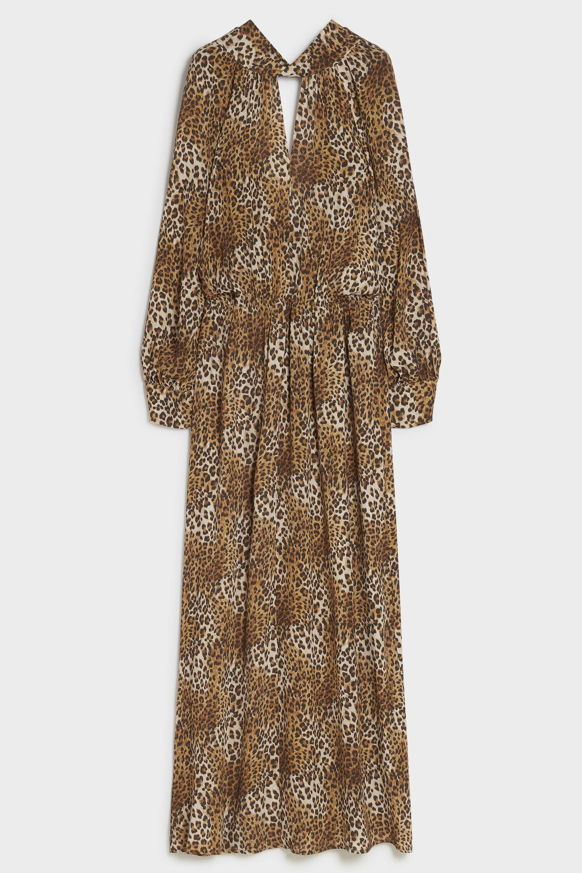 Abito svasato in viscosa stampa leoprint con collo alto incrociato che diventa nastro da annodare dietro. Elastico in vita, maniche ampie e polsini chiusi da bottoni in madreperla.