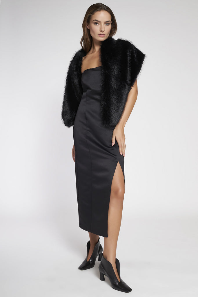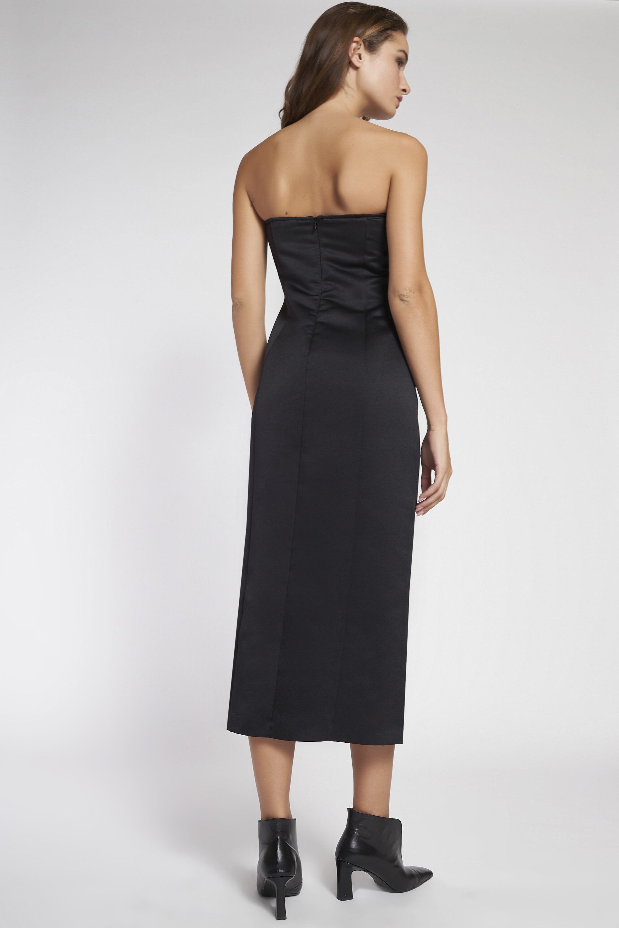 Abito midi in raso duchesse. Scollo dritto con elastico sul retro. Apertura lampo nel centro dietro. Spacco sul davanti. Linea aderente.
