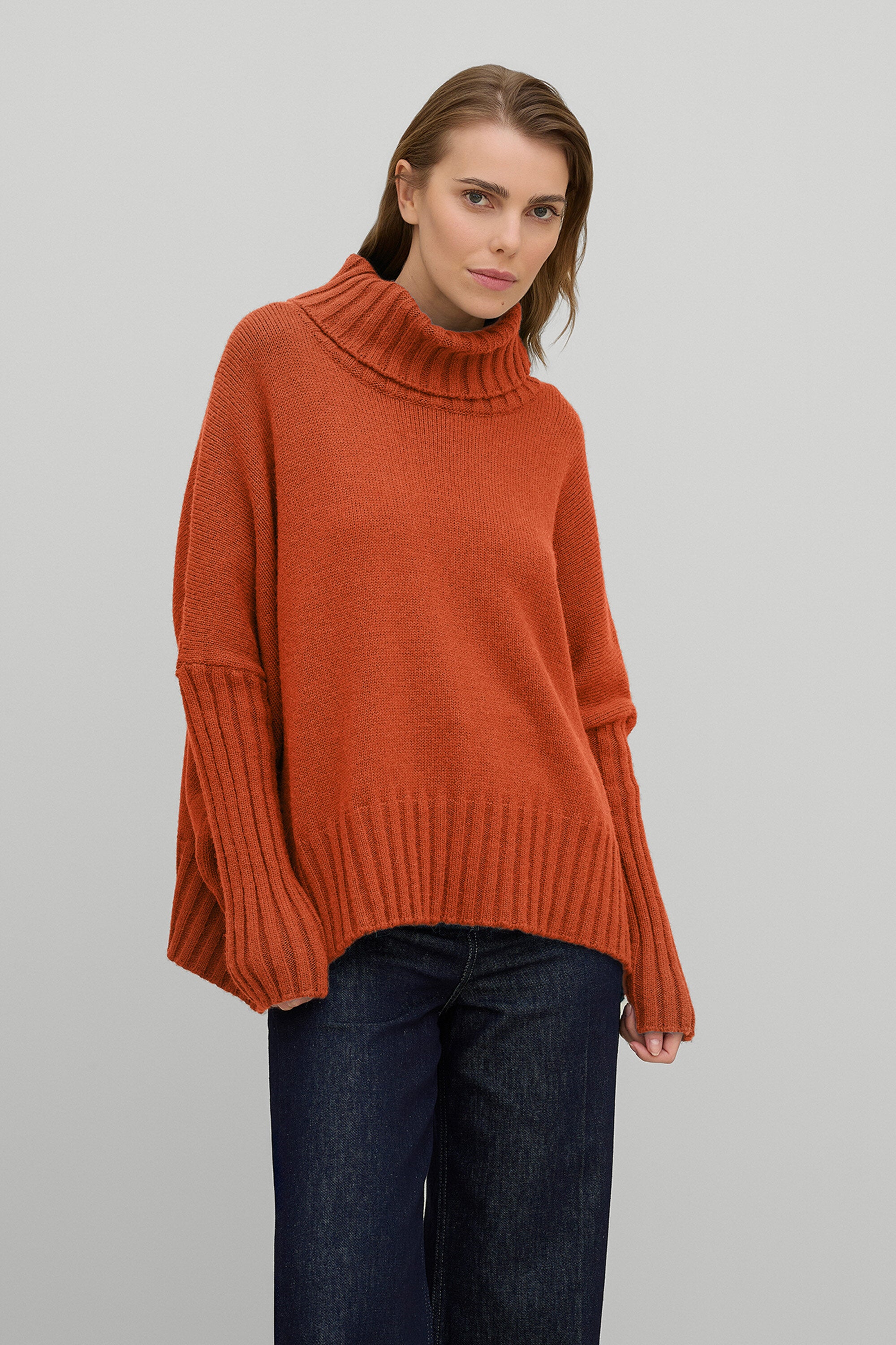 Maglia a collo alto in lana grossa. Maniche e fondo lavorati a coste. Giro manica sceso. Linea ampia. Lunghezza ai fianchi.