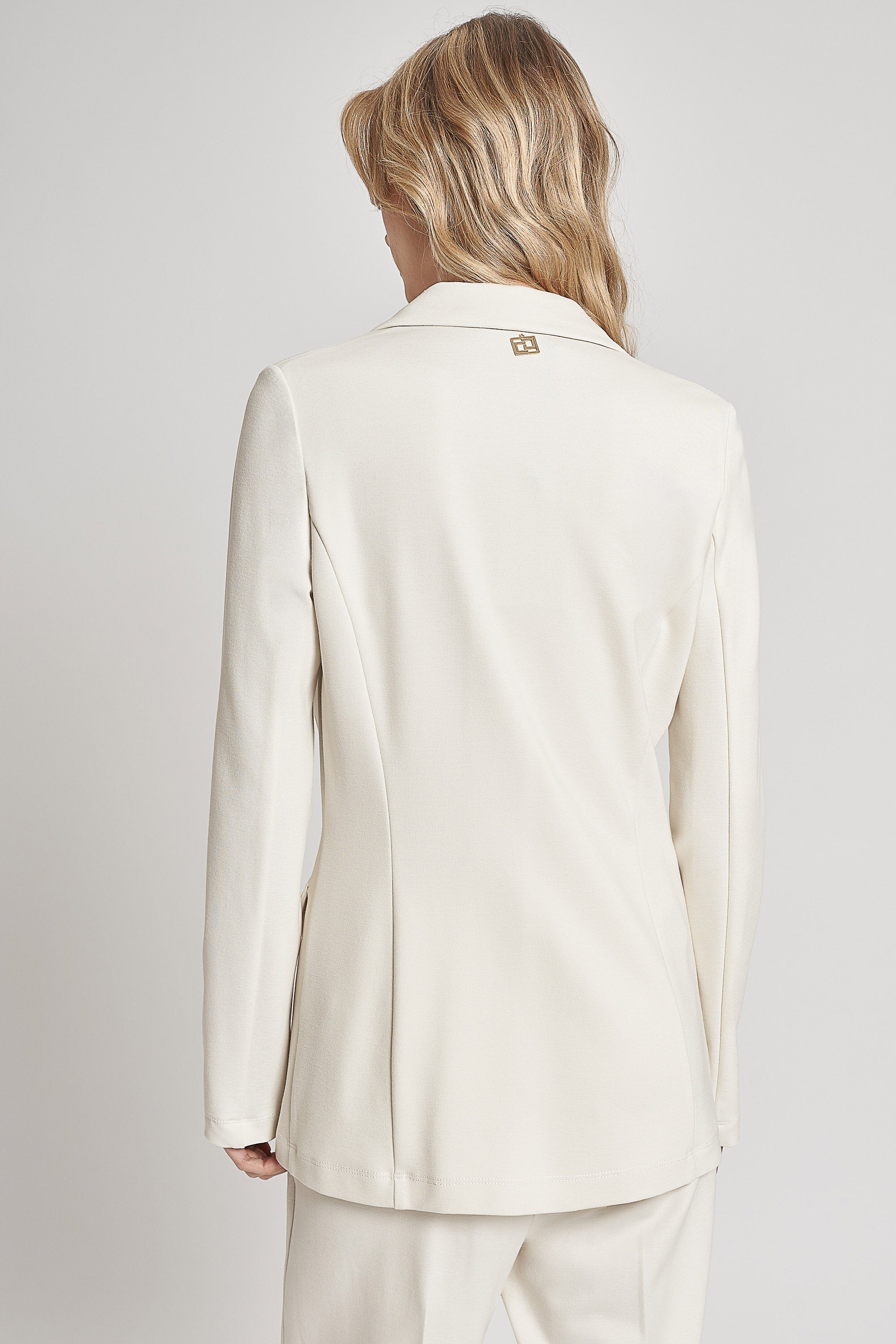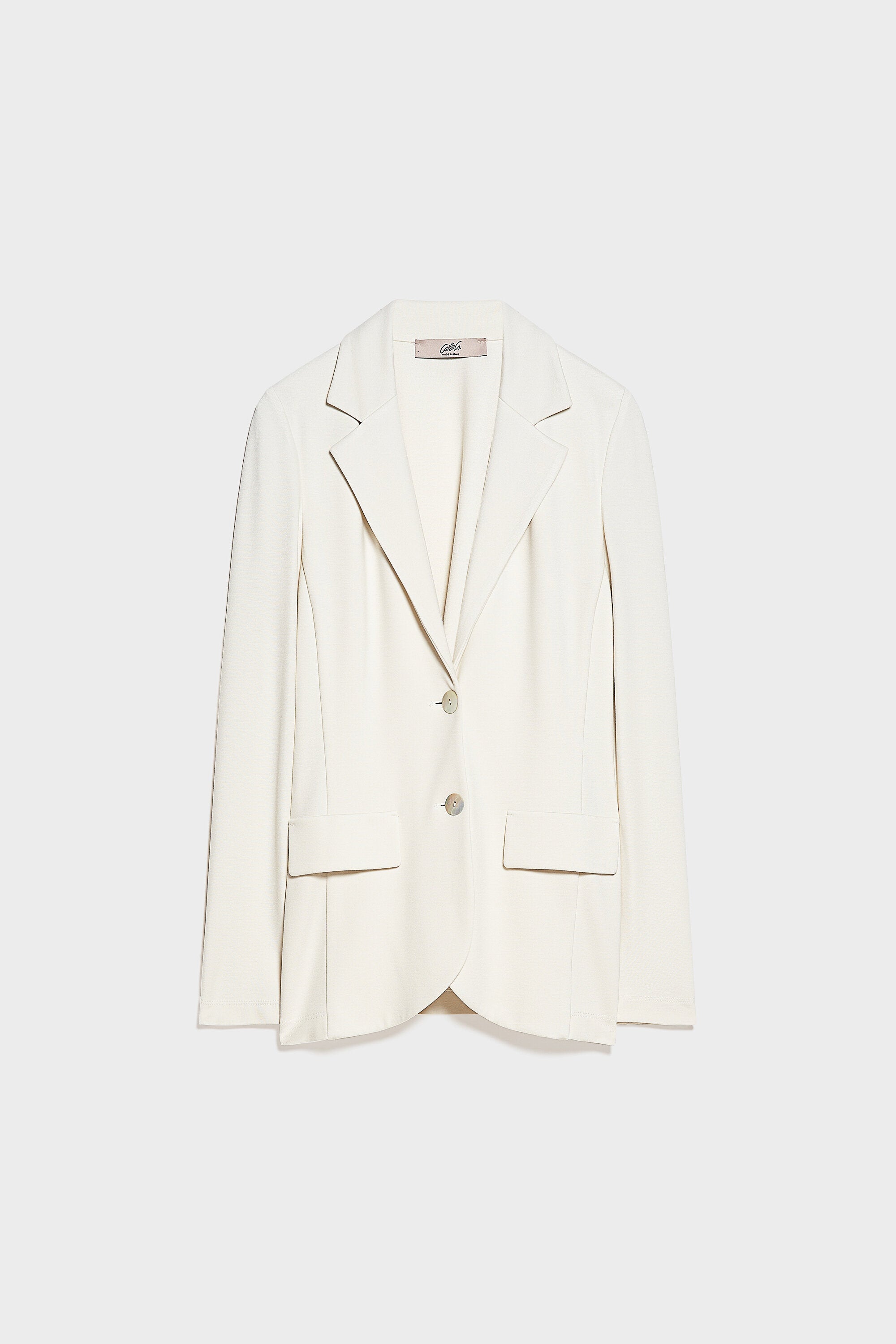 Blazer monopetto sfoderato in tessuto a maglia elasticizzata. Collo con revers e chiusura con bottoni in madreperla e medaglietta CG nel centro dietro. Patte applicate effetto tasca. Lunghezza sotto ai fianchi.