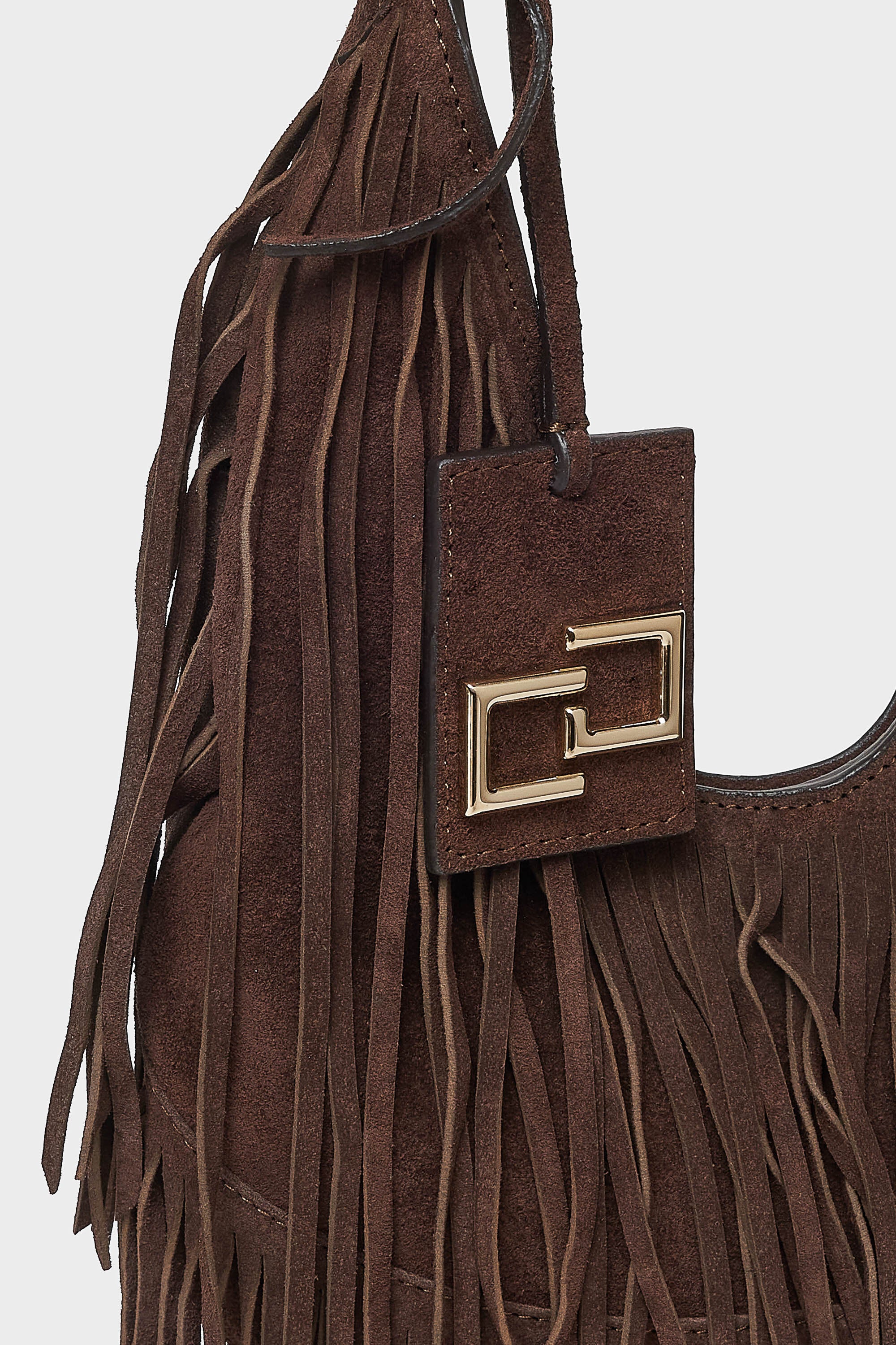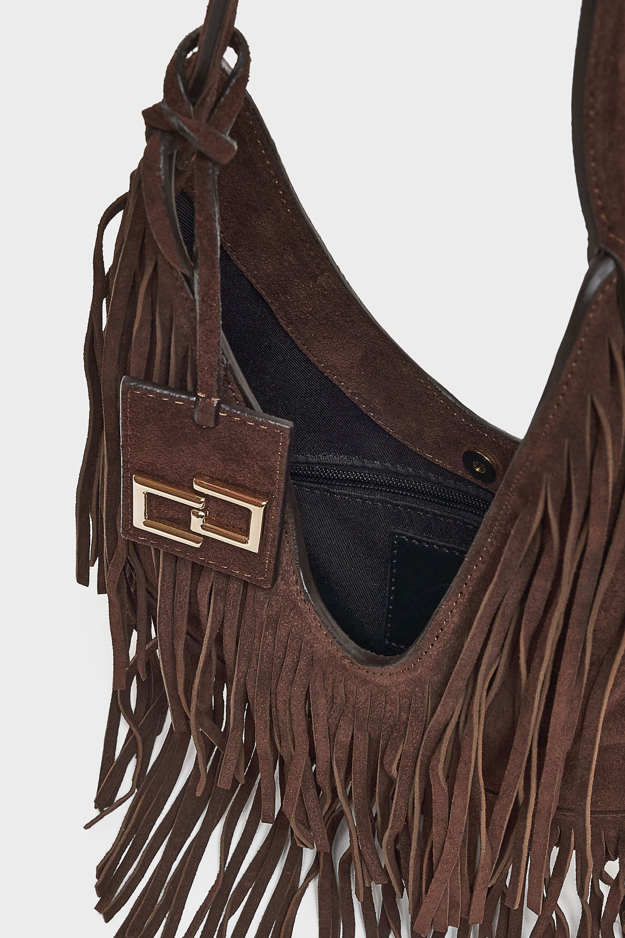 Borsa a spalla in camoscio con frange esterne. Chiusura con calamita interna e targhetta pendente...Learn more