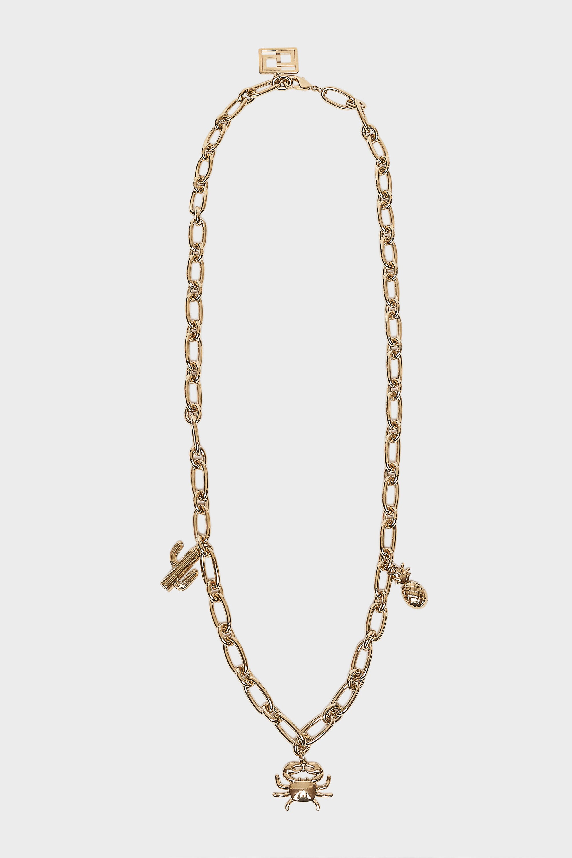 Cintura a catena con pendente cactus, granchio e ananas. Chiusura con moschettone con pendente logo CG in metallo.