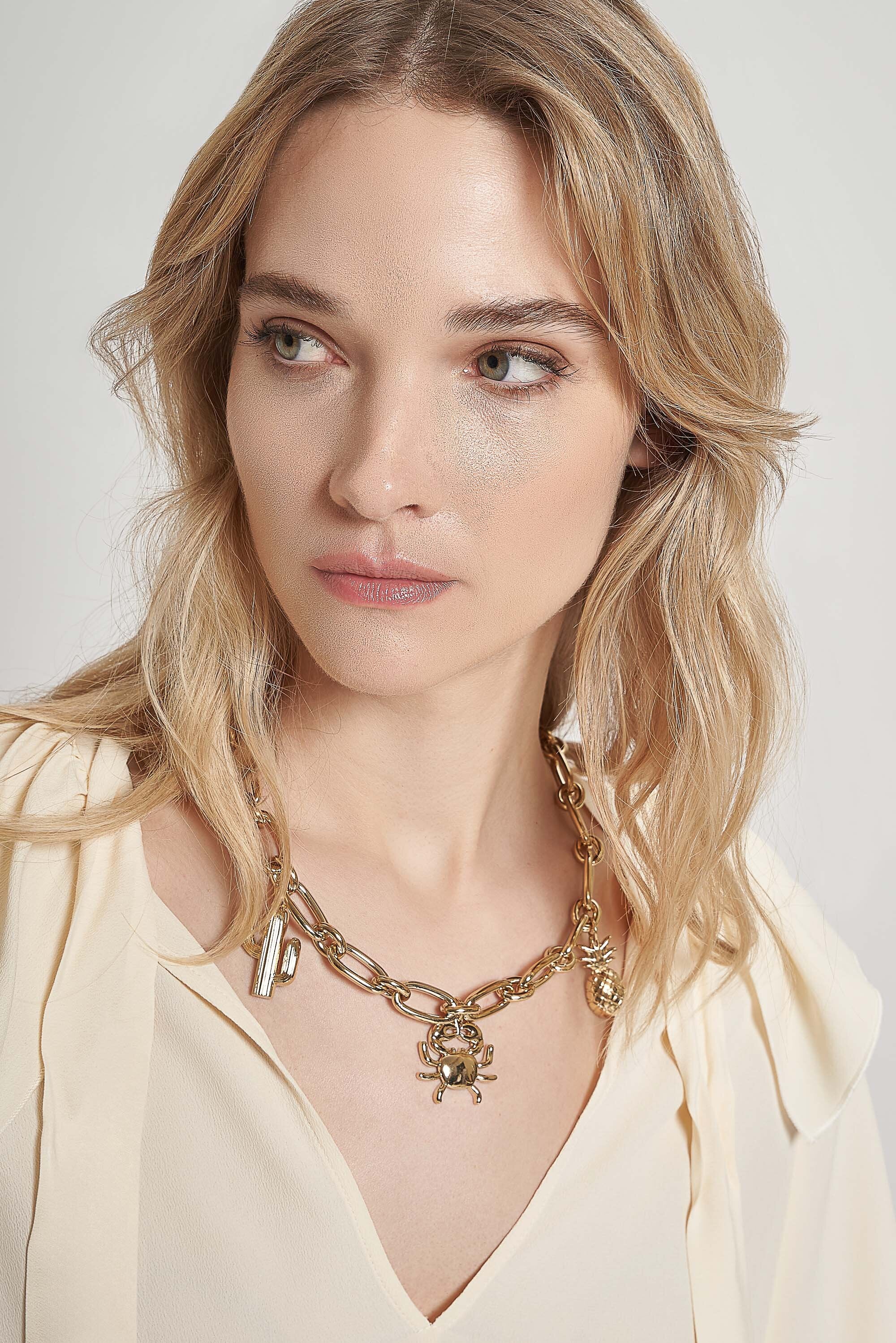 Collana girocollo a catena grossa con pendente cactus, granchio e ananas. Chiusura con moschetton...Learn more