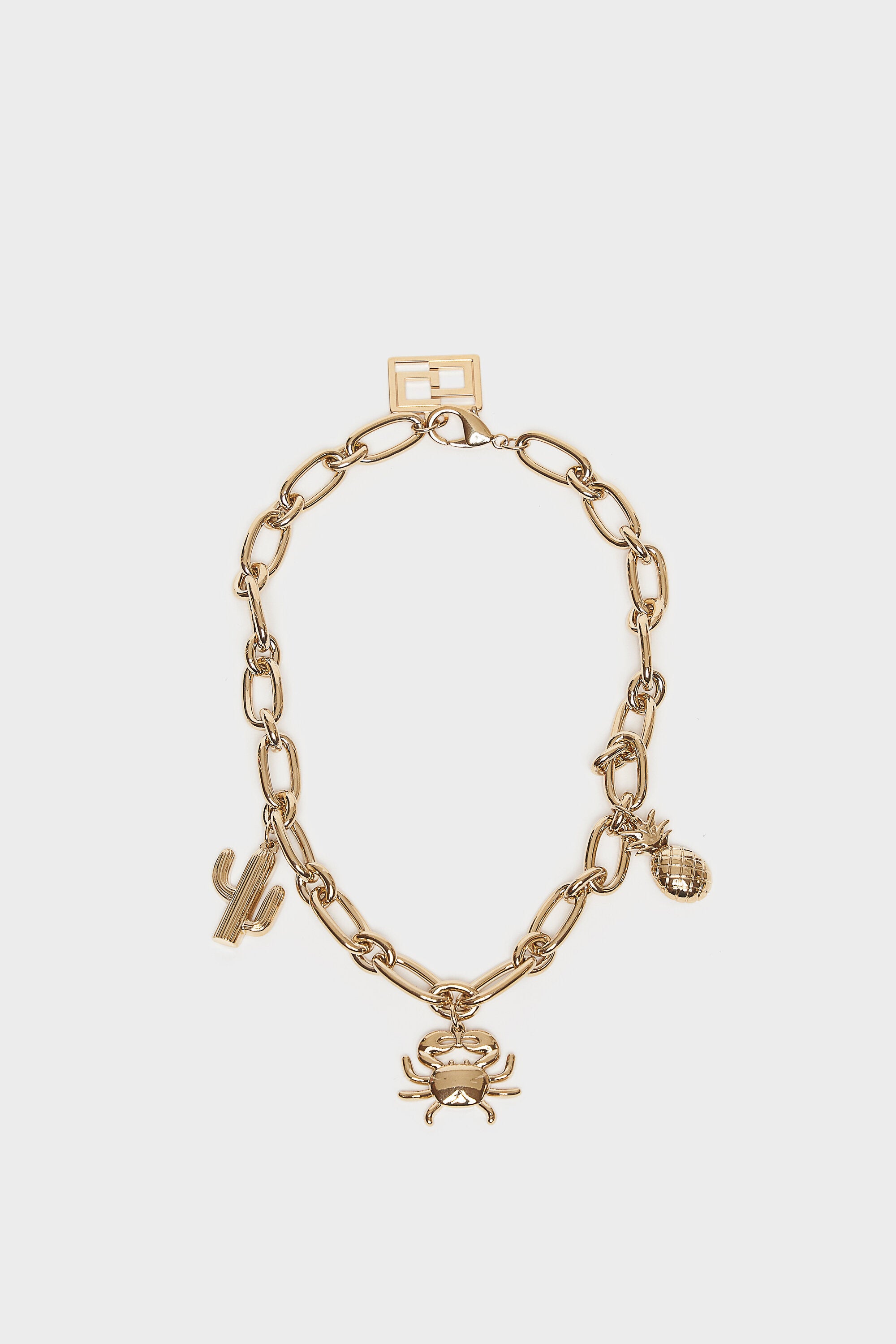Collana girocollo a catena grossa con pendente cactus, granchio e ananas. Chiusura con moschettone e catenella regolabile con pendente logo CG in metallo.