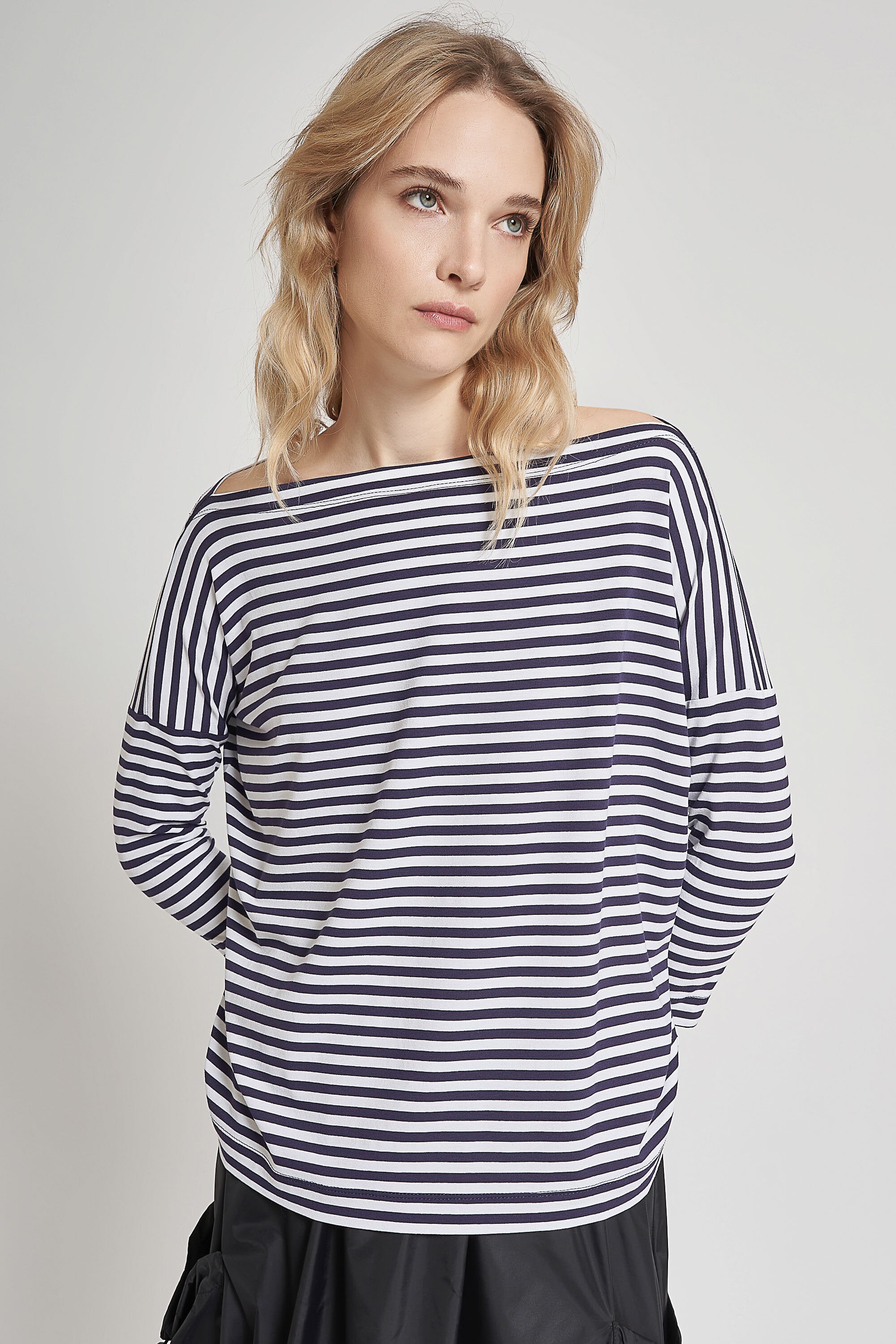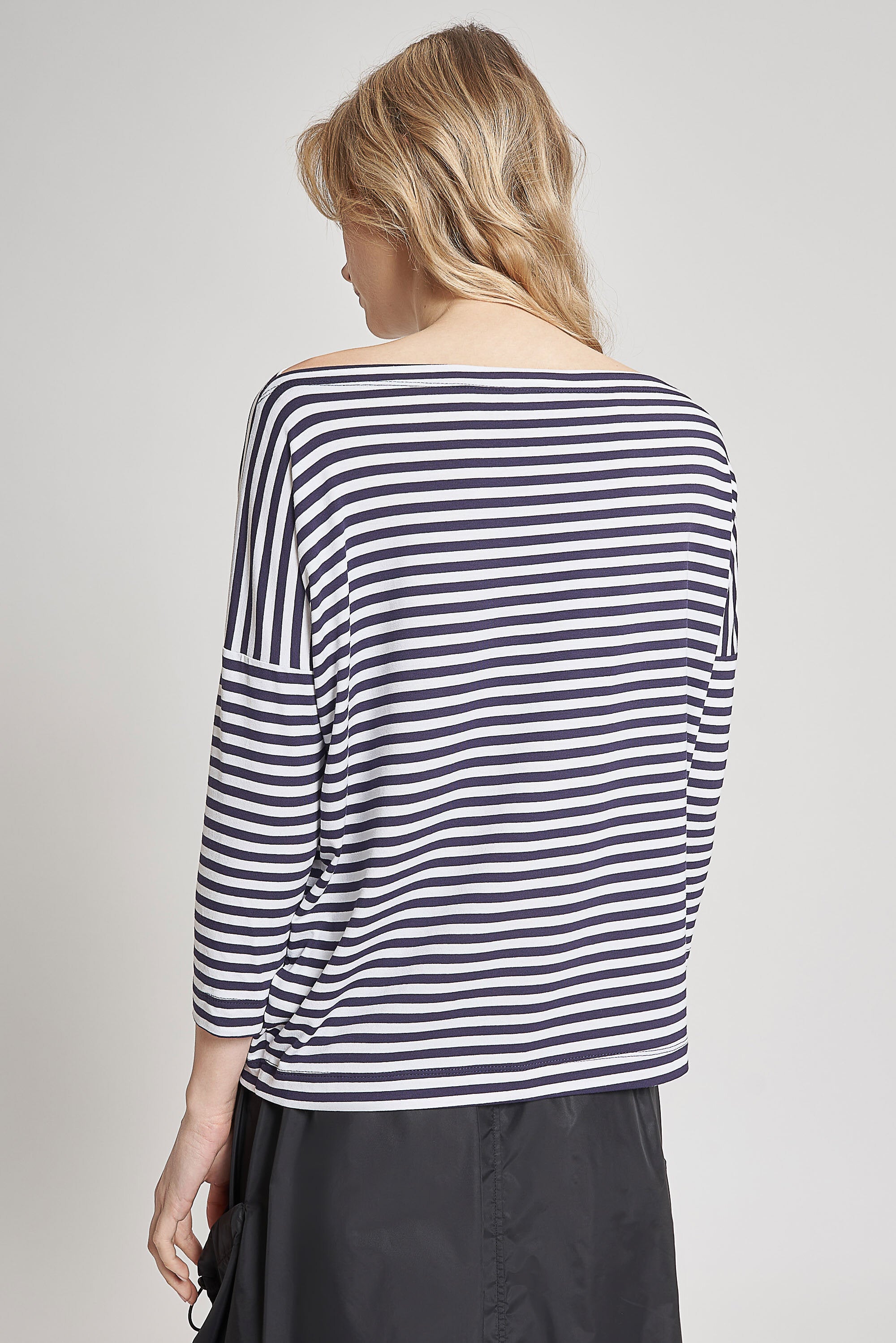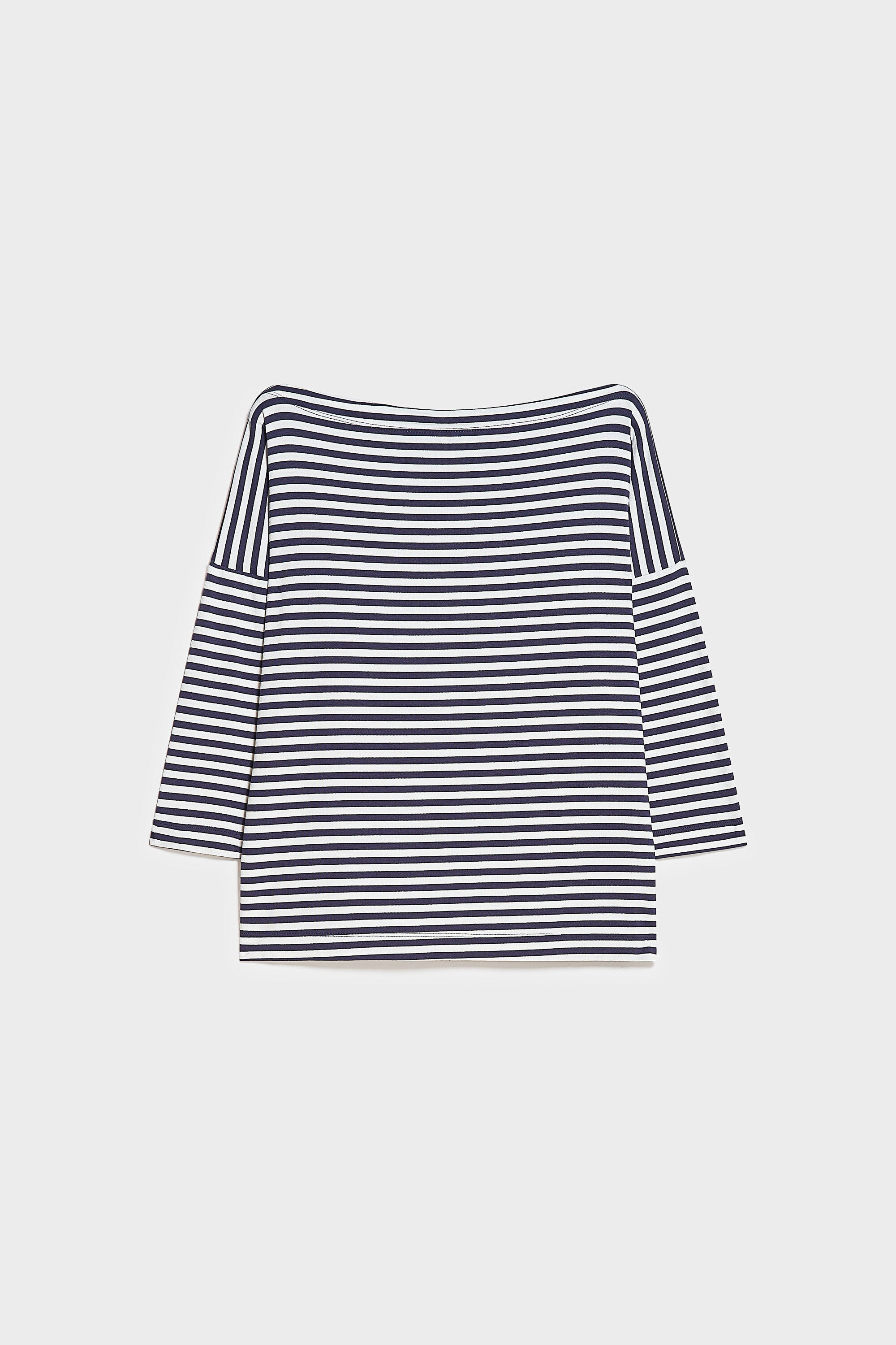 Maglia con maniche a 3/4 in jersey rigato. Scollo a barchetta. Lunghezza sotto ai fianchi