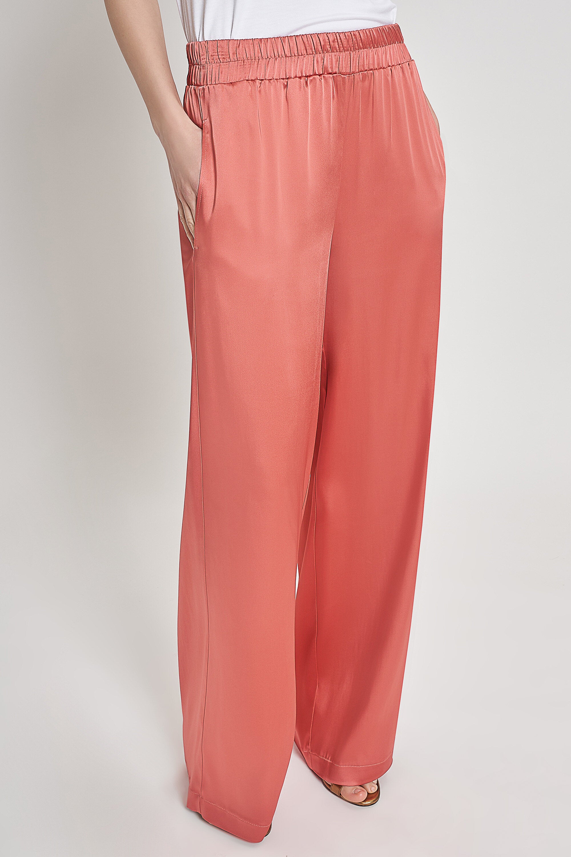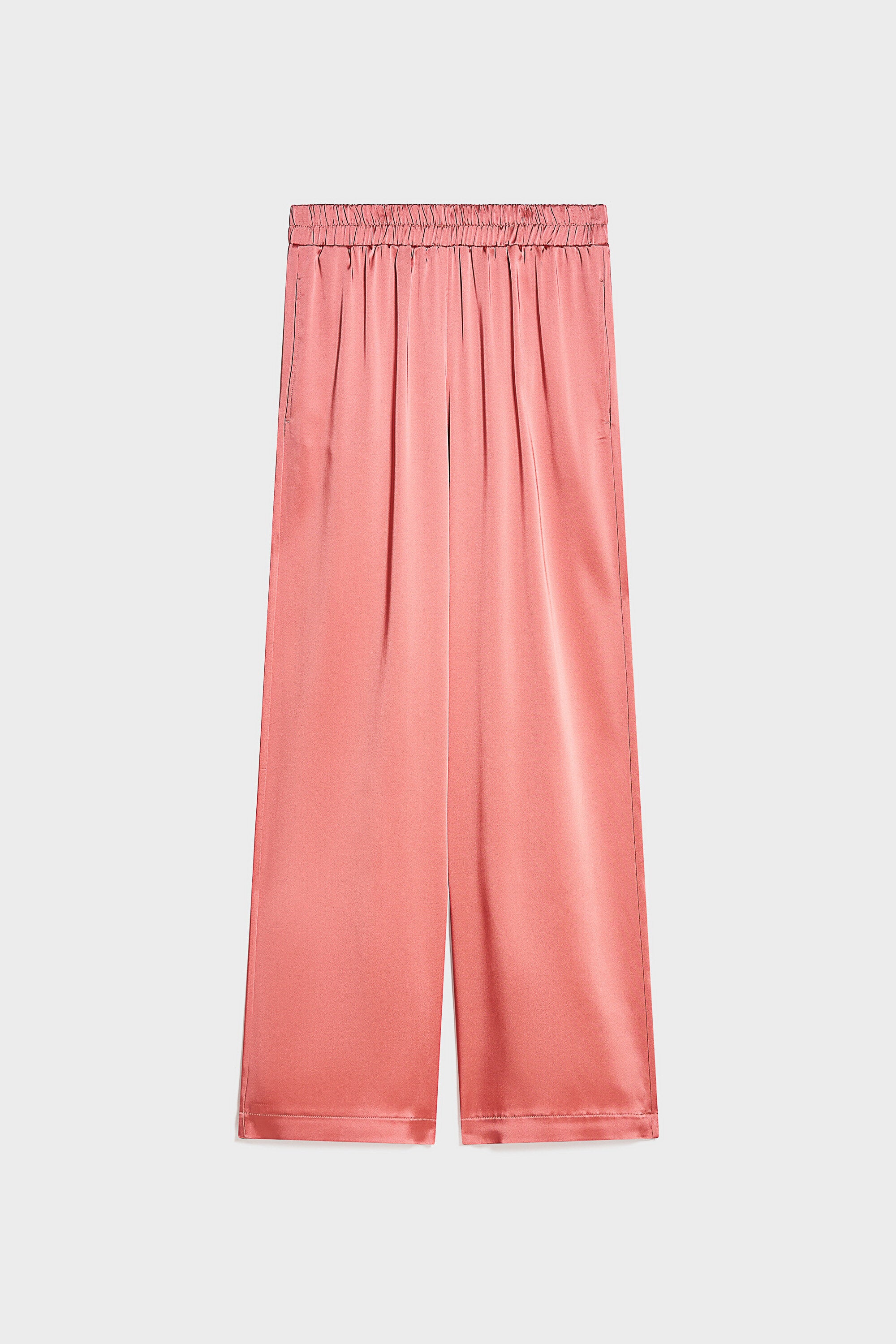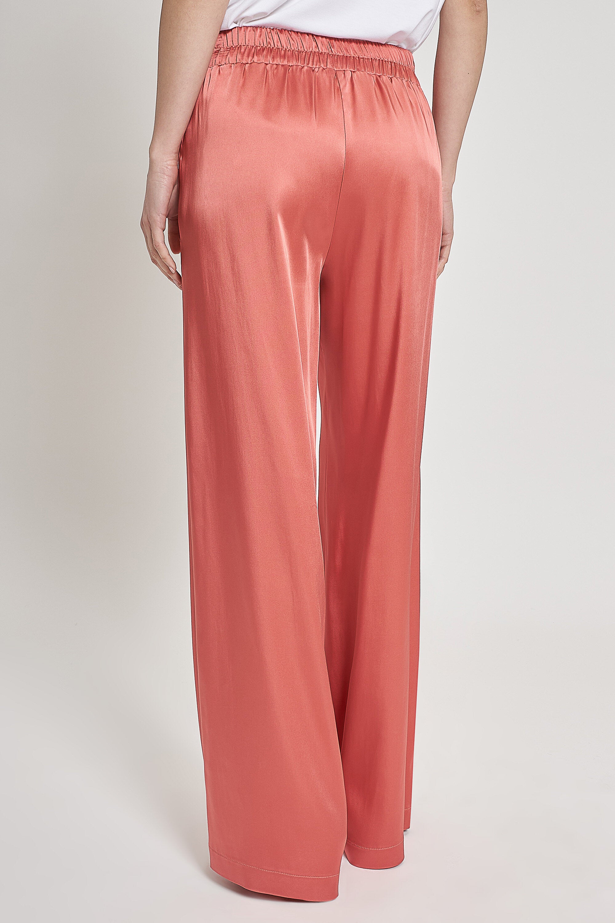 Pantaloni larghi in raso con vita regolare e cavallo basso. Fascione elastico ed entrate tasche l...Learn more