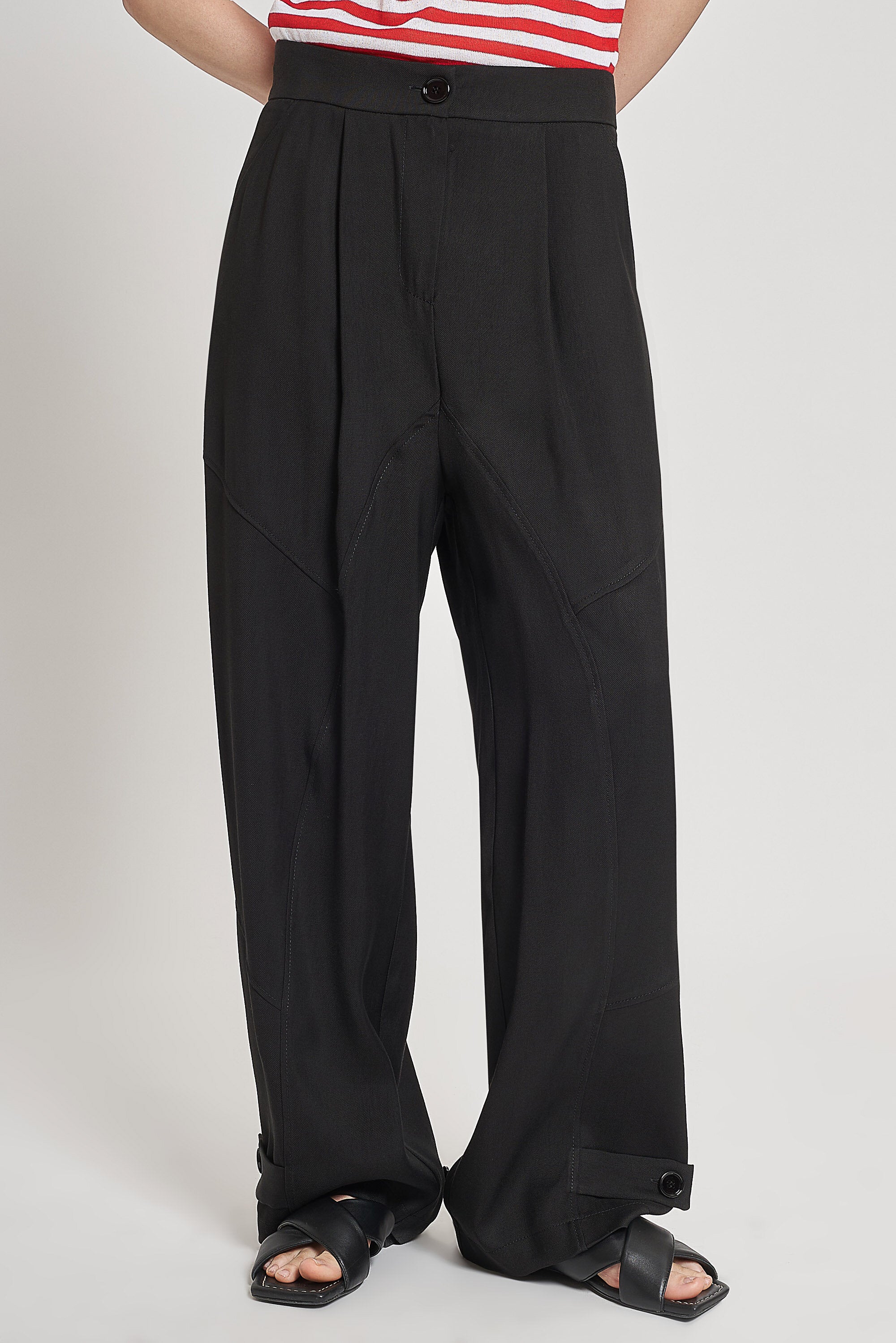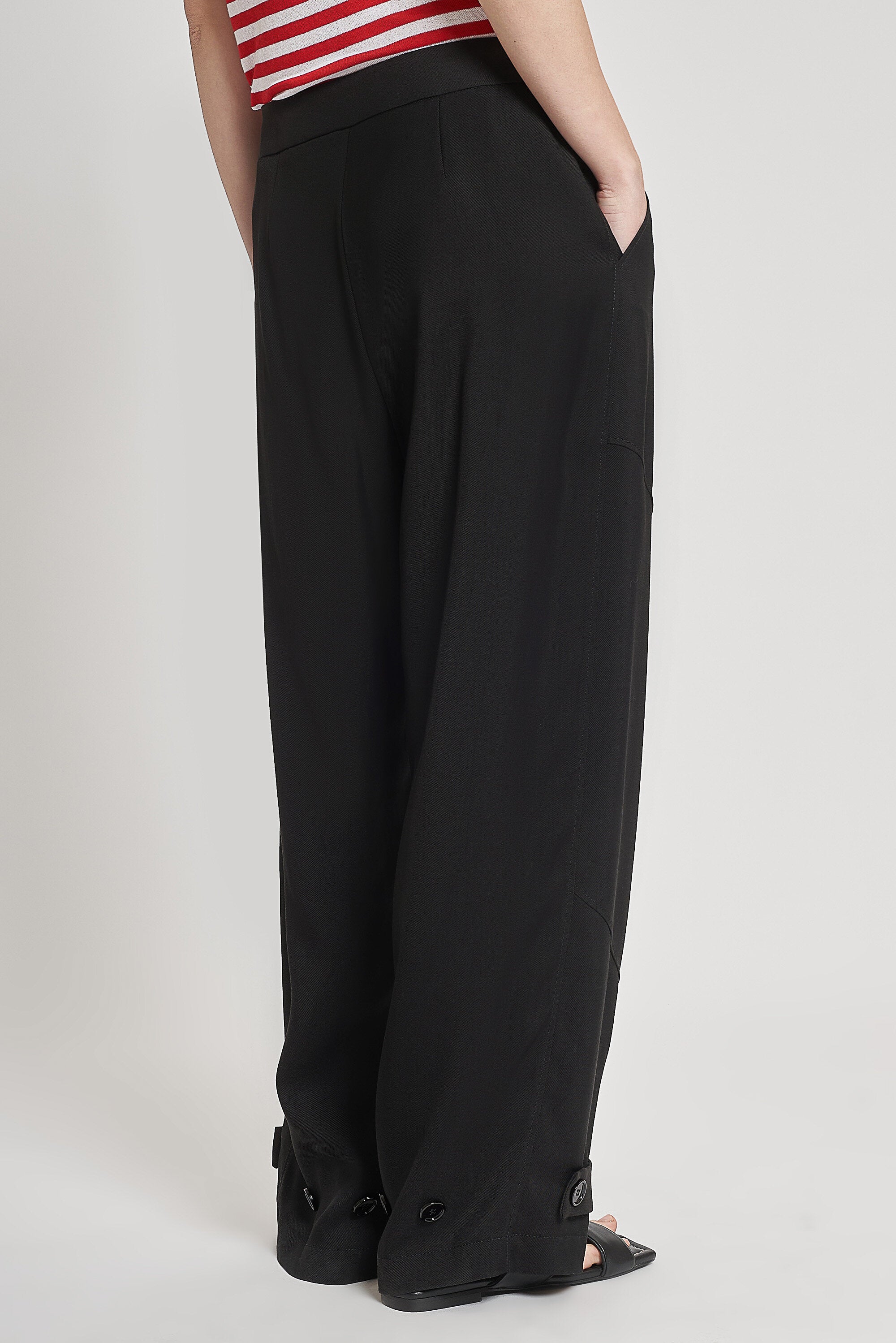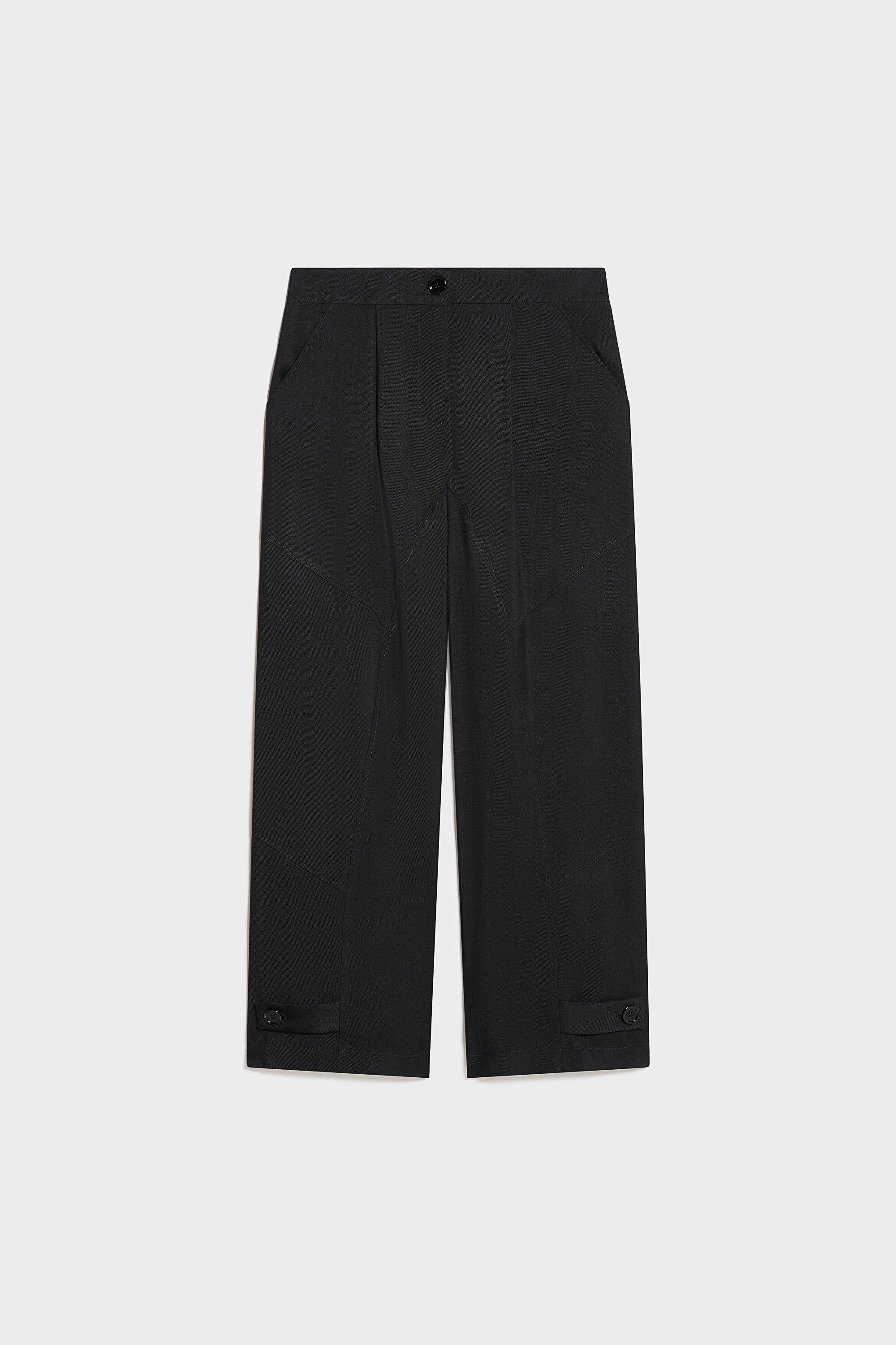 Pantaloni ampi in tessuto fluido diagonale con vita regolare e cavallo basso. Chiusura con bottone in eco corno e lampo nascosta e tasche alla francese. Fondo regolabile con bottoni in eco corno.