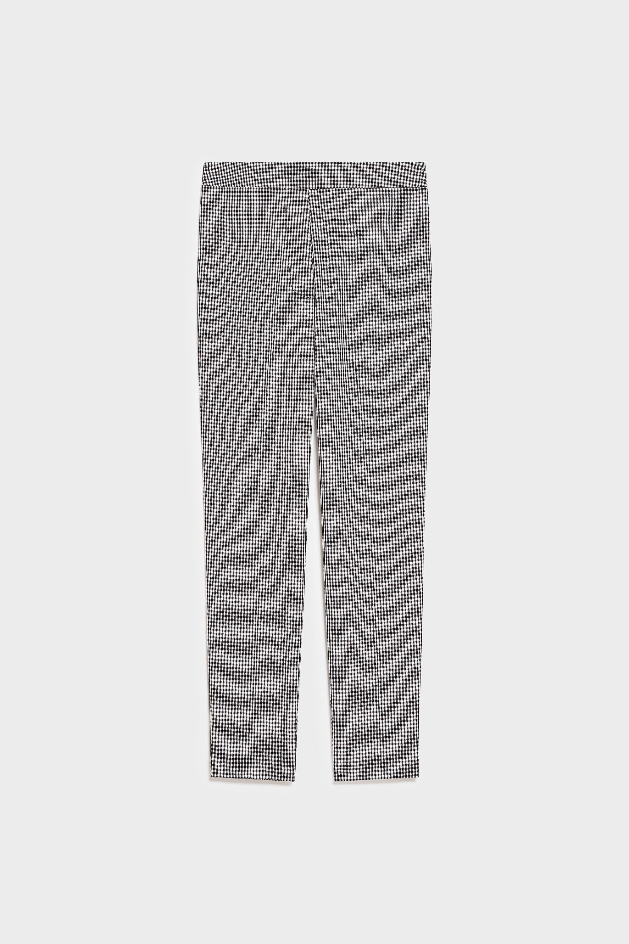 Pantaloni stretti in check medium con piega stirata, vita regolare e cavallo basso. Vita davanti con finta apertura ed elastico nel fascione dietro. Entrata tasche laterale.