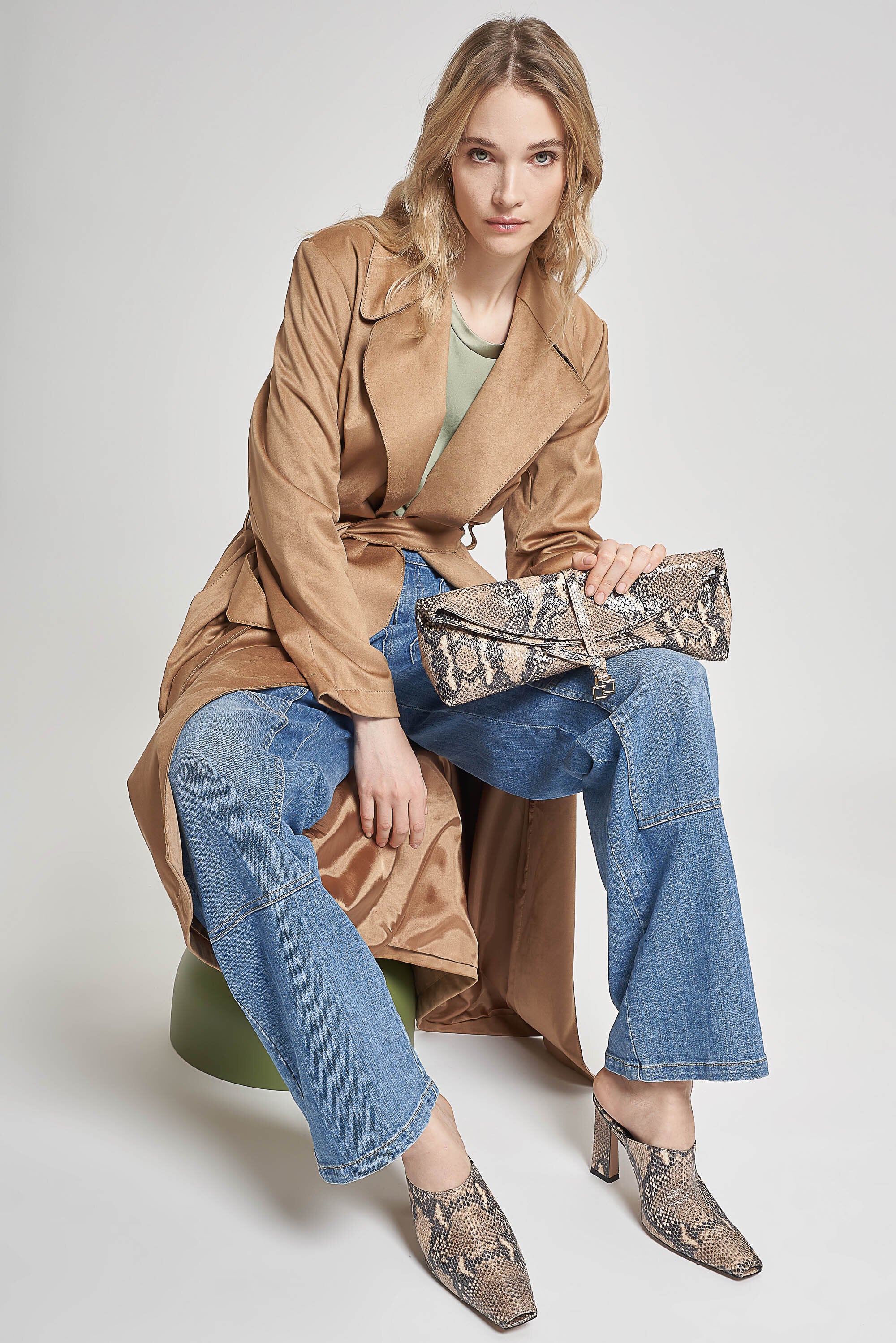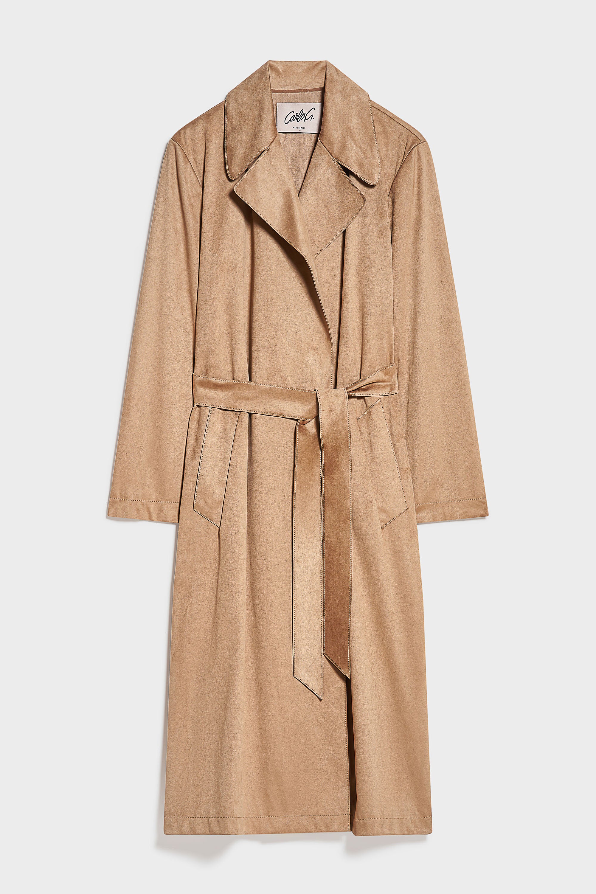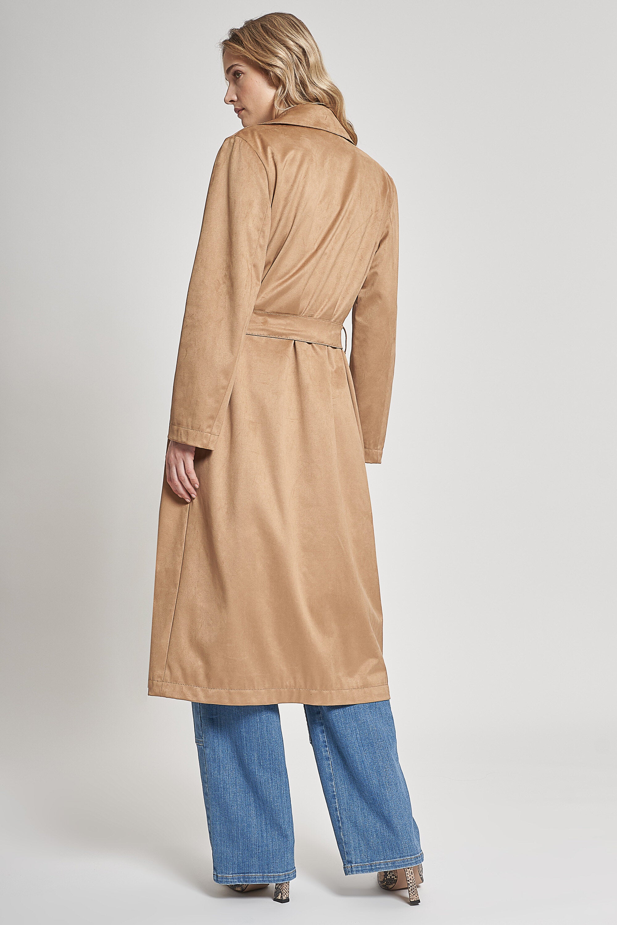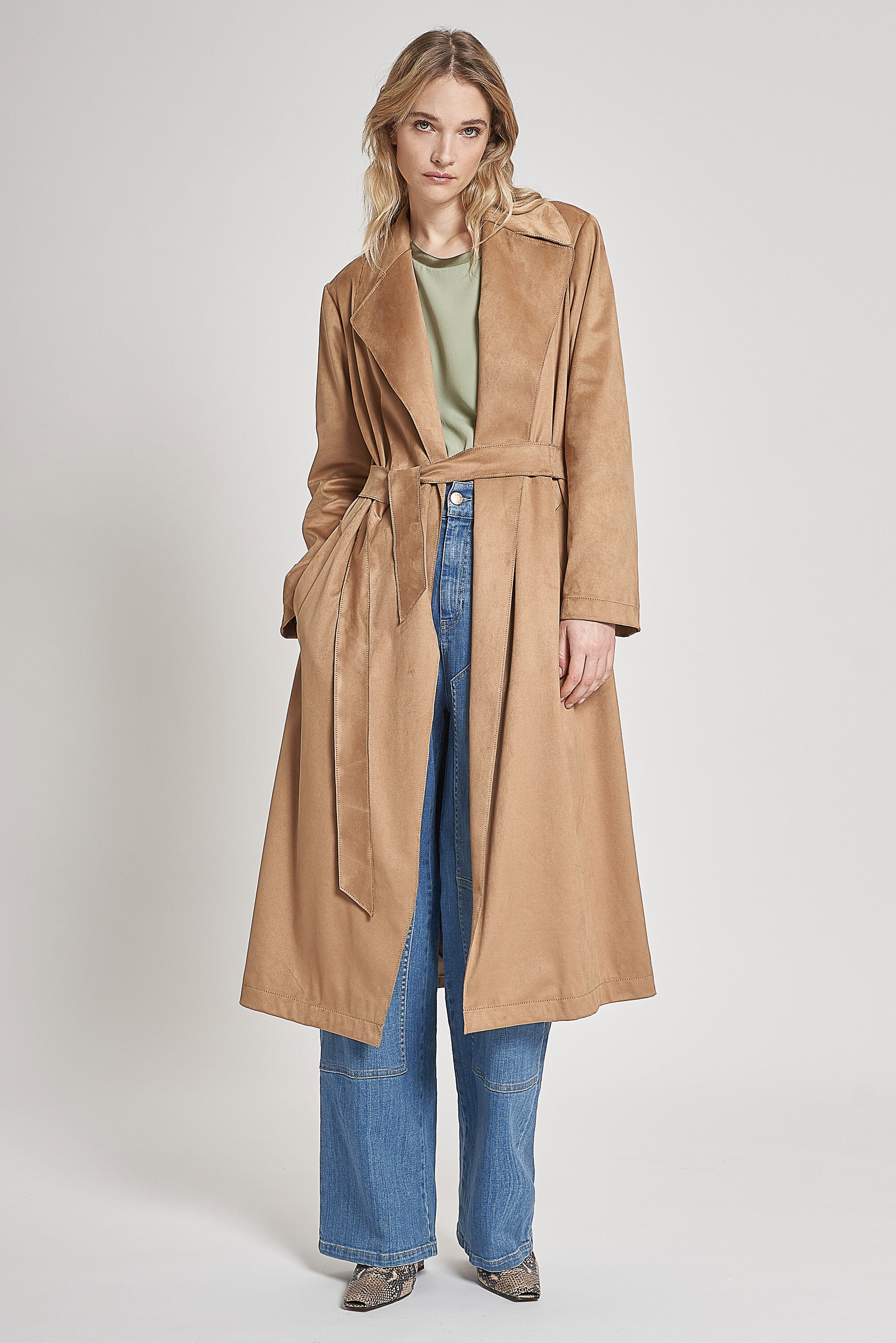 Trench lungo foderato in eco camoscio. Ampio scollo a vela, passanti in vita e cintura a nastro. Tasche a filetto nei fianchi. Lunghezza sotto al ginocchio.