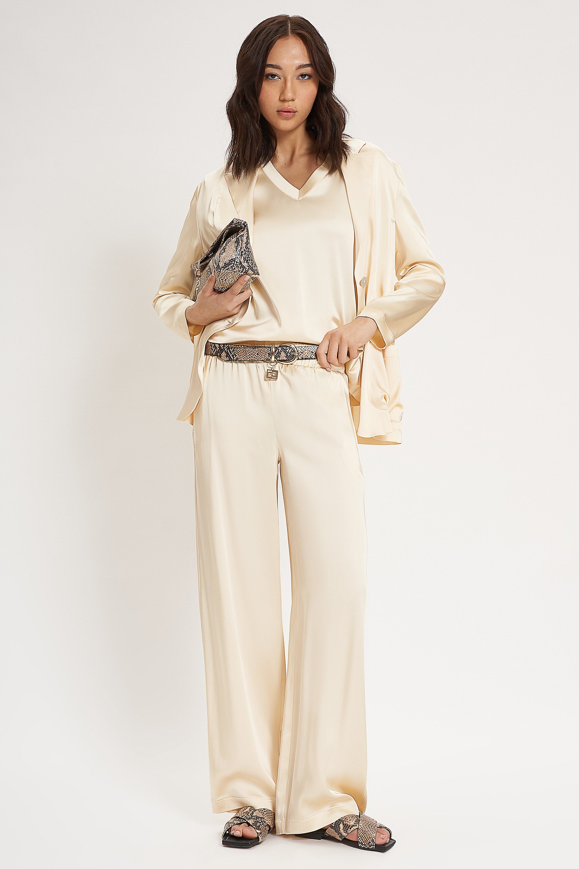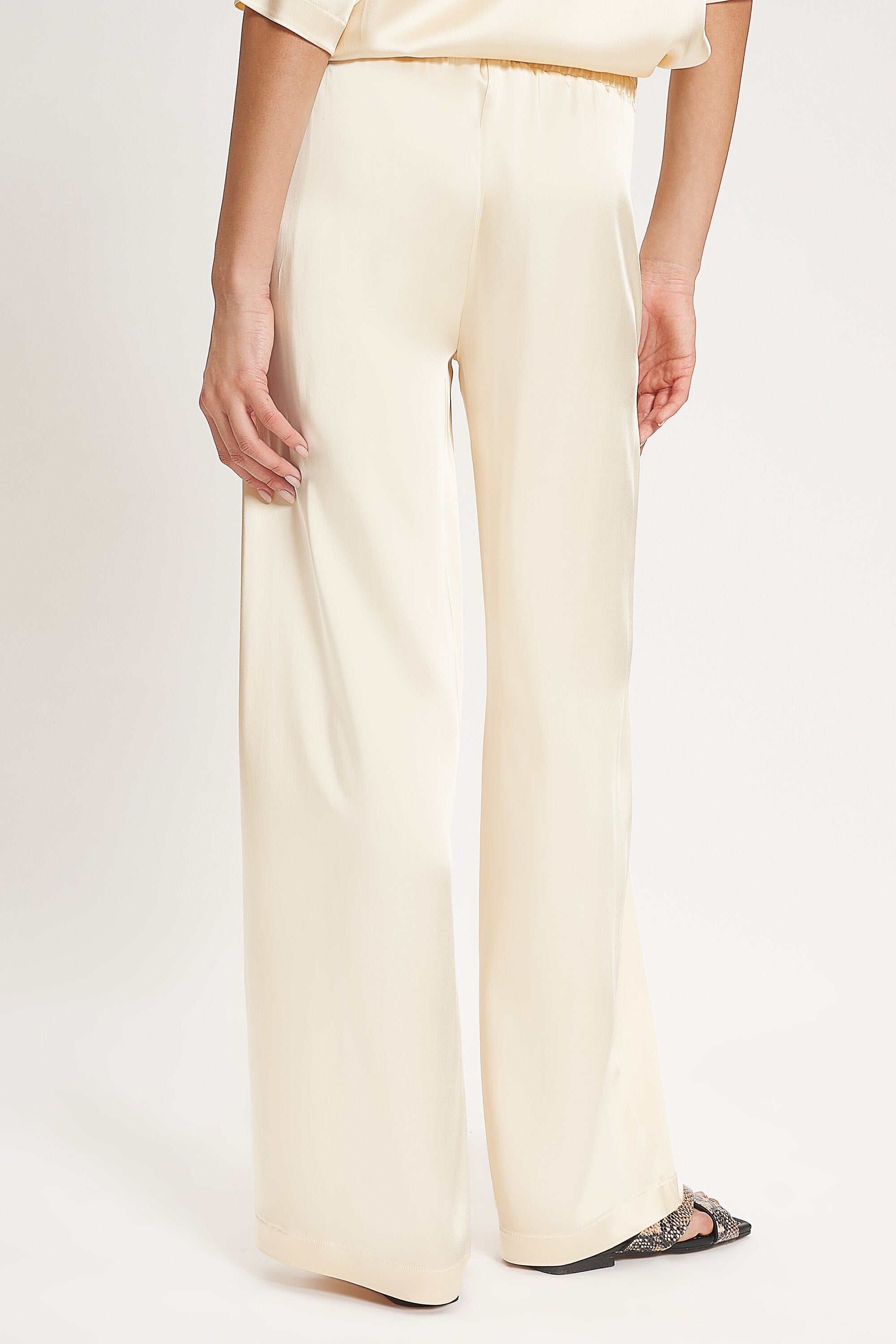 Pantaloni larghi in raso con vita regolare e cavallo basso. Fascione elastico ed entrate tasche l...Learn more
