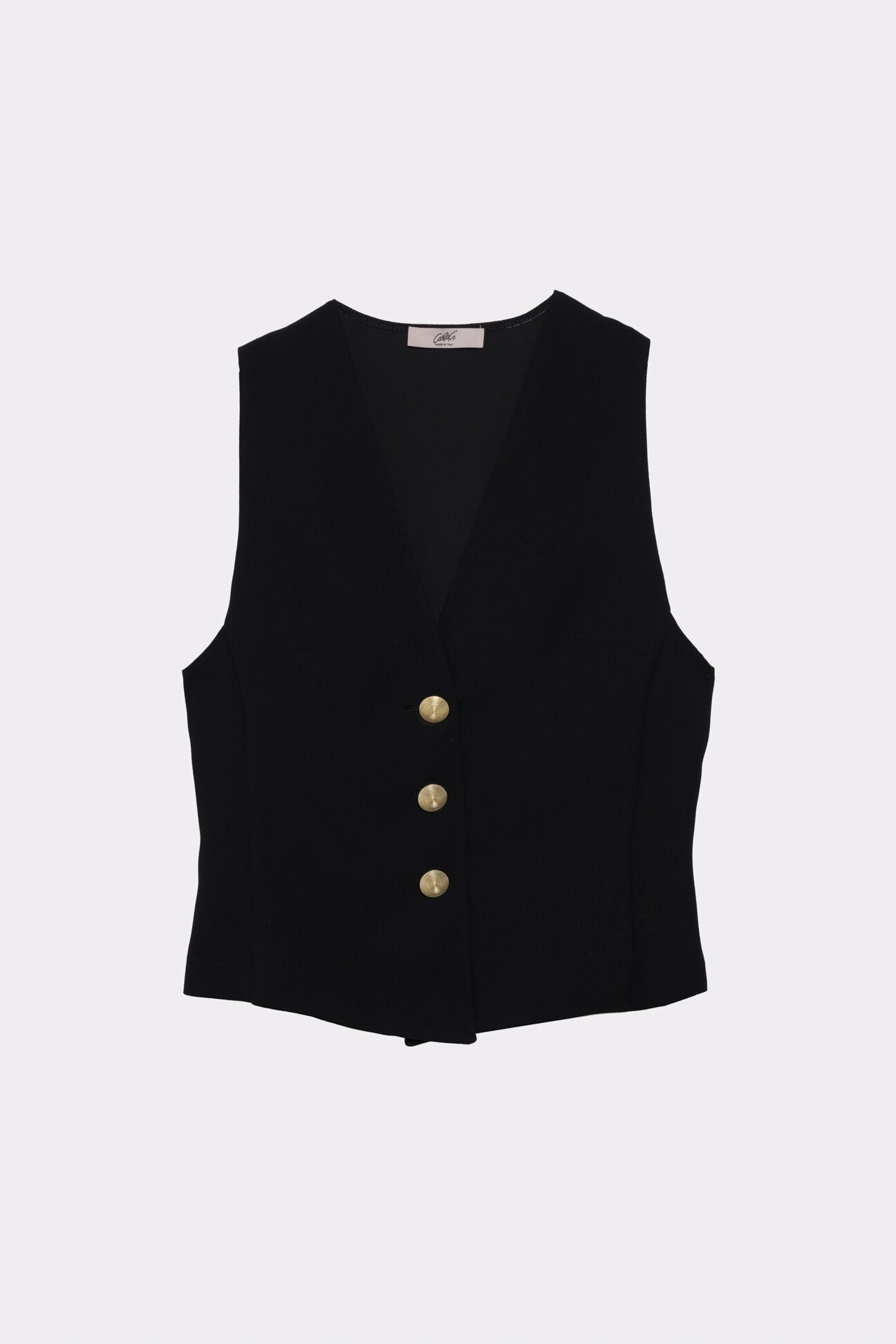 Gilet in crepe satin con scollo senza revers e allacciatura monopetto, con tre bottoni metallici. Lunghezza sopra i fianchi. Capo foderato.