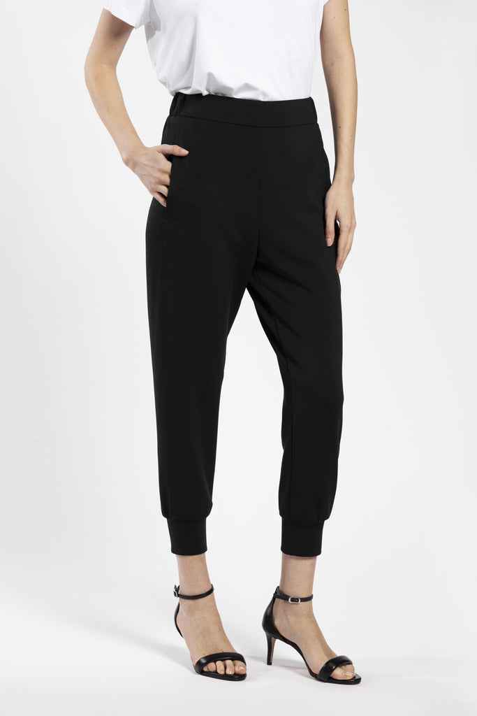 Pantalone in jersey elasticizzato con vita regolare elasticizzata sui fianchi e dietro. Vita bassa, tasche laterali, con fondo con polsini.