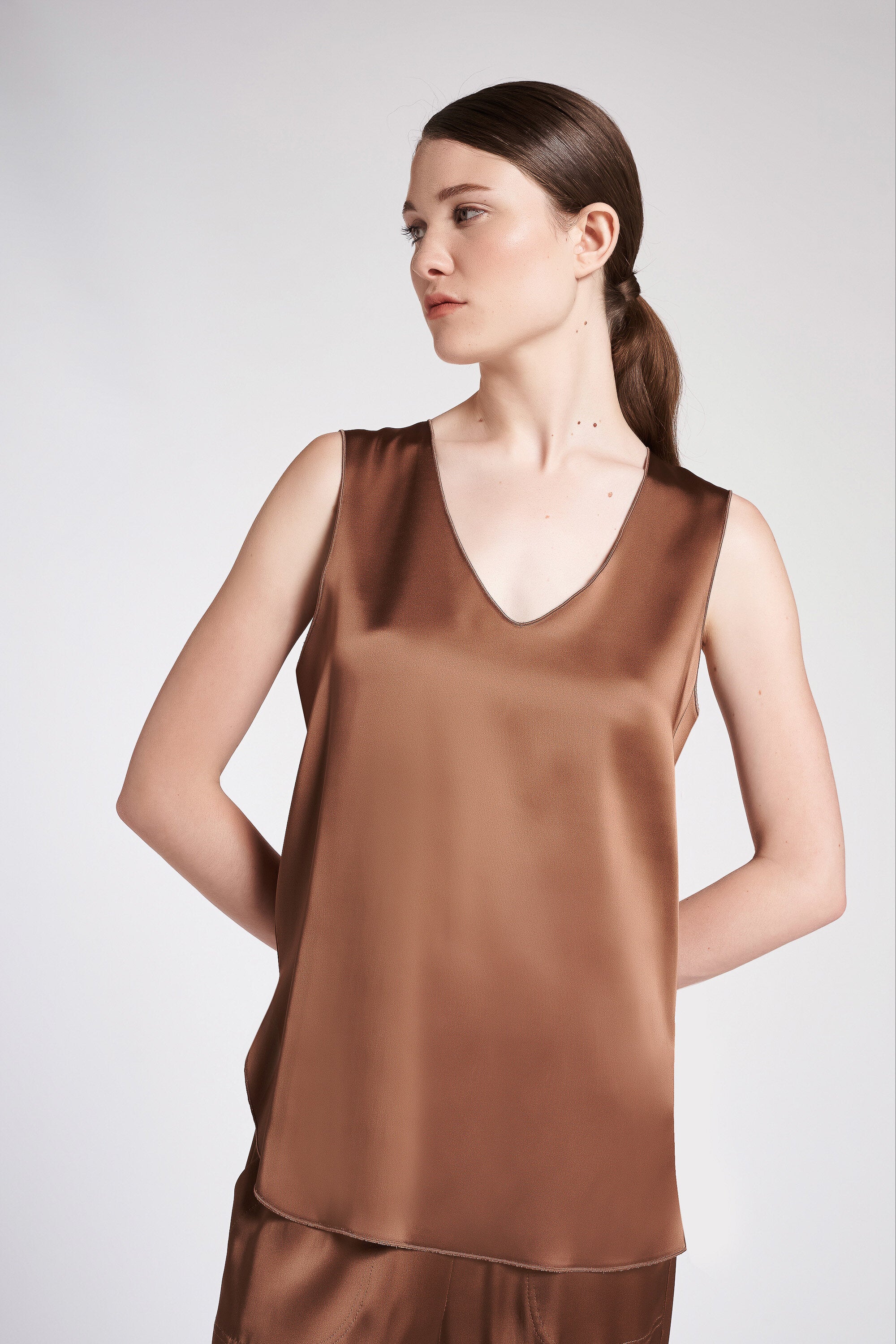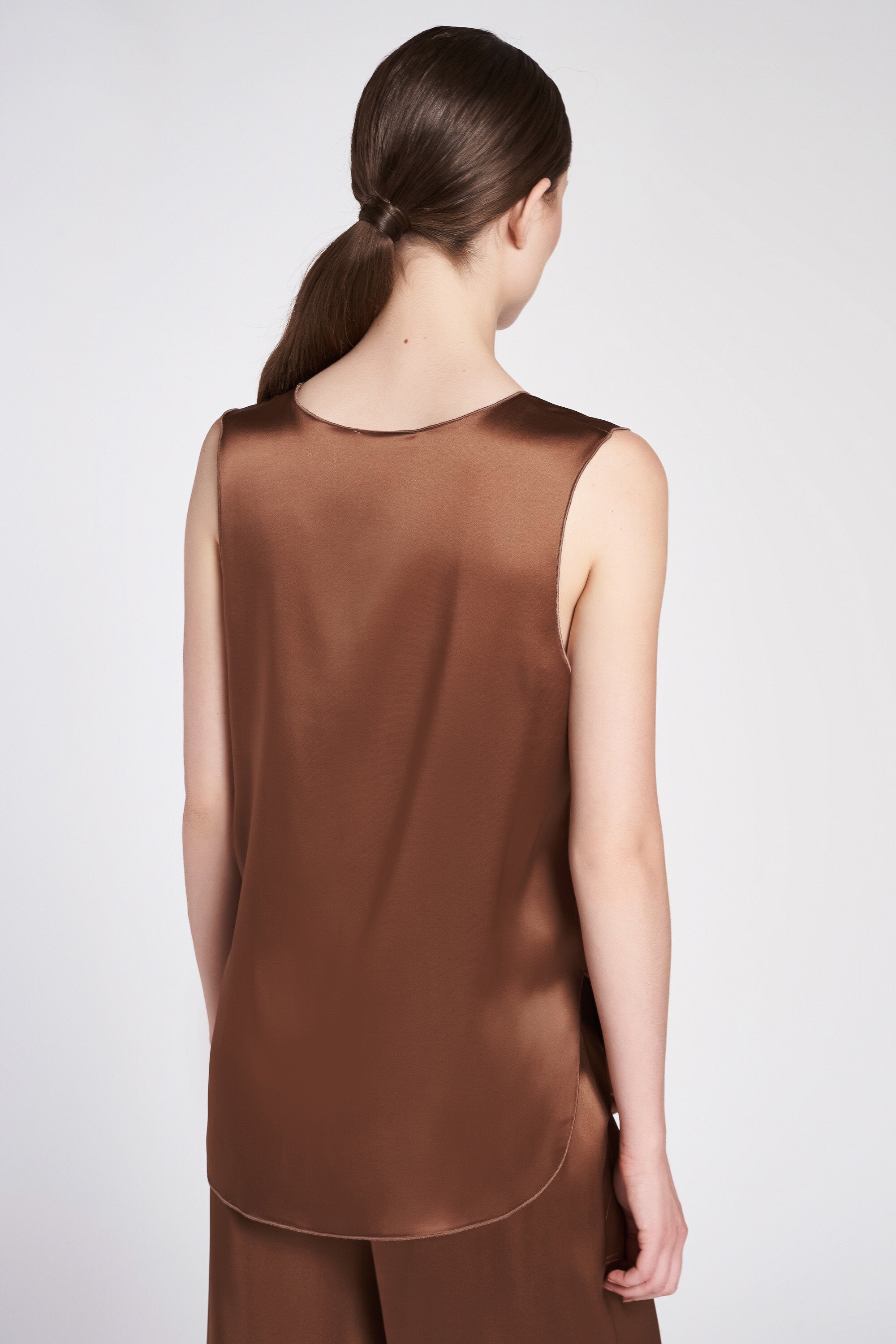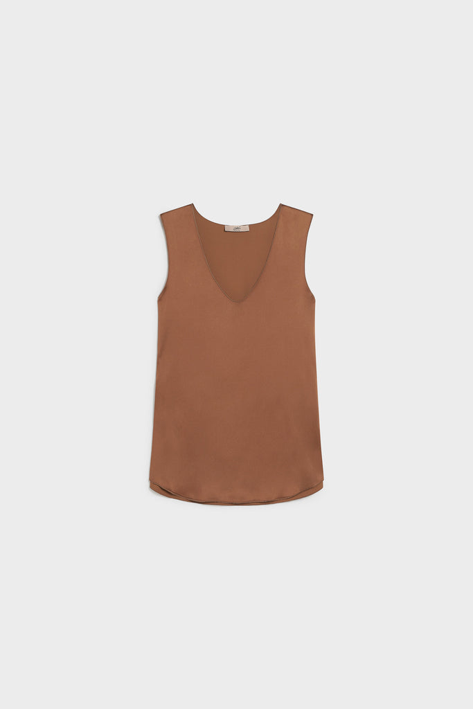 Maglia smanicata in raso elasticizzato con scollo a v e spacchetti laterali. Lunghezza sotto i fianchi.