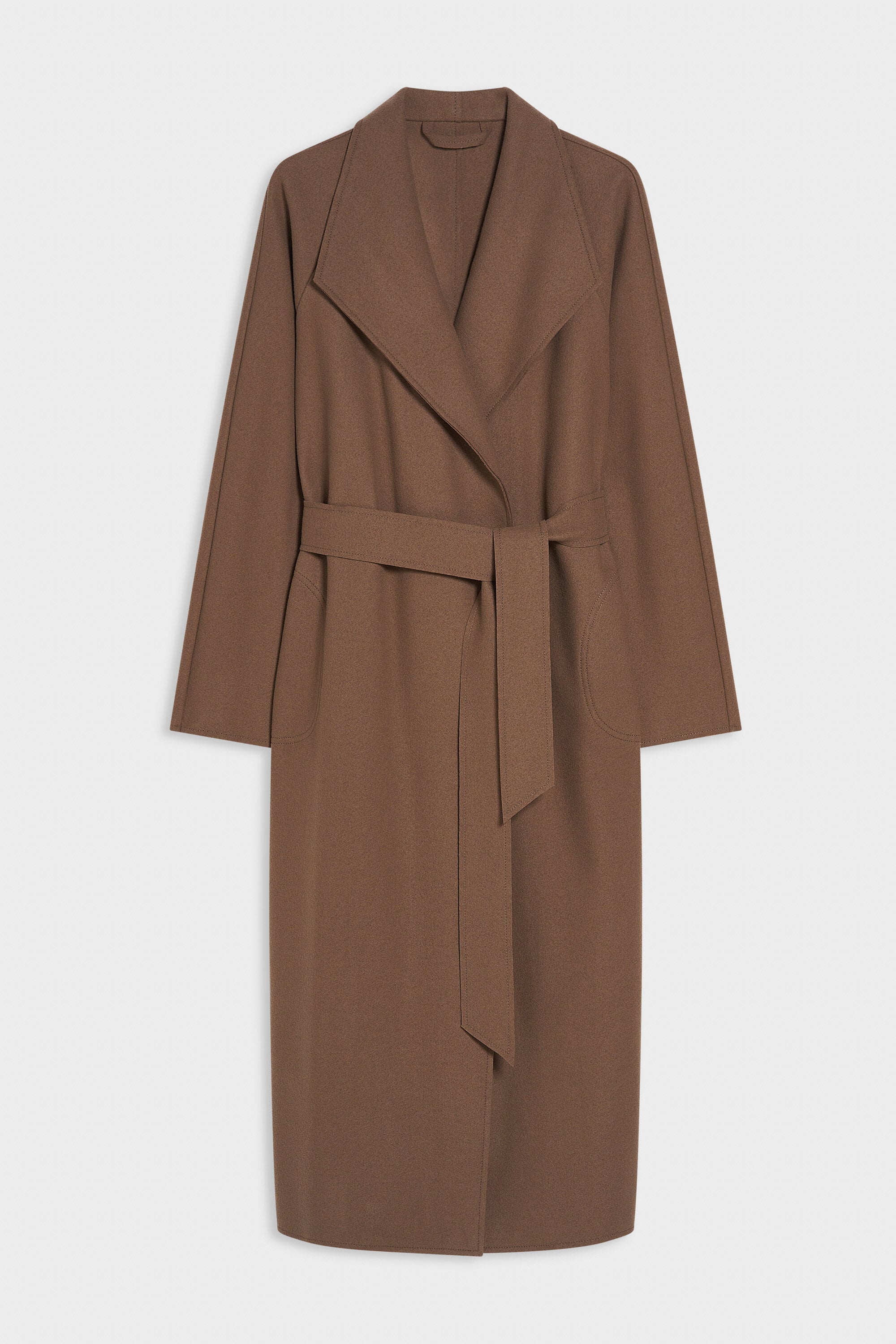 Cappotto lungo sfoderato in lana mouflon. Ampio scollo a vela, passanti in vita e cintura a nastr...Learn more