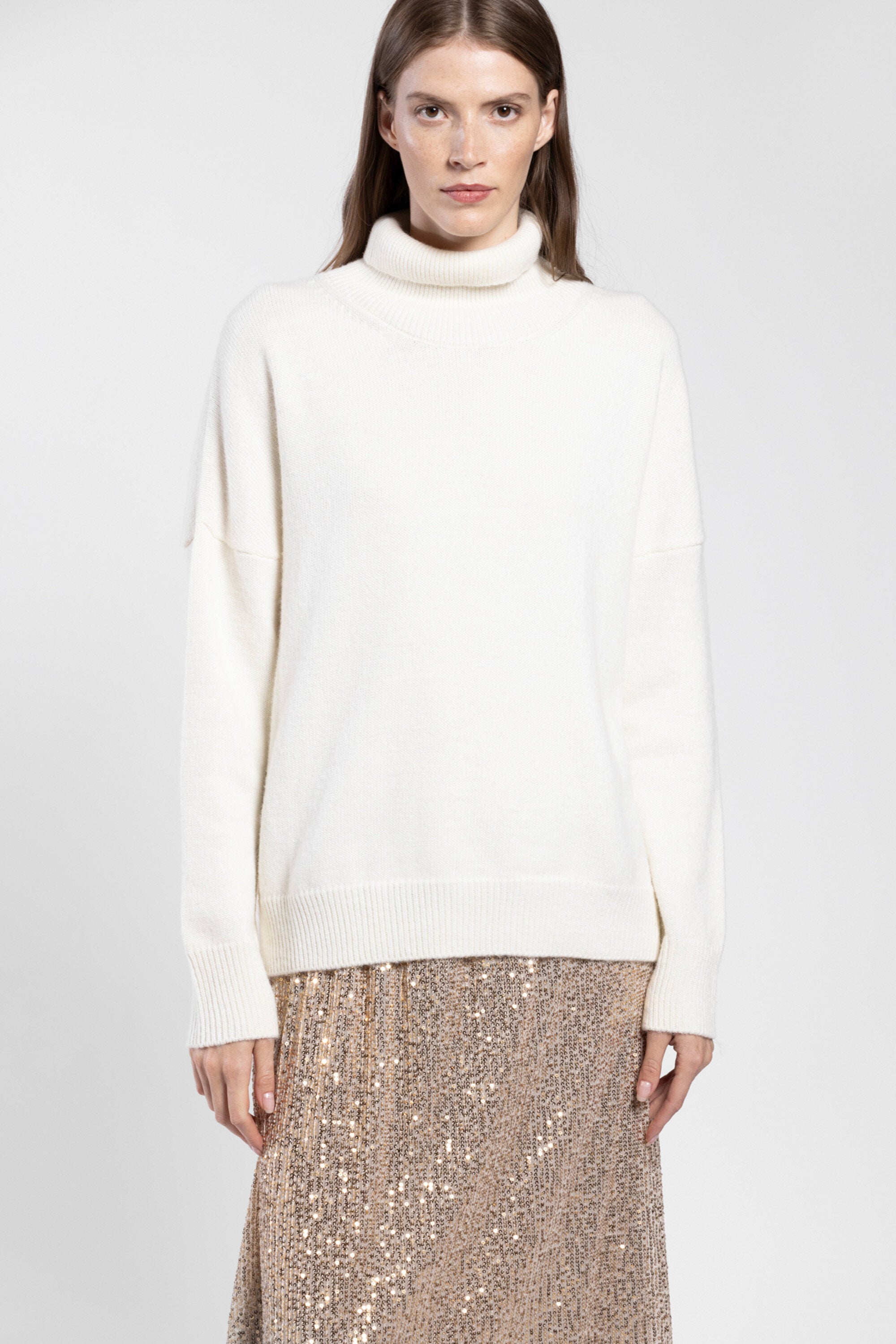 Maglia a collo alto in lana grossa. Bordi a coste. Lunghezza ai fianchi.