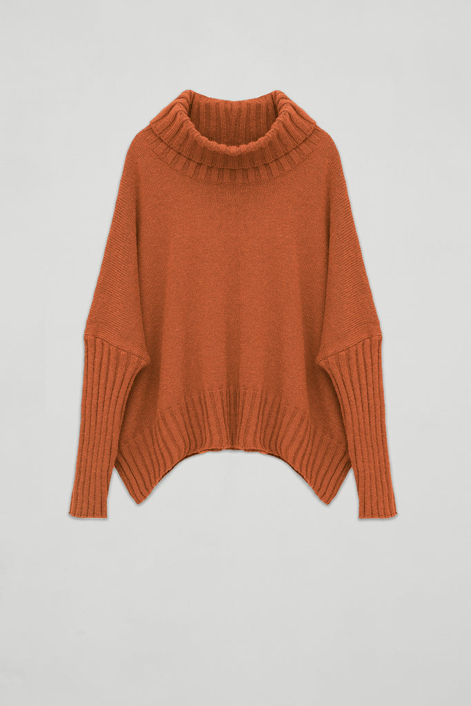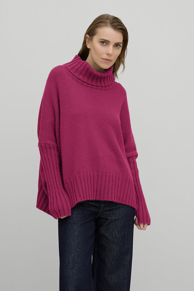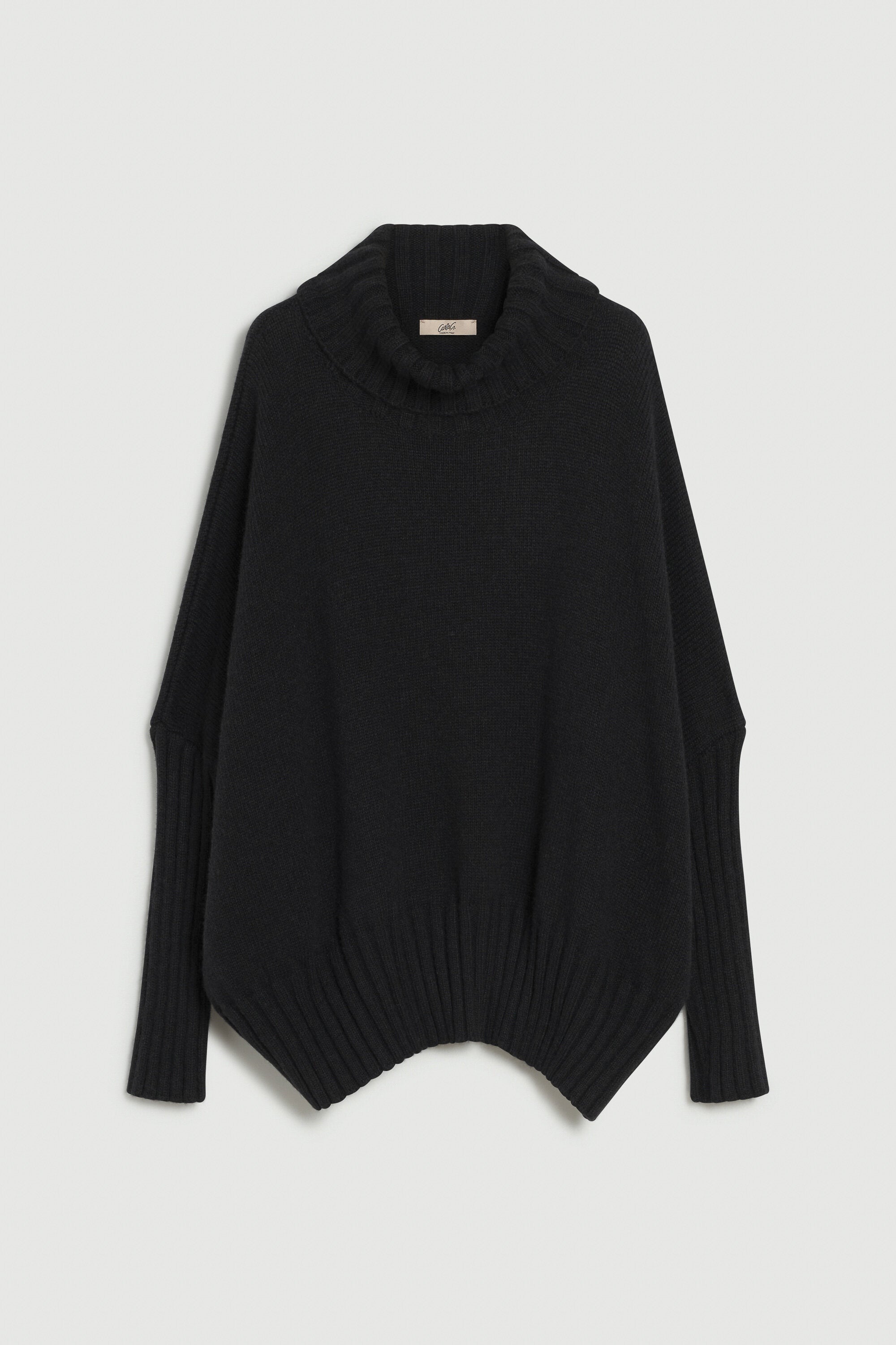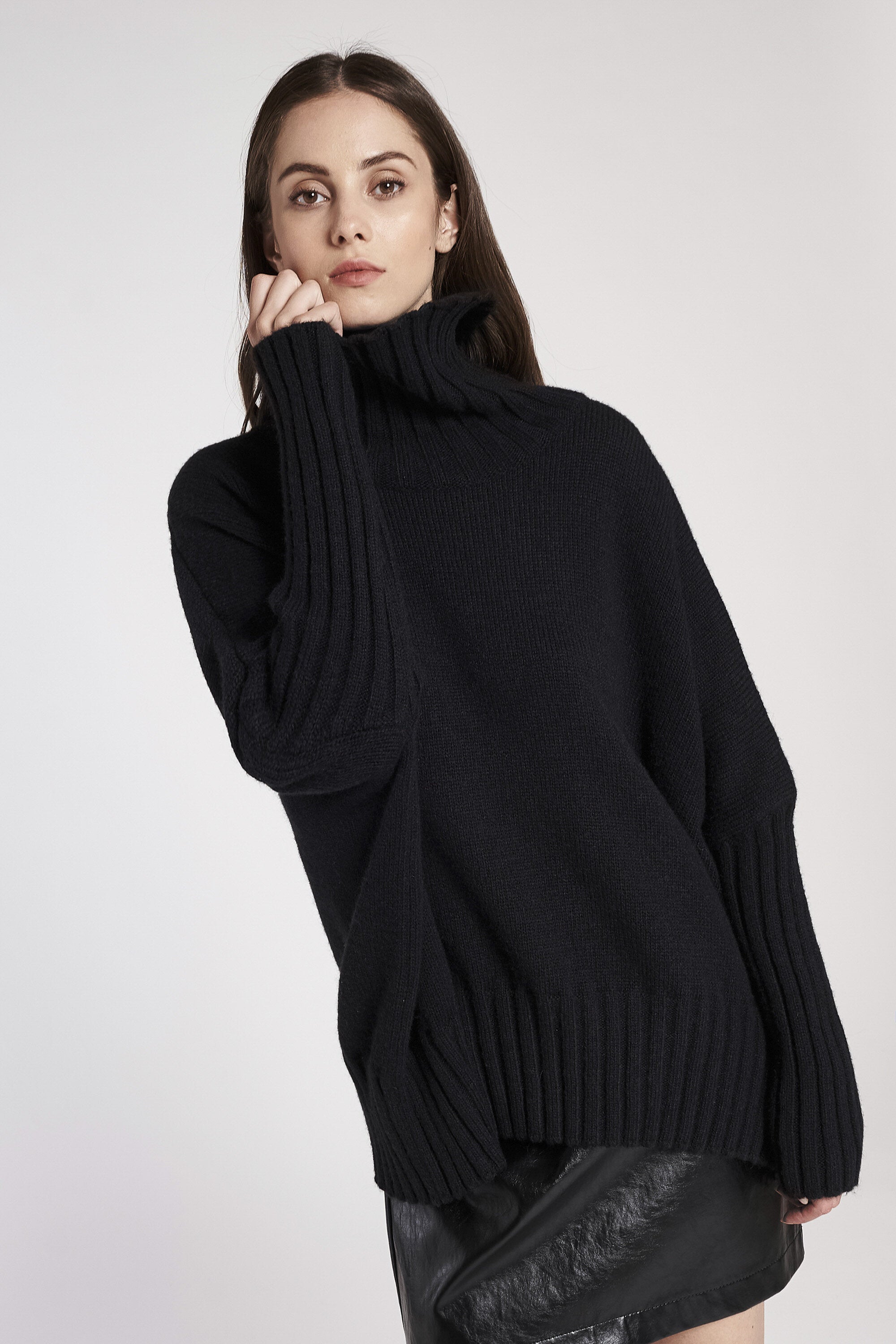 Maglia a collo alto in lana grossa. Maniche e fondo lavorati a coste. Giro manica sceso. Linea ampia. Lunghezza ai fianchi.