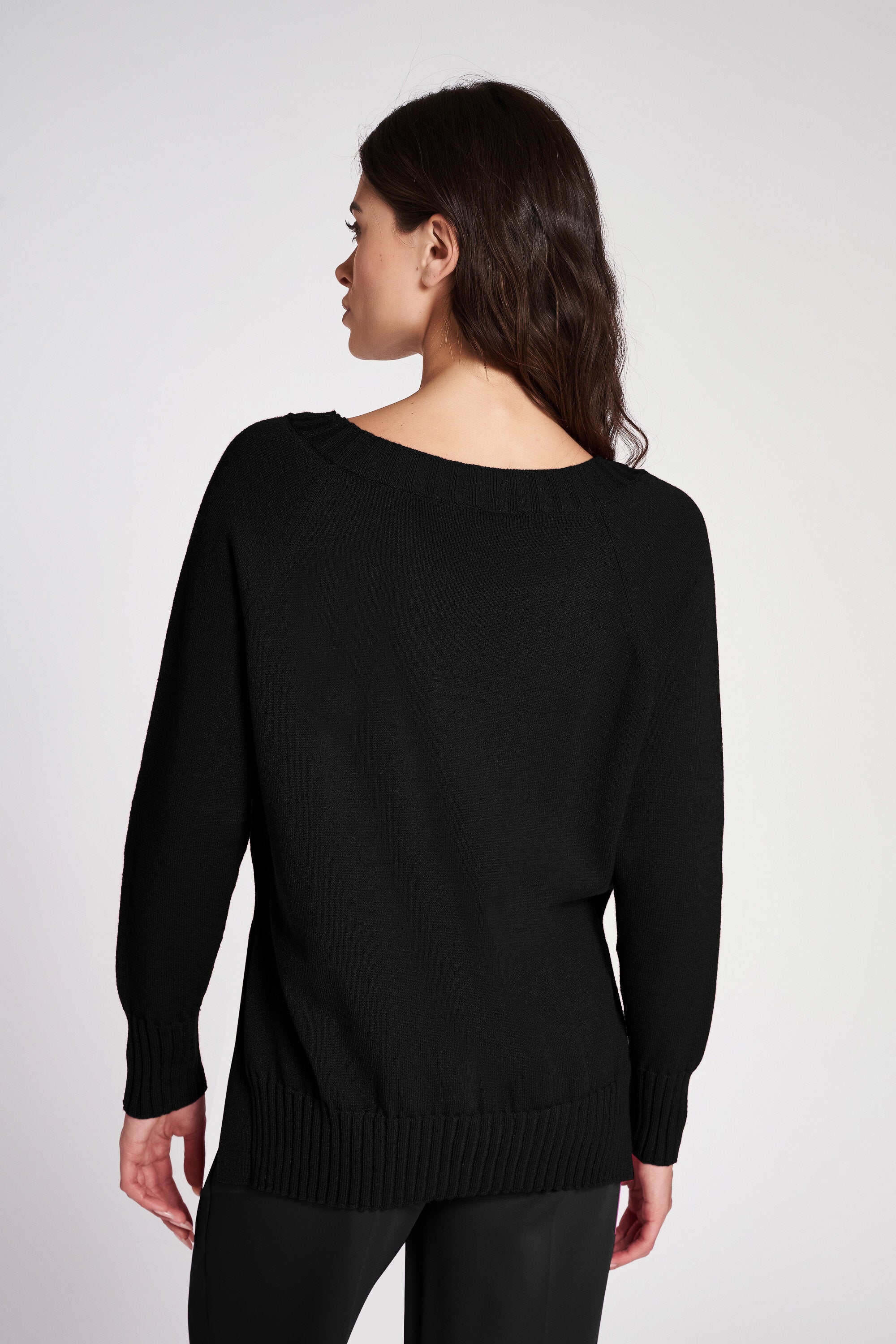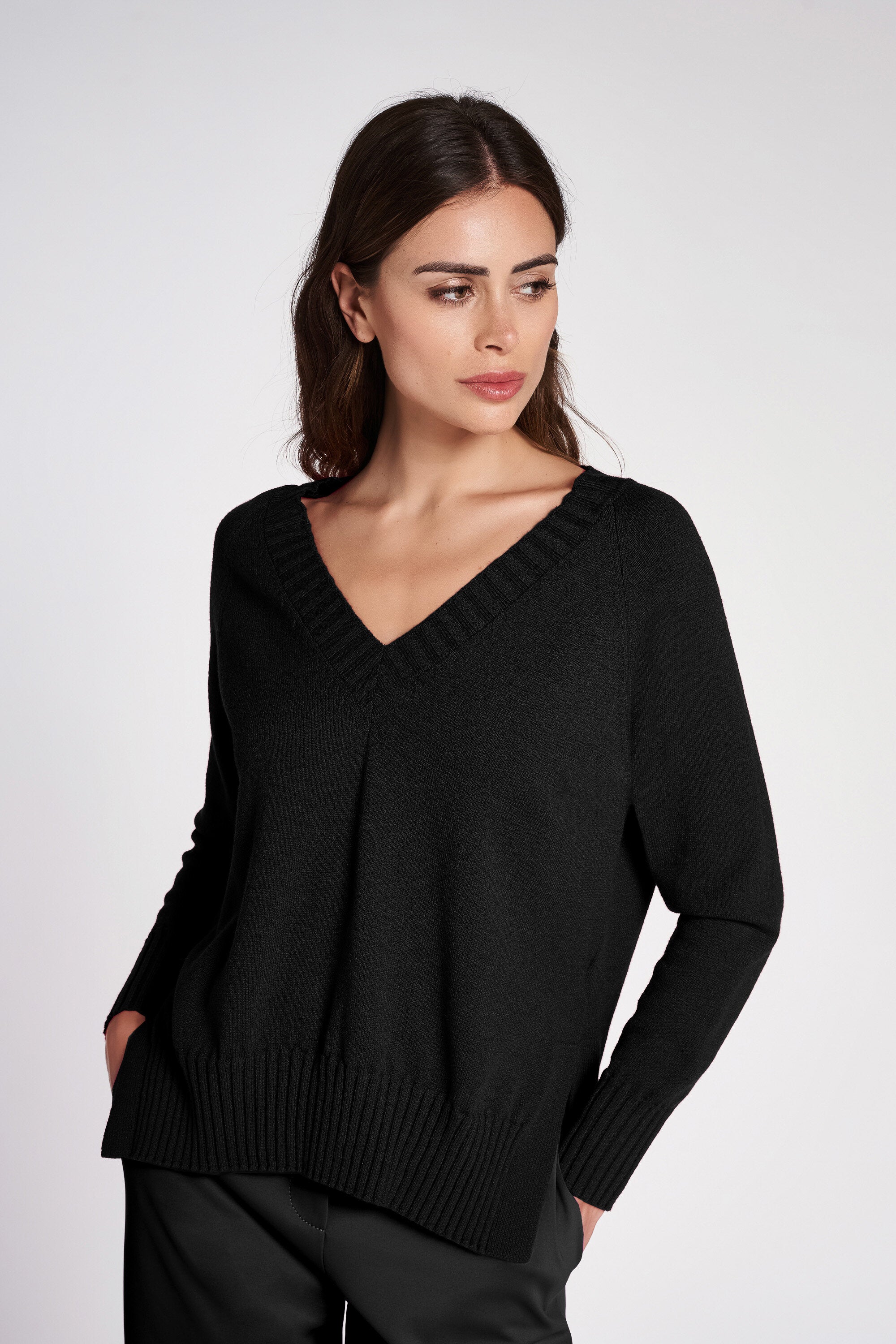 Maglia asimmetrica con ampio scollo a V in viscosa elasticizzata. Fondo, polsi e scollo a coste. Linea morbida, lunghezza sotto i fianchi.