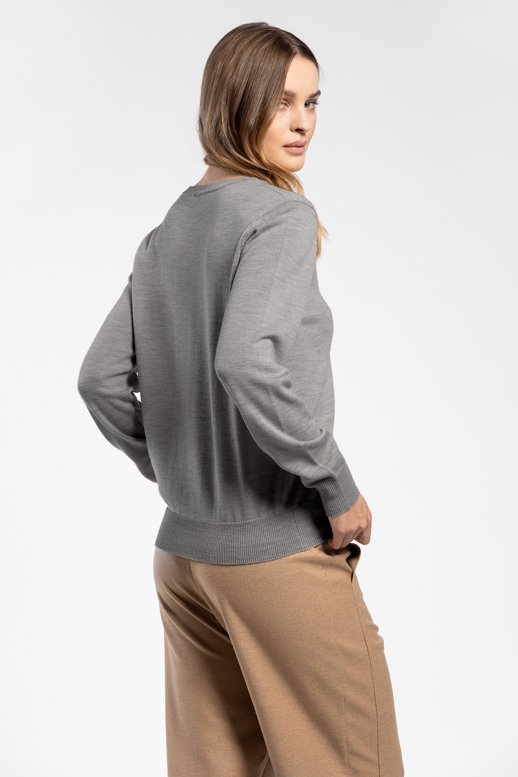 Maglia girocollo in lana merinos a maniche lunghe. Fondo, polsini e scollo con lavorazione a coste. Linea morbida, lunghezza sopra i fianchi.