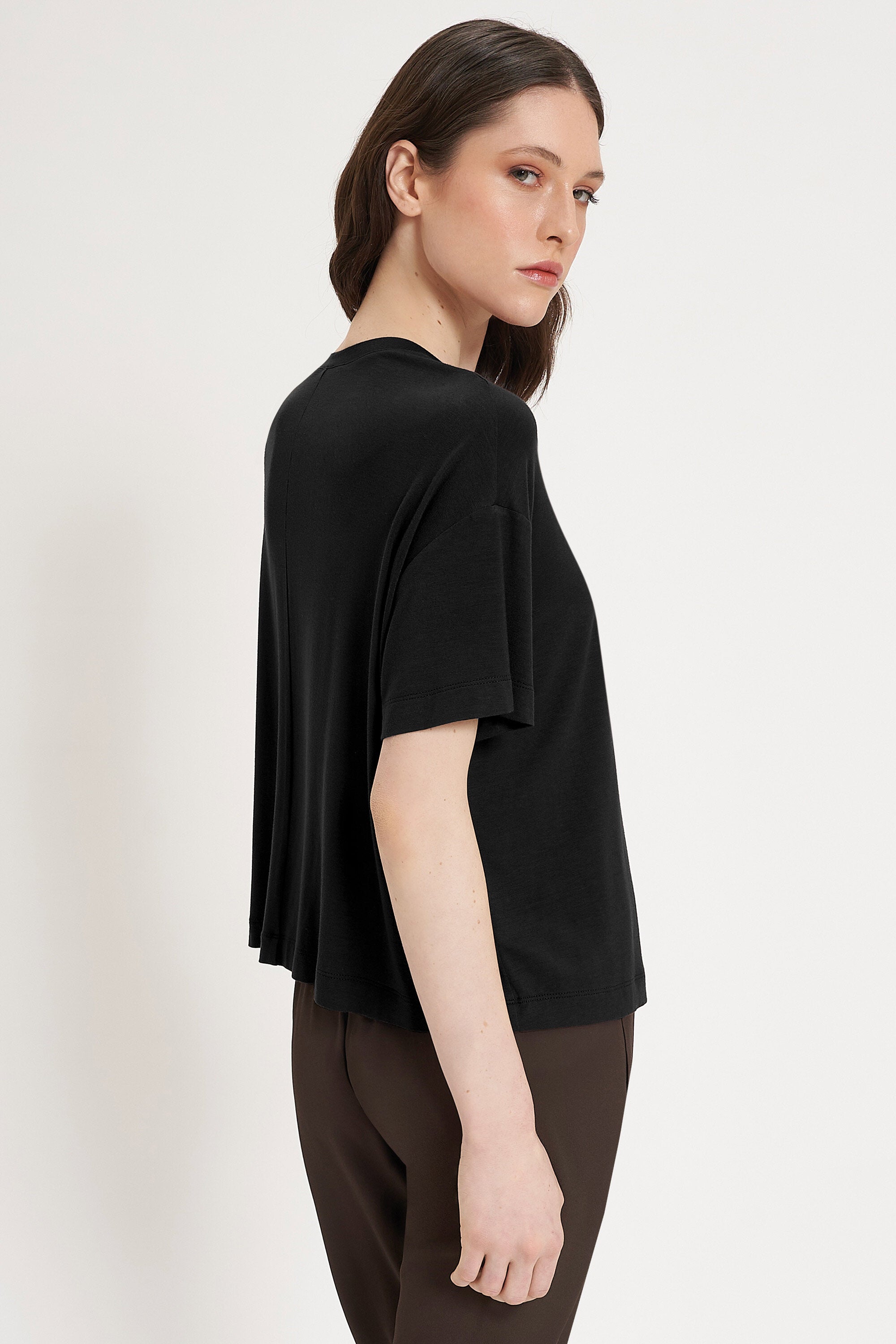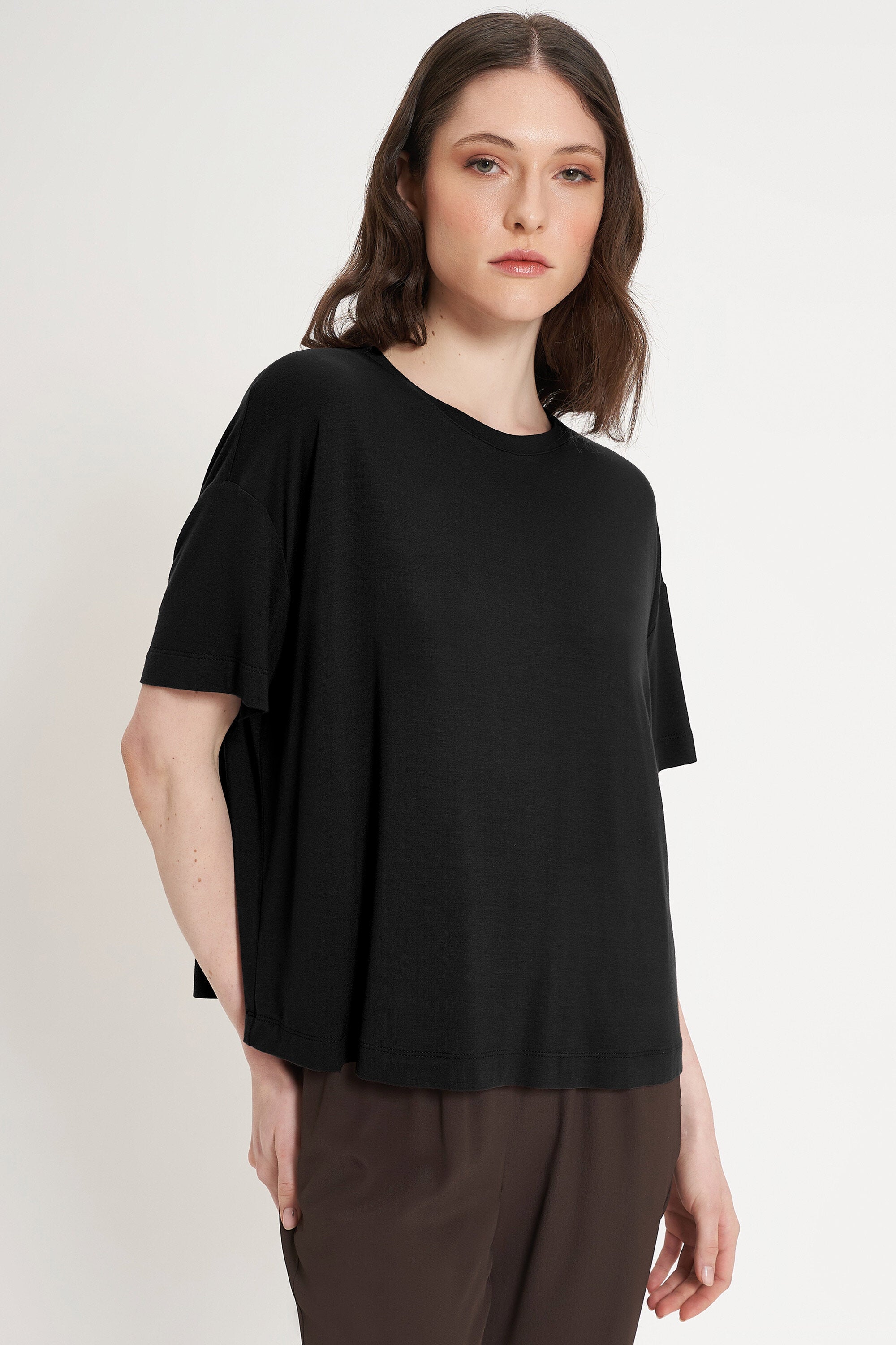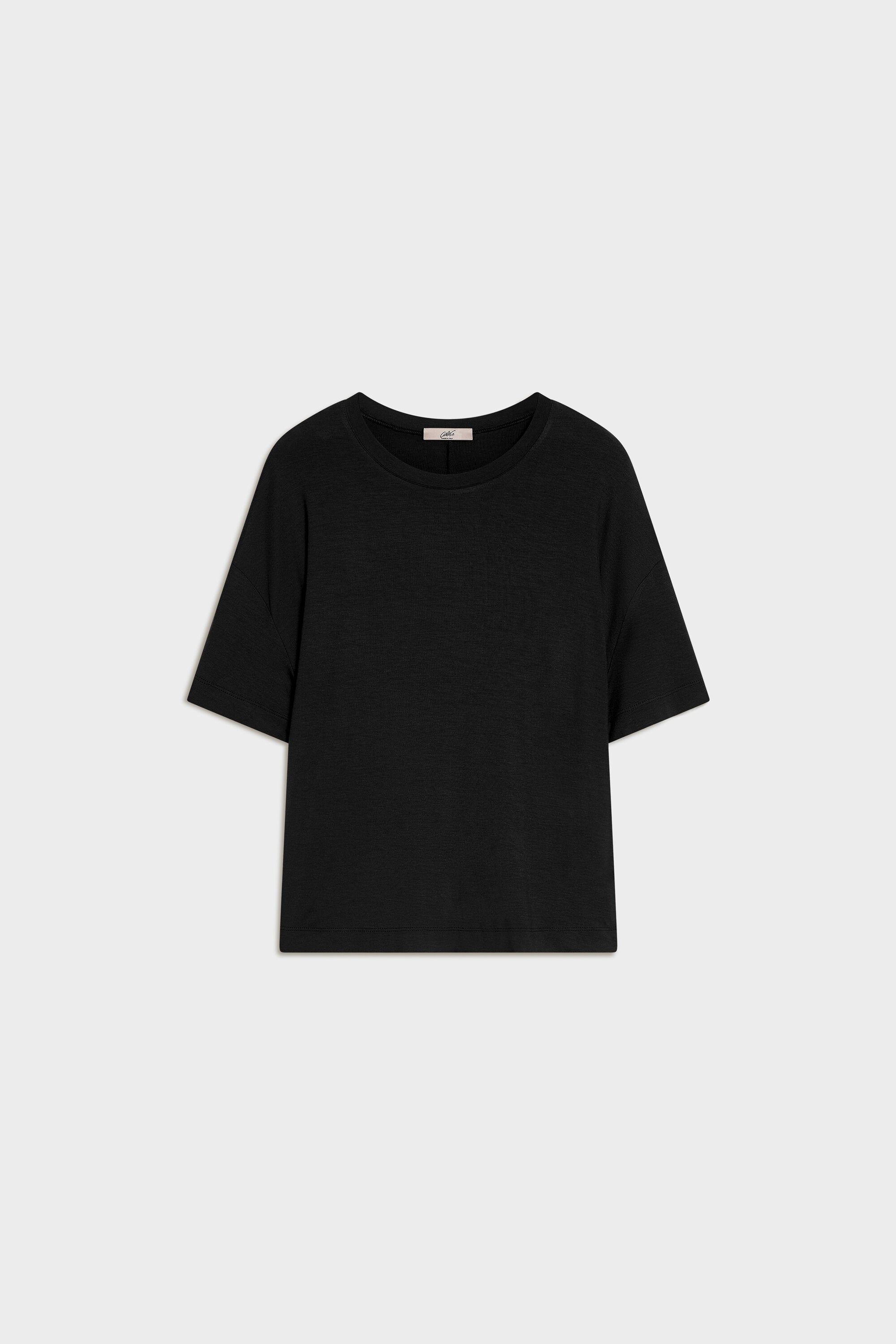 Maglia over a mezza maniche in jersey di viscosa. Scollo rotondo. Lunghezza ai fianchi.