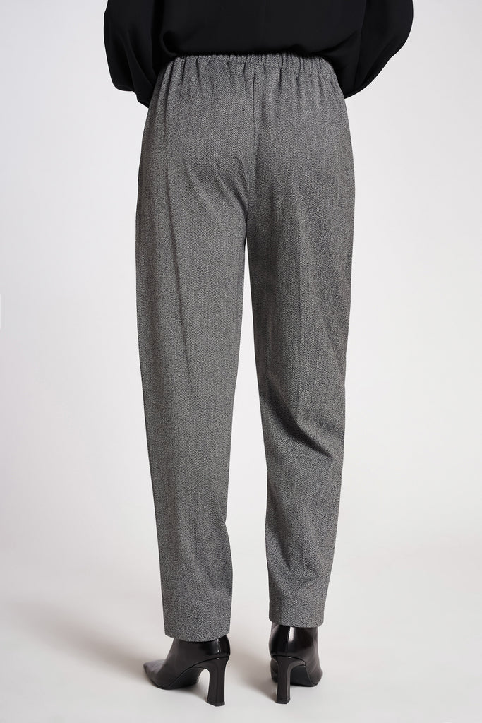 Pantaloni ampi in tinto filo elasticizzato con vita regolare e cavallo basso. Vita davanti con passanti e finta apertura, fascione dietro con elastico. Entrata tasche laterali e piega stirata.