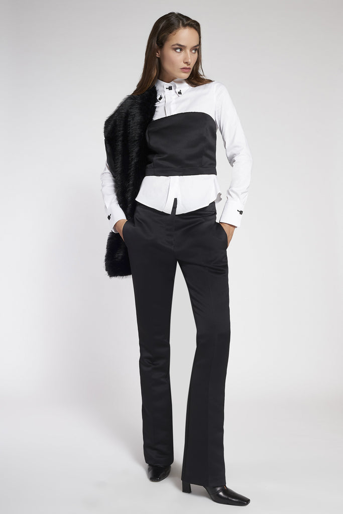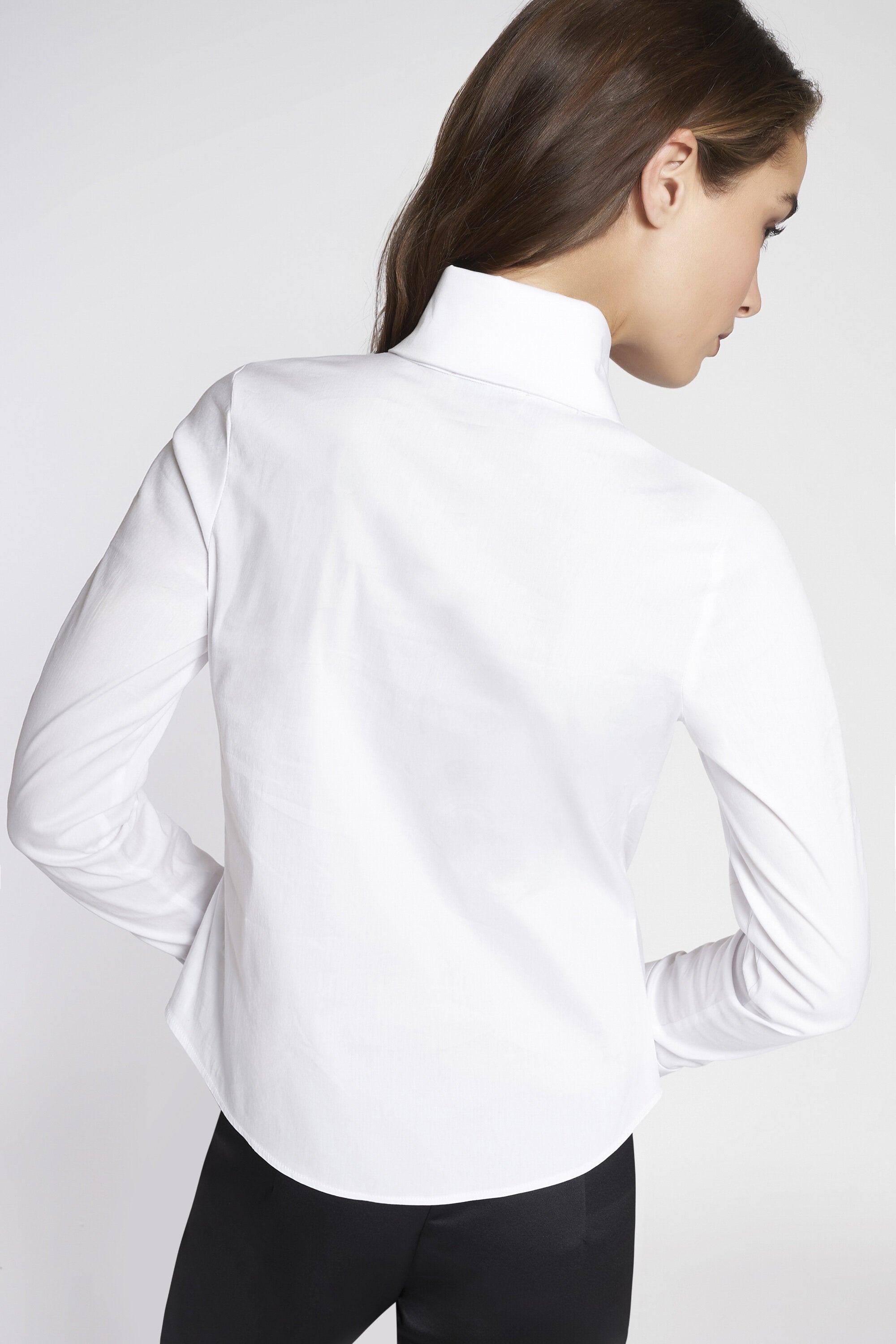 Camicia a maniche lunghe in popeline elasticizzato. Colletto, polsini e chiusura impreziositi da bottoni gioiello. Lunghezza ai fianchi.