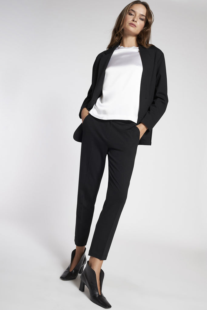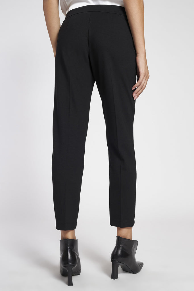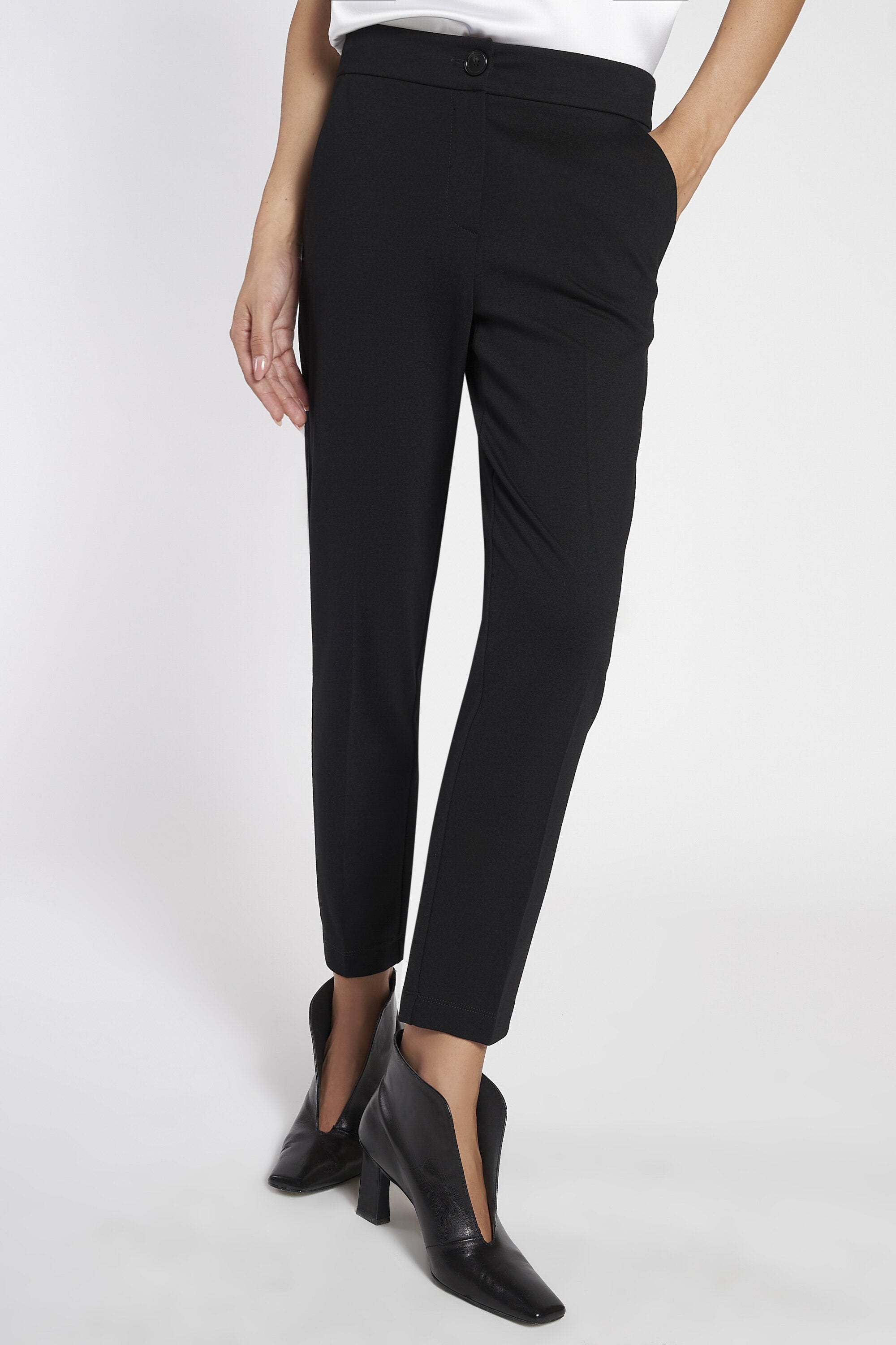 Pantalone a sigaretta in maglia stoffa elasticizzata con vita regolare. Apertura con lampo e bottone in eco-corno. Tasche alla francese. Vestibilità aderente.