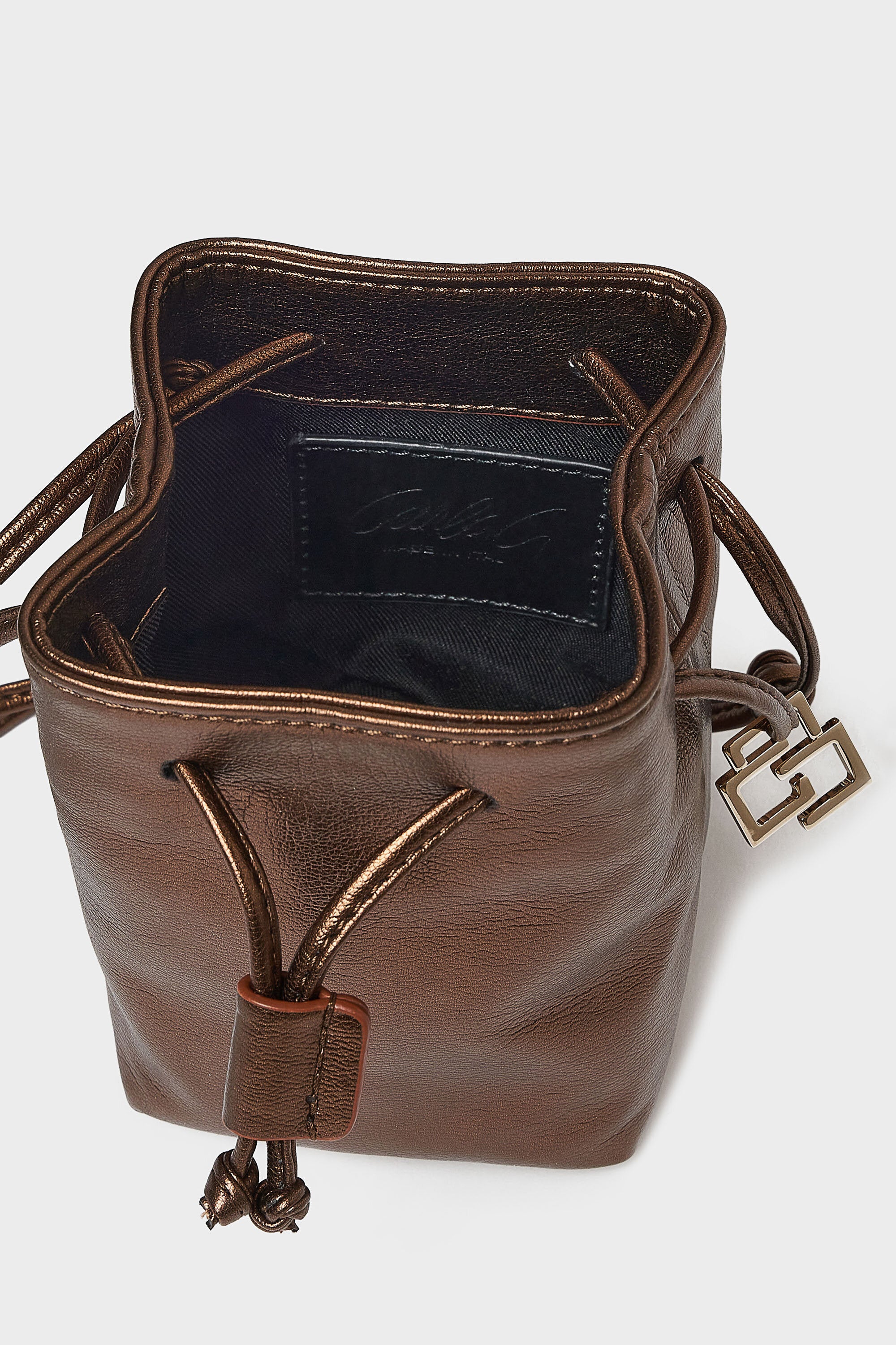 Mini bag a sacchetto in ecopelle satinata. Chiusura con coulisse regolabile e doppia tracolla con logo CG pendente. Dimensioni: Lunghezza 9 cm, Altezza14 cm, Profondità 9 cm.