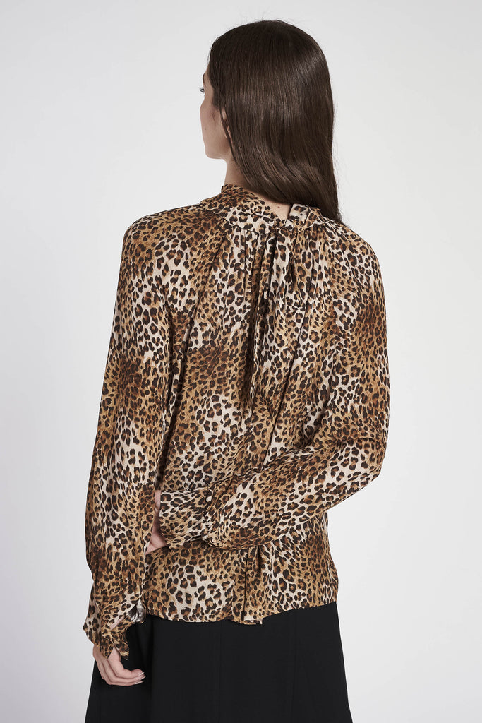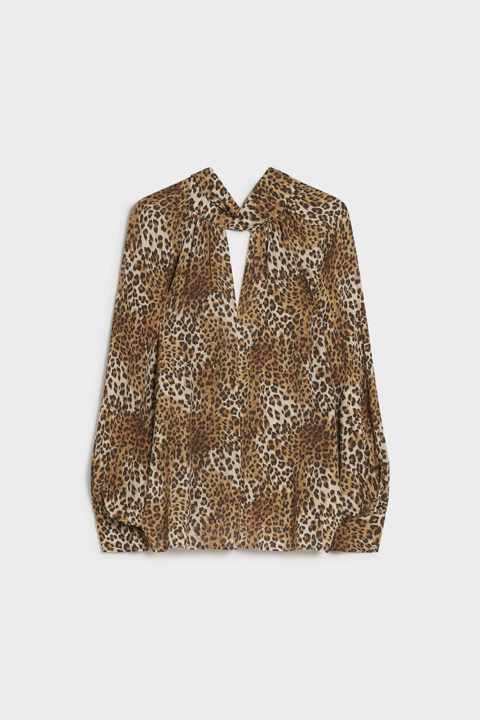 Camicia in viscosa stampa leoprint con collo alto incrociato che diventa nastro da annodare dietr...Learn more