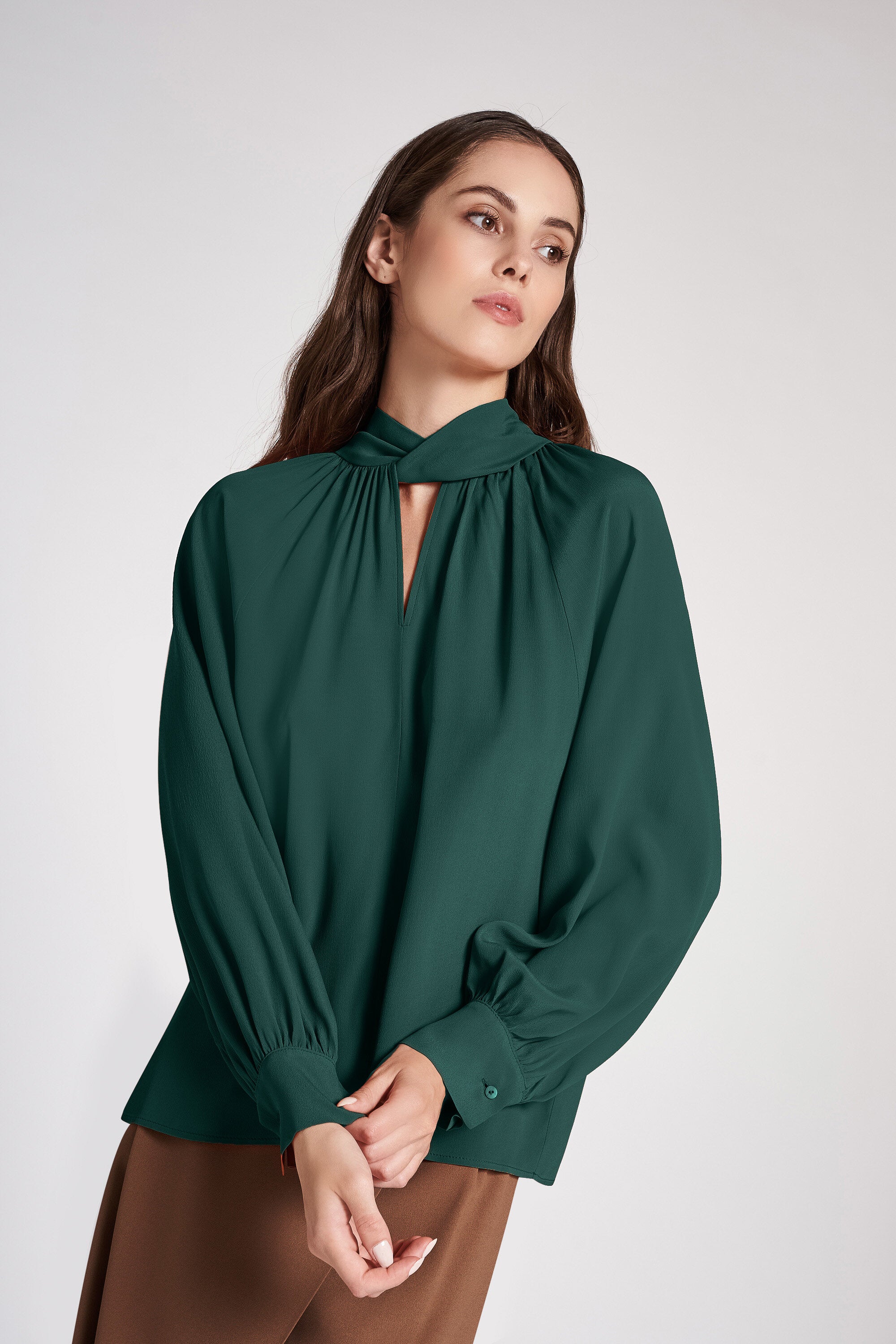 Camicia in crepe de chine con scollo a nodo che diventa nastro da annodare dietro. Maniche ampie con polsini chiusi da bottoni in madreperla. Lunghezza ai fianchi.