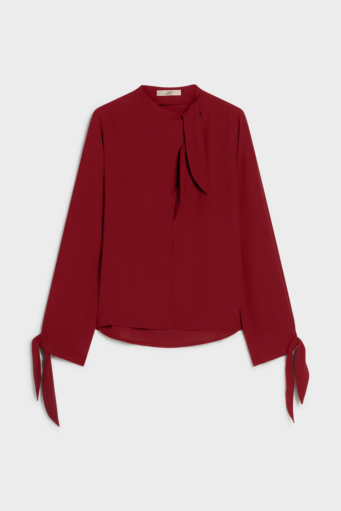 Maglia asimmetrica a maniche lunghe in crepe con collo e polsi da annodare. Cut out nella manica. lunghezza sotto i fianchi.