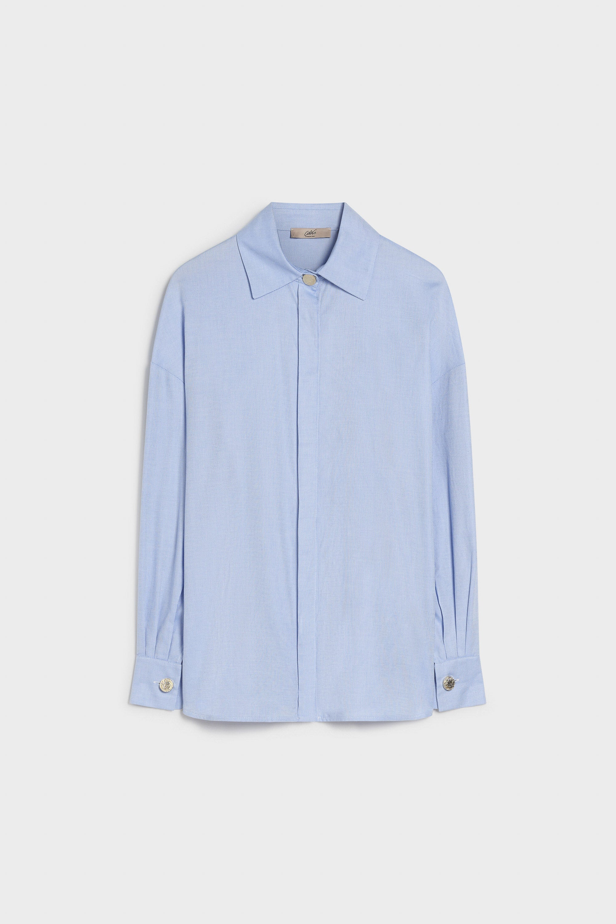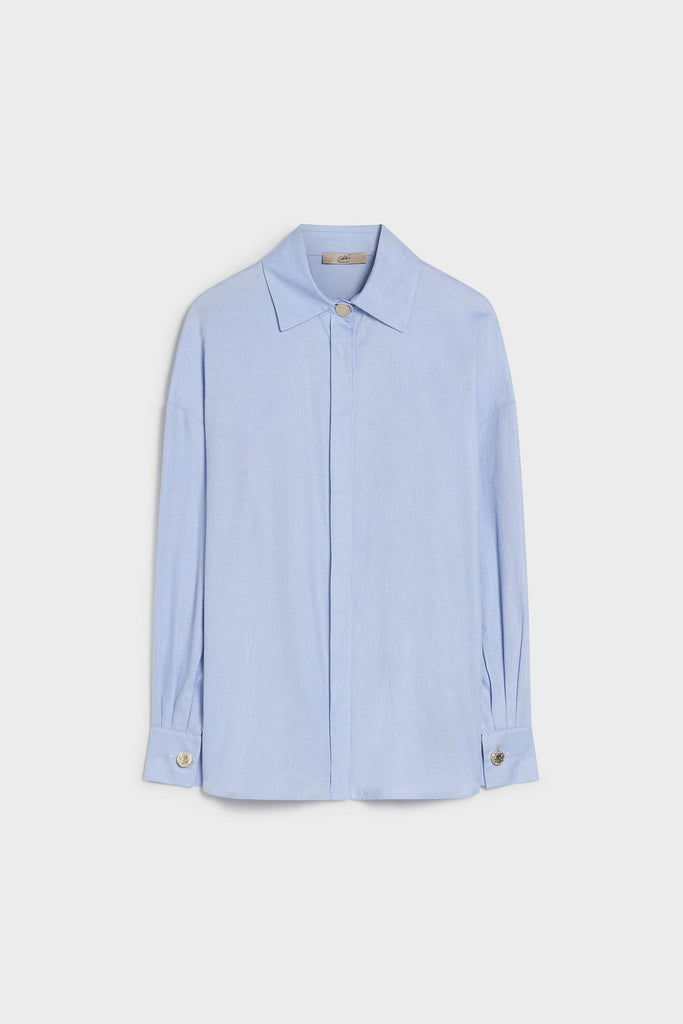 Camicia a maniche lunghe in tessuto di cotone oxford. Colletto classico e polsini con allacciatura con bottone in metallo effetto trama e allacciatura frontale con bottoni in madreperla opaca. Maniche ampie com riprese. Lunghezza ai fianchi.