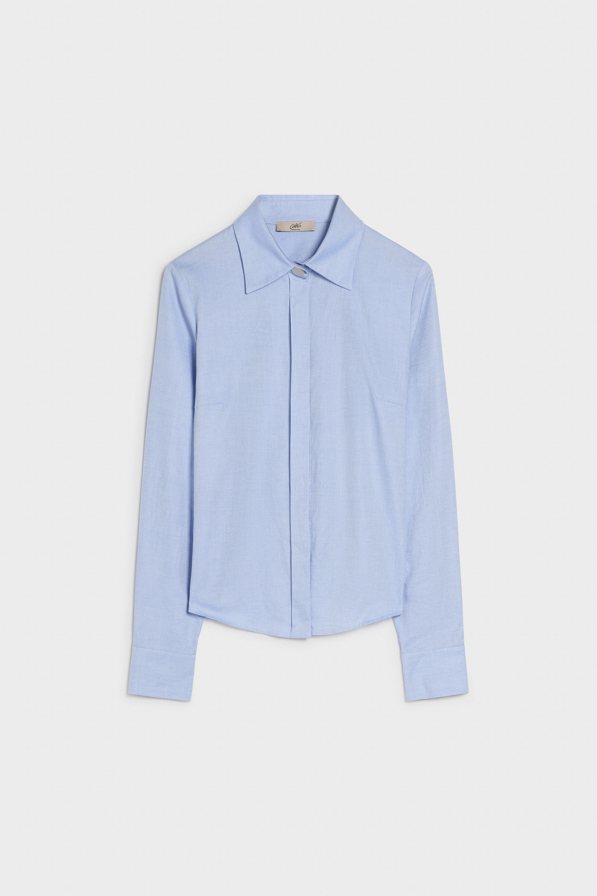 Camicia a maniche lunghe in tessuto di cotone oxford. Colletto classico e polsini con allacciatura con bottone in metallo effetto trama e allacciatura frontale con bottoni in madreperla opaca. Lunghezza ai fianchi.