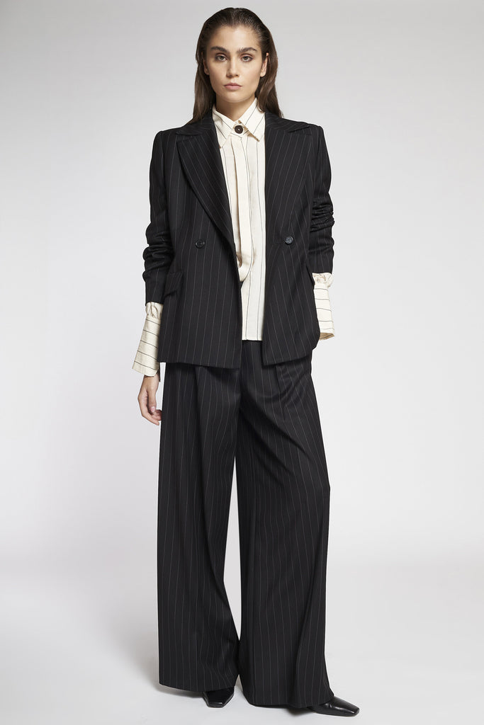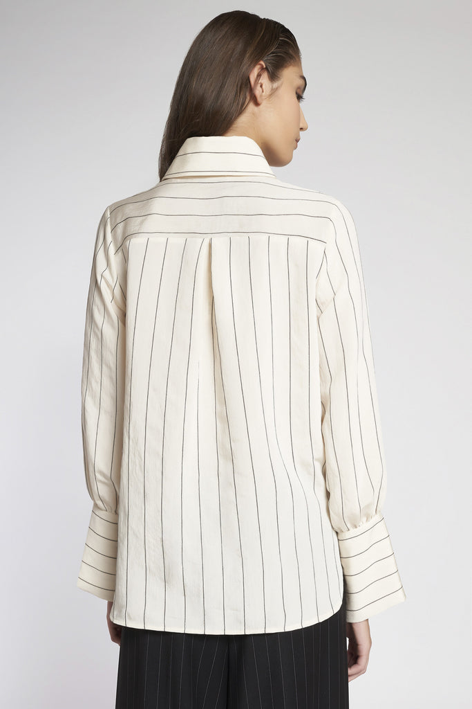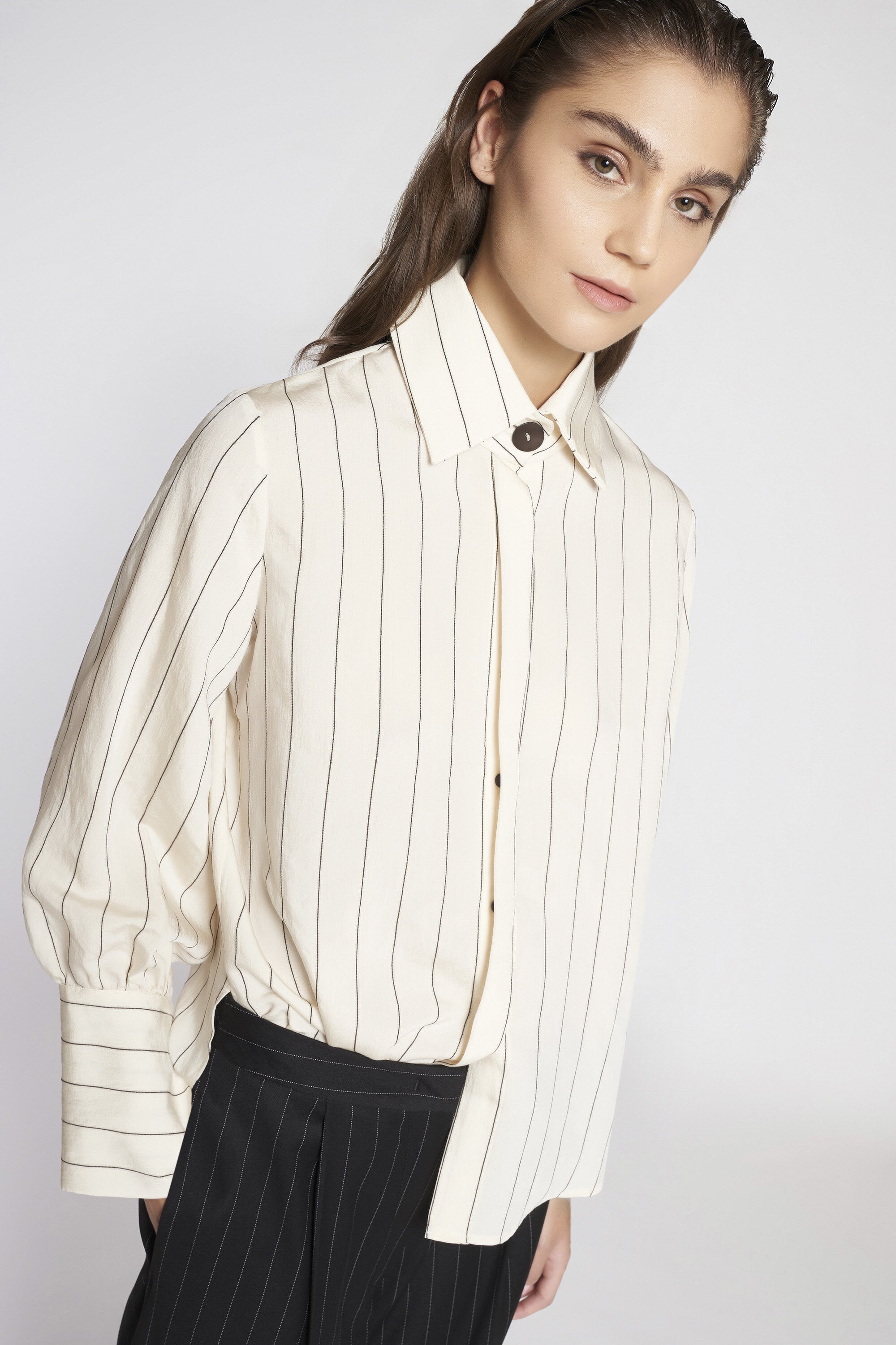 Camicia a maniche lunghe in modal gessato. Colletto classico. Polsini e allacciatura frontale con bottoni in madreperla opaca. Maniche ampie con fondo arricciato. Lunghezza sotto ai fianchi.
