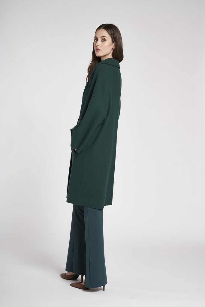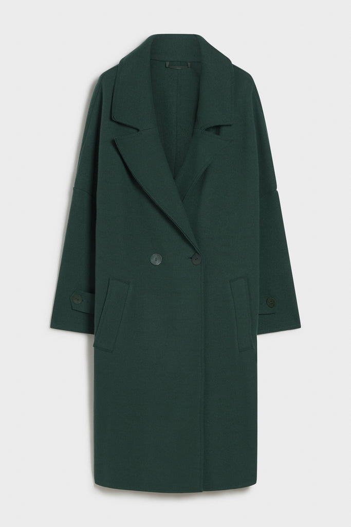 Cappotto doppiopetto sfoderato in lana mouflon con ampio scollo a revers e chiusura con bottoni in madreperla. Tasche a filetto e mostrine nei fondi manica. Lunghezza sotto il ginocchio.