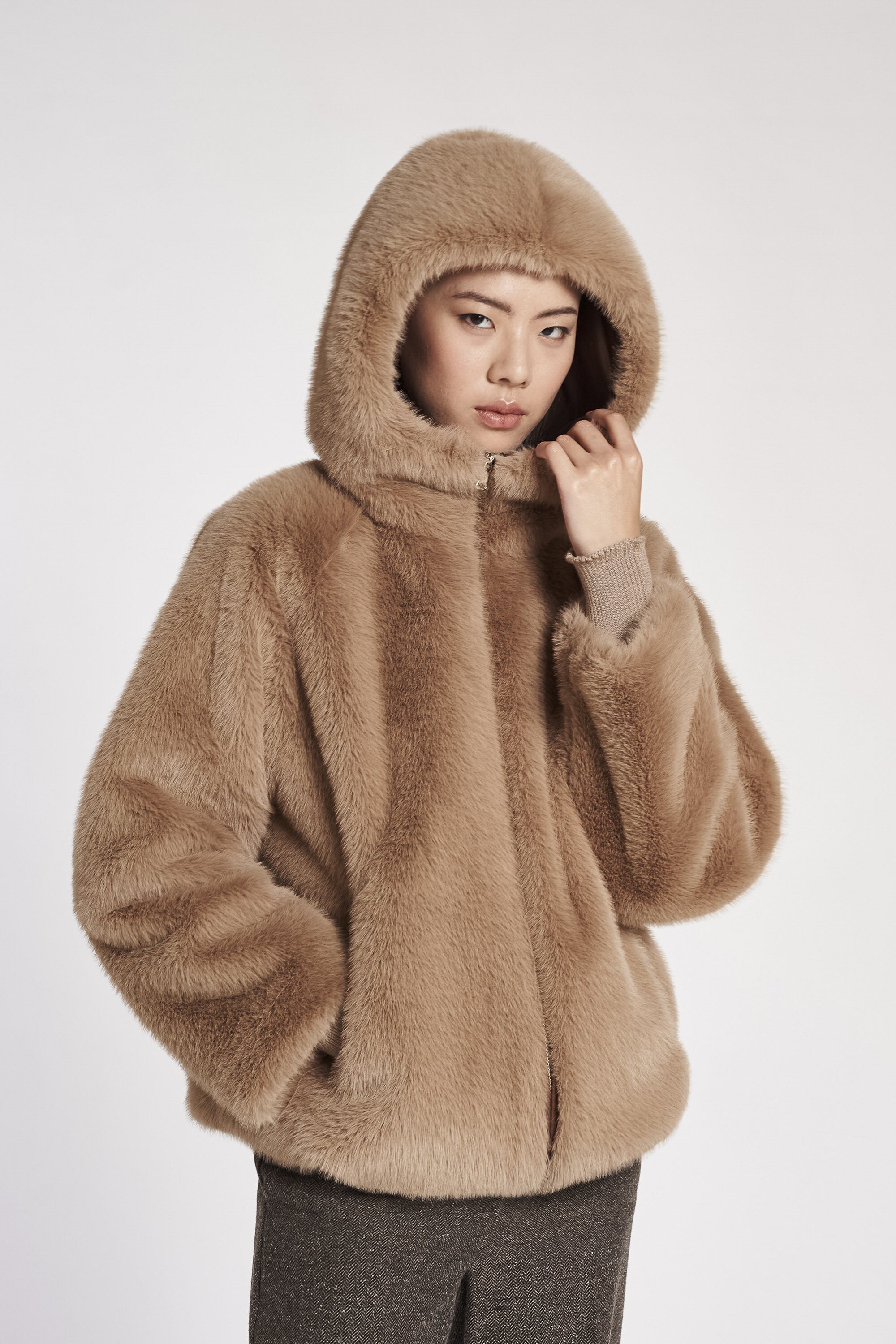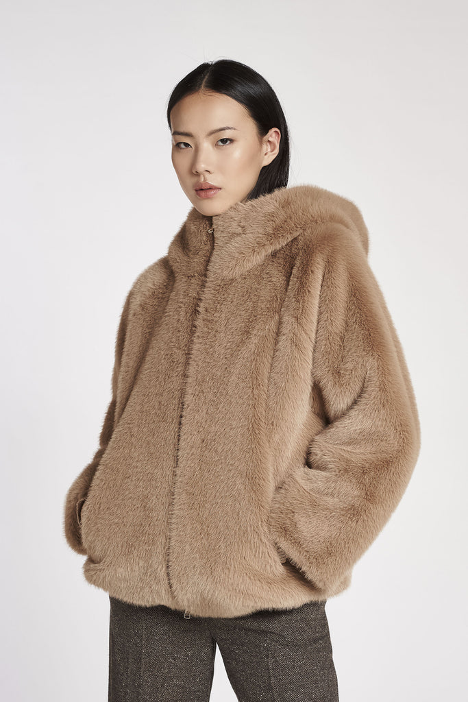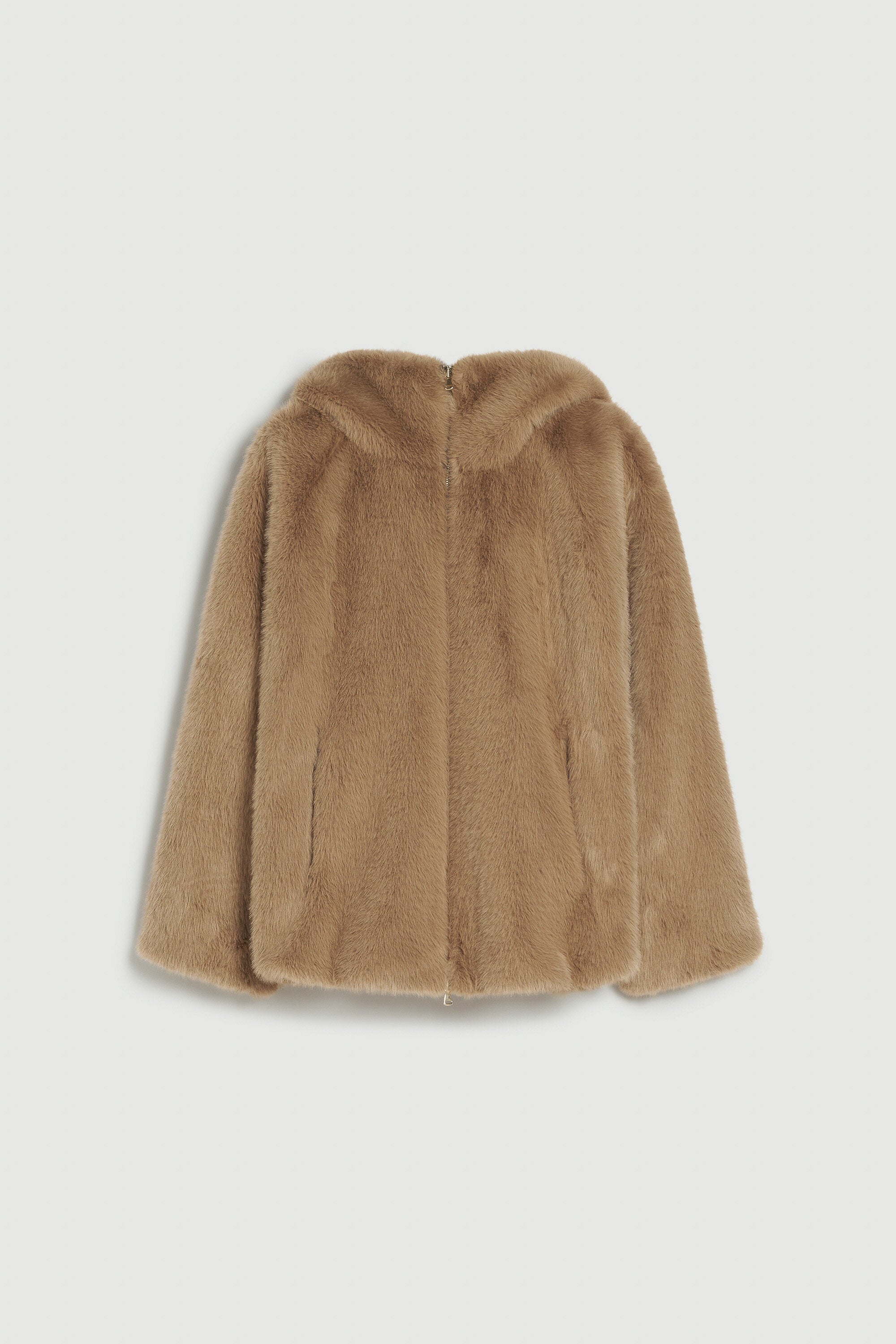 Pelliccia foderata in ecovisone con cappuccio. Allacciatura frontale con lampo di metallo con bor...Learn more