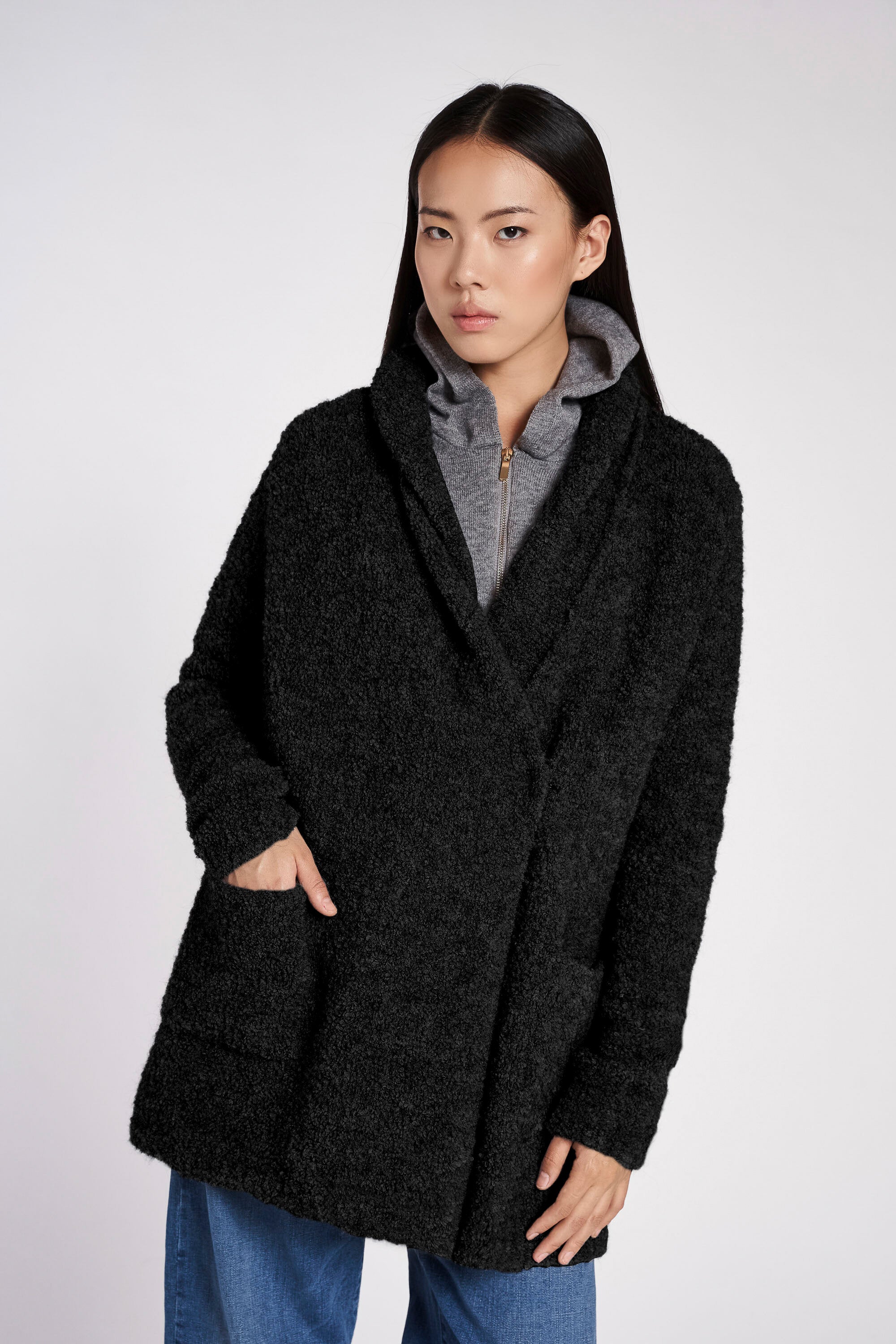 Soprabito in bouclè con collo sciallato e chiusura con gancio ad uncino. Ampie tasche a toppa applicate. Lunghezza sopra il ginocchio.