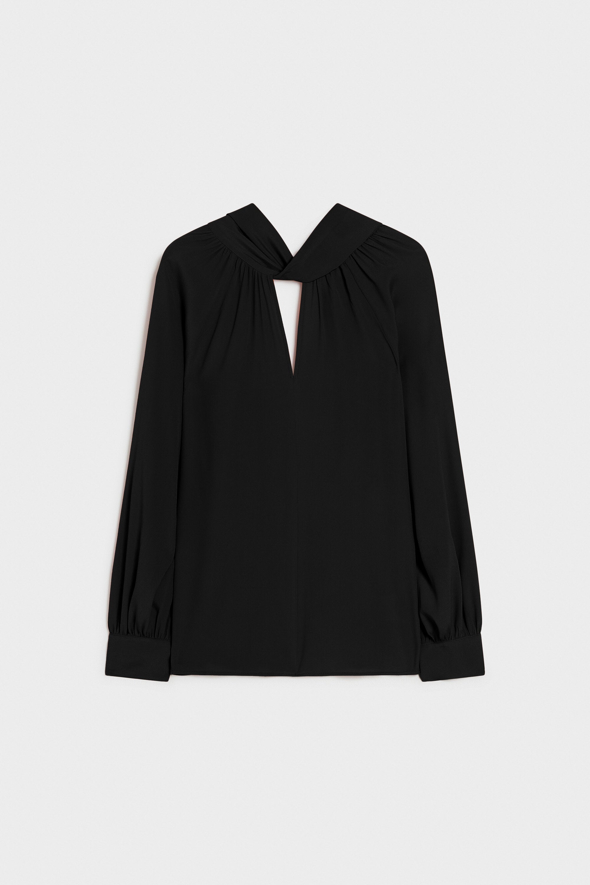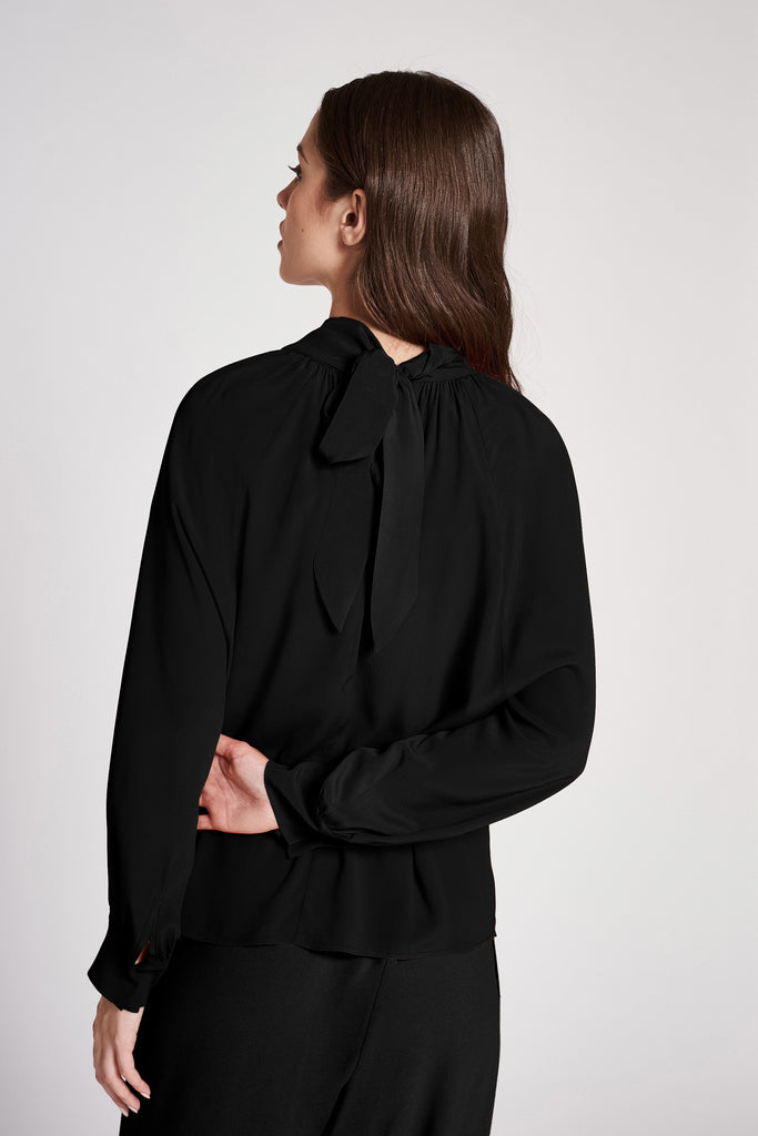 Camicia in crepe de chine con scollo a nodo che diventa nastro da annodare dietro. Maniche ampie con polsini chiusi da bottoni in madreperla. Lunghezza ai fianchi.