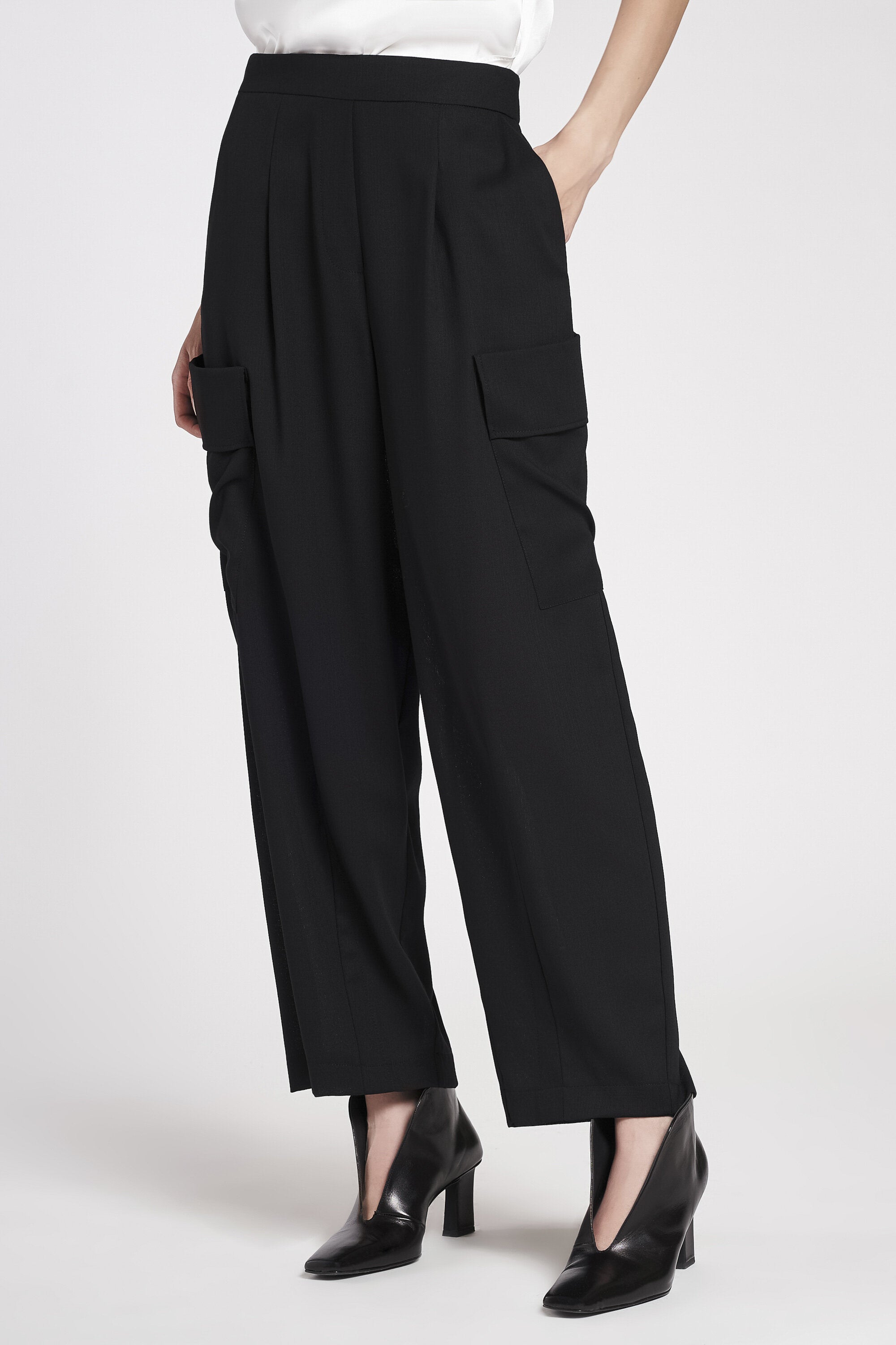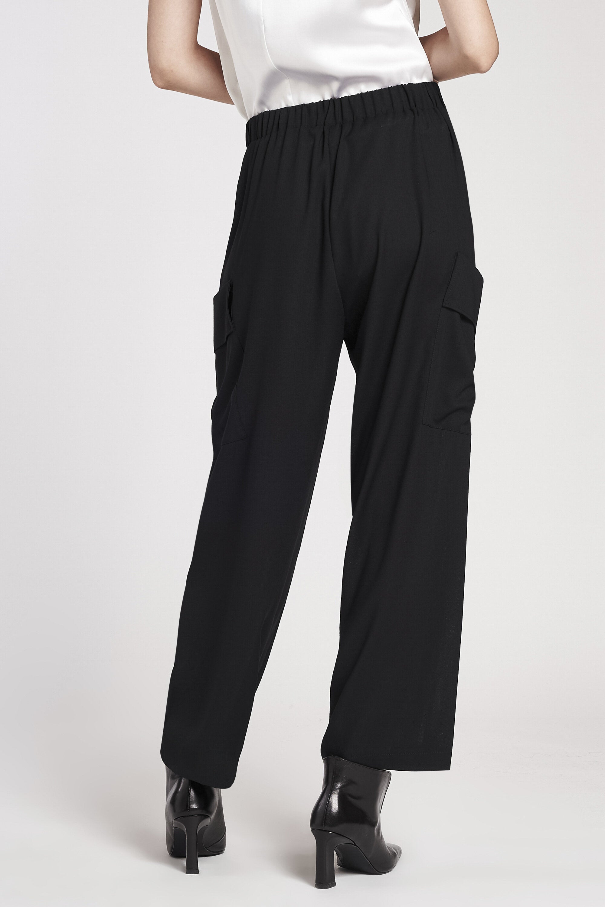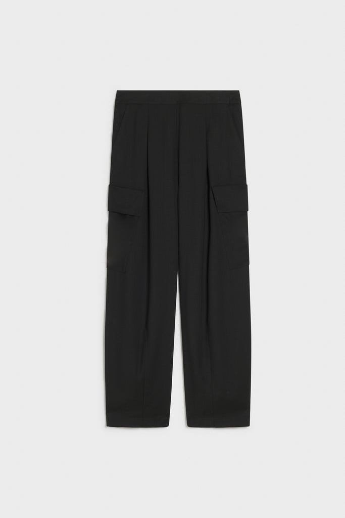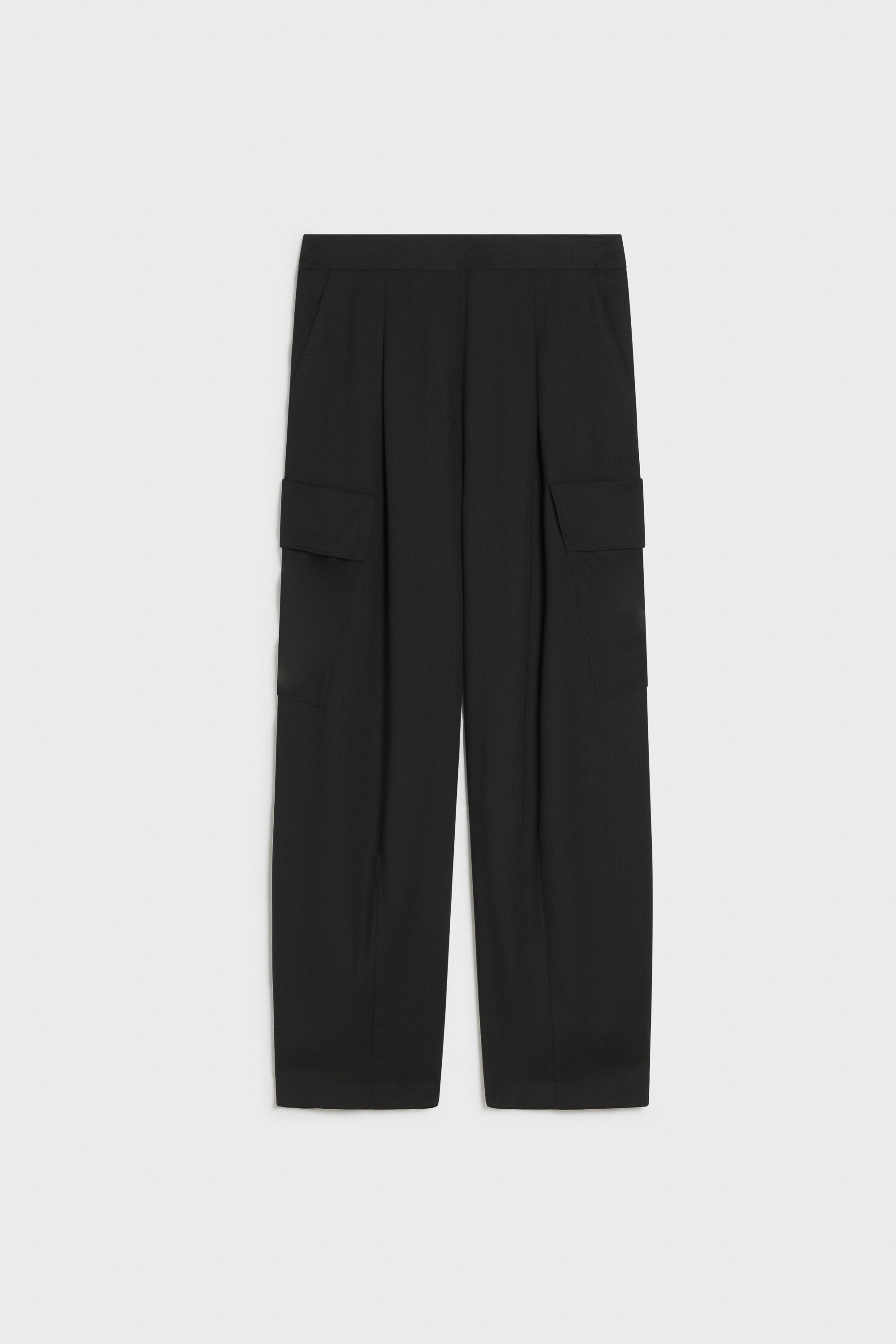 Pantaloni cargo in garza di lana con vita regolare e cavallo basso. Vita davanti con riprese e finta apertura ed elasticizzata dietro. Tasche alla francese e ampie tasche a toppa applicate. Ampie riprese sul fondo.