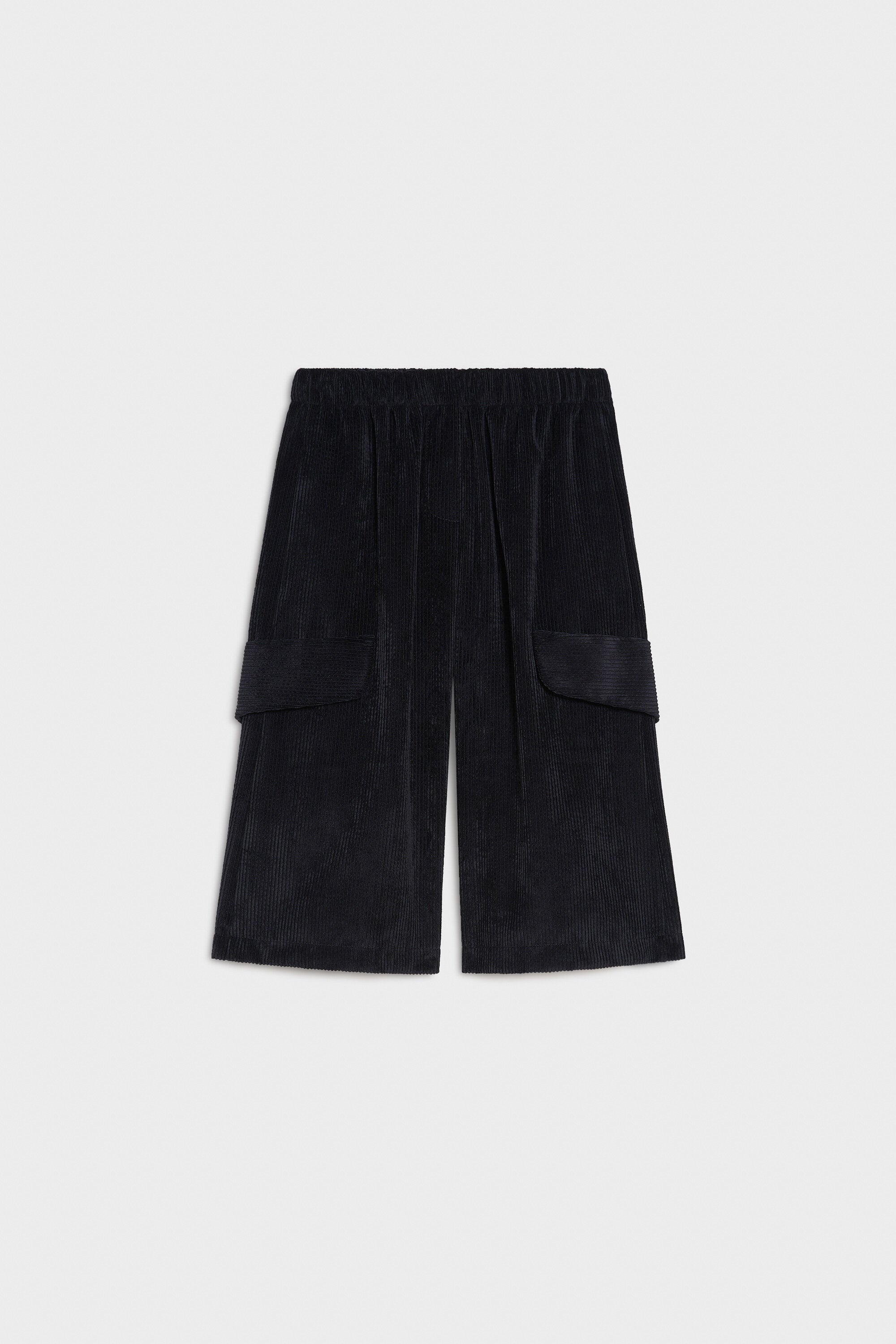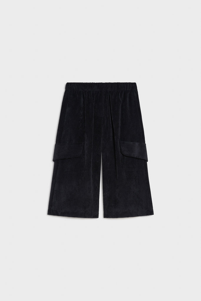 Bermuda in velluto a coste, dalla vita regolare. Elastico nel cintone. Cavallo basso. Tasche inserite nei fianchi. Patte applicate effetto tasca. Fondo ampio.