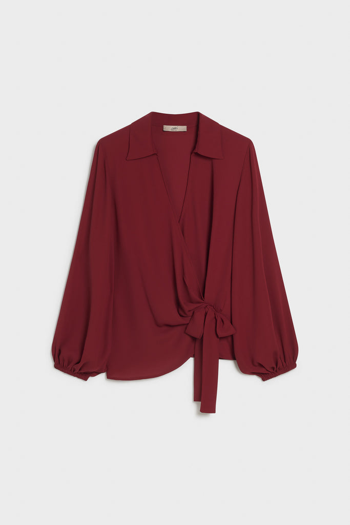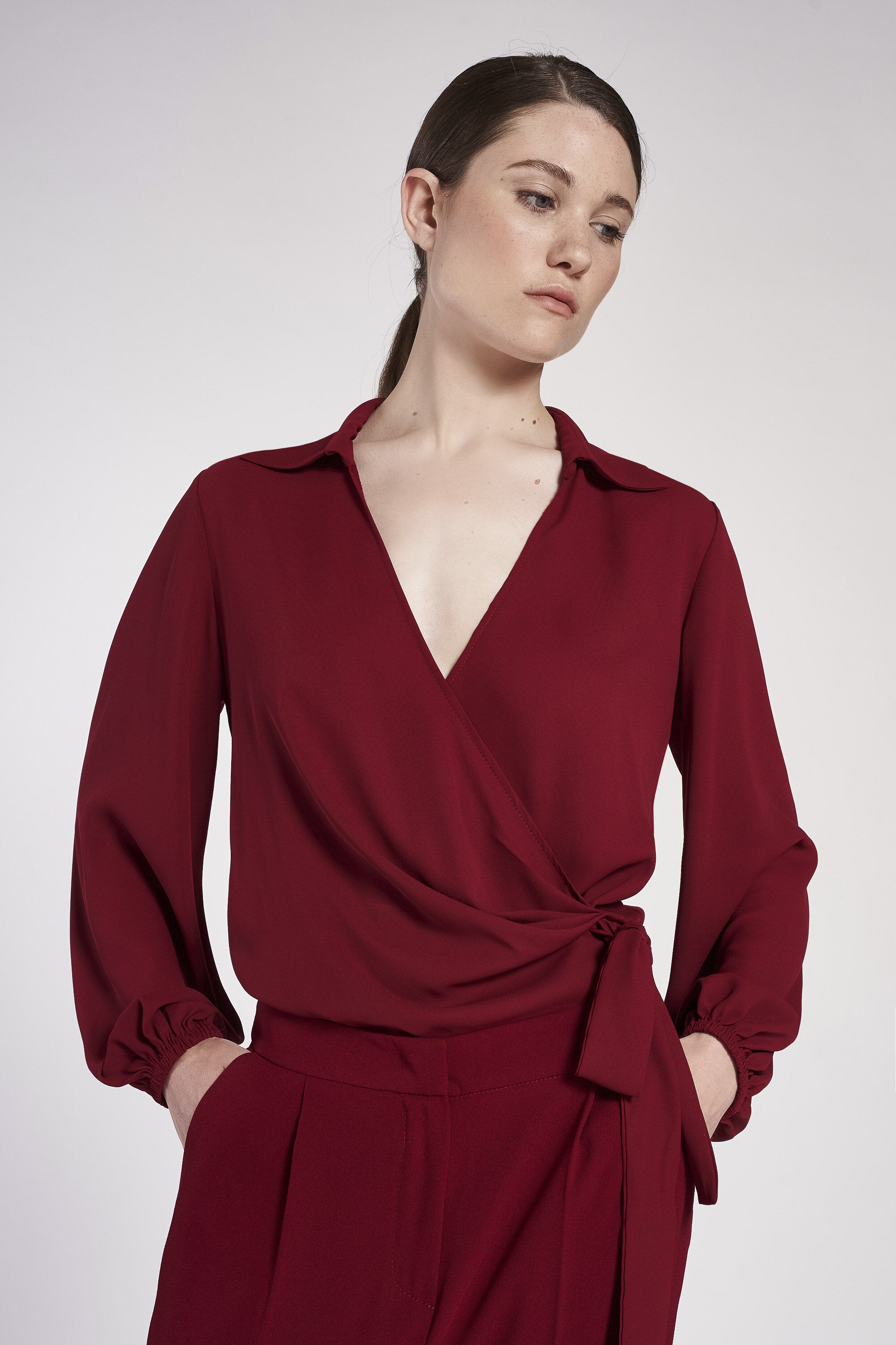 Camicia a maniche lunghe in crepe. Colletto classico e finta apertura incrociata con motivo fiocco in vita. Maniche ampie con elastico sul fondo Lunghezza ai fianchi.
