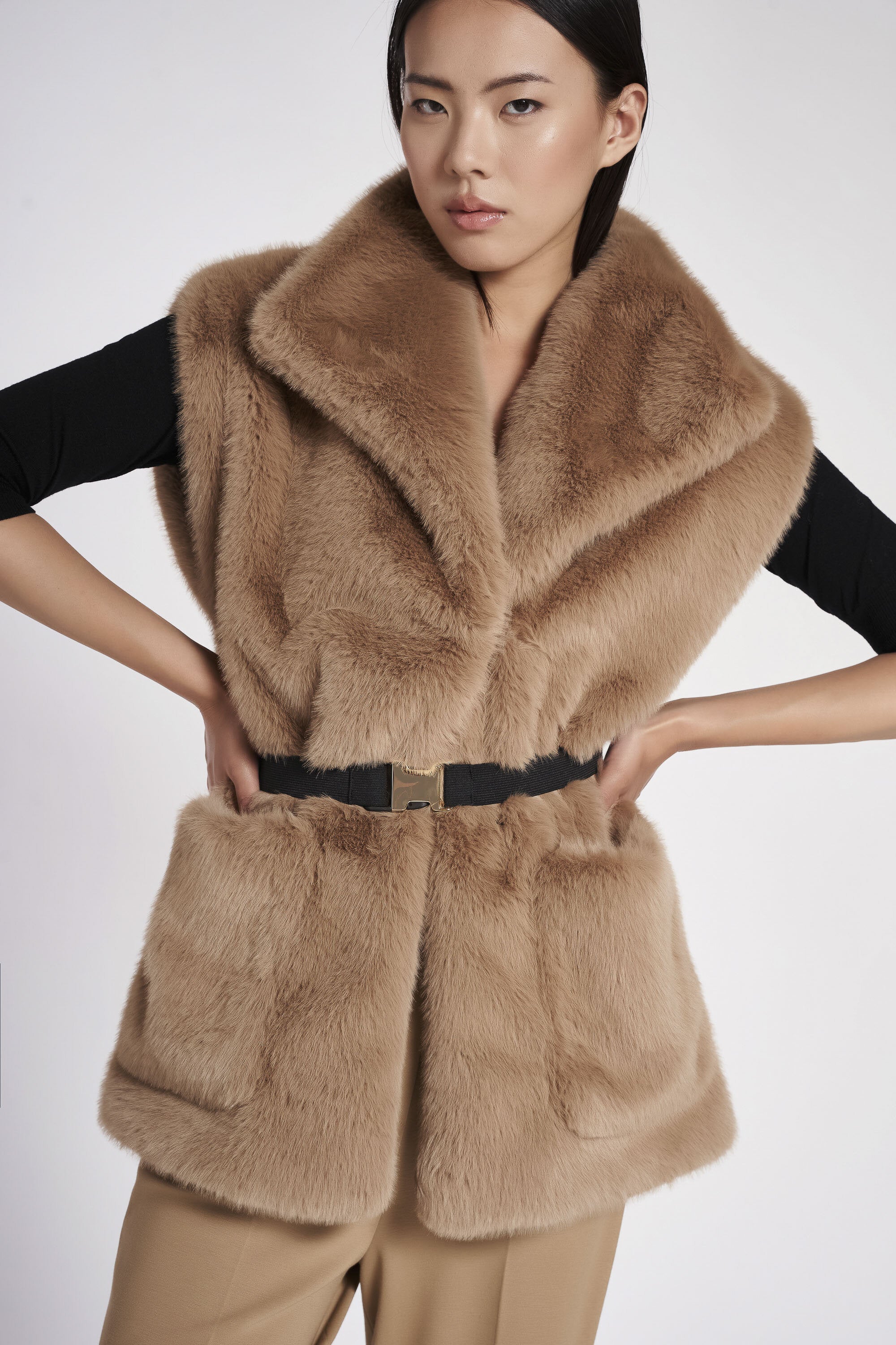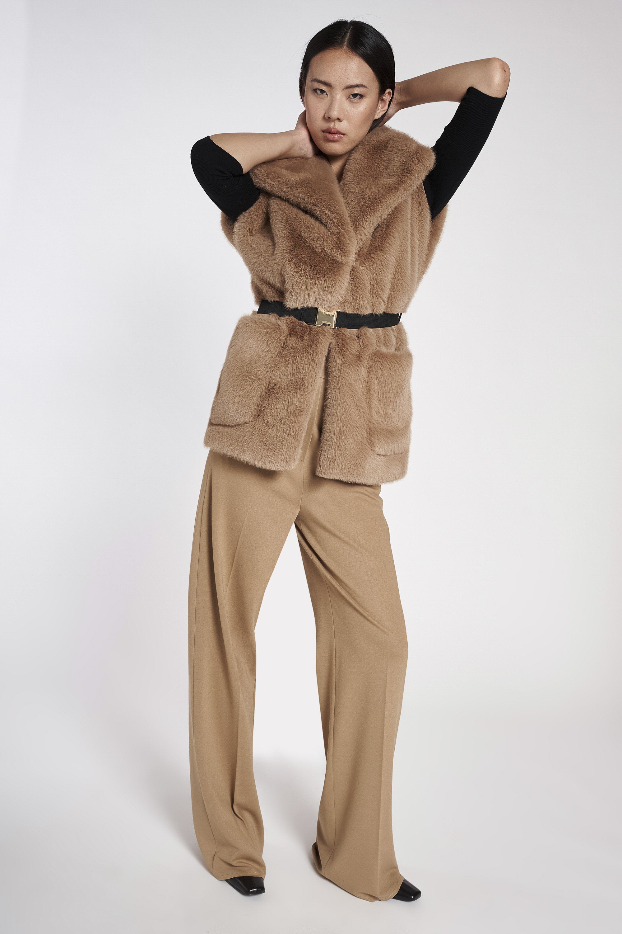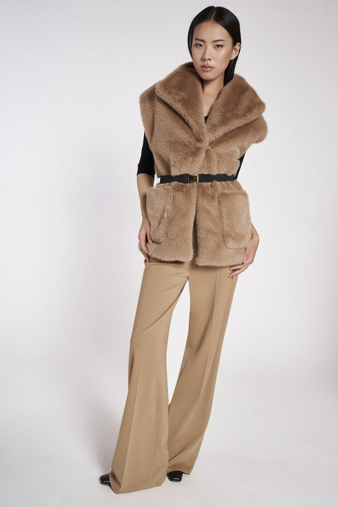 Gilet foderato con ecovisone. Collo a vela, passanti in vita e cintura elastica con fibbia bimateriale. Ampie tasche a toppa. Lunghezza sotto la vita.
