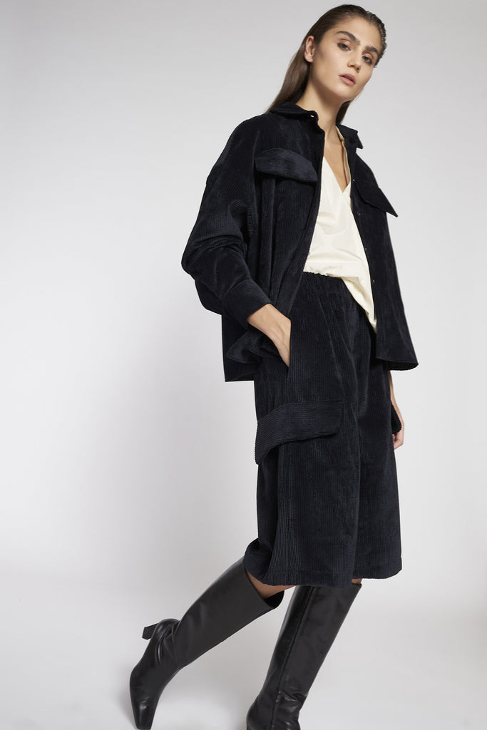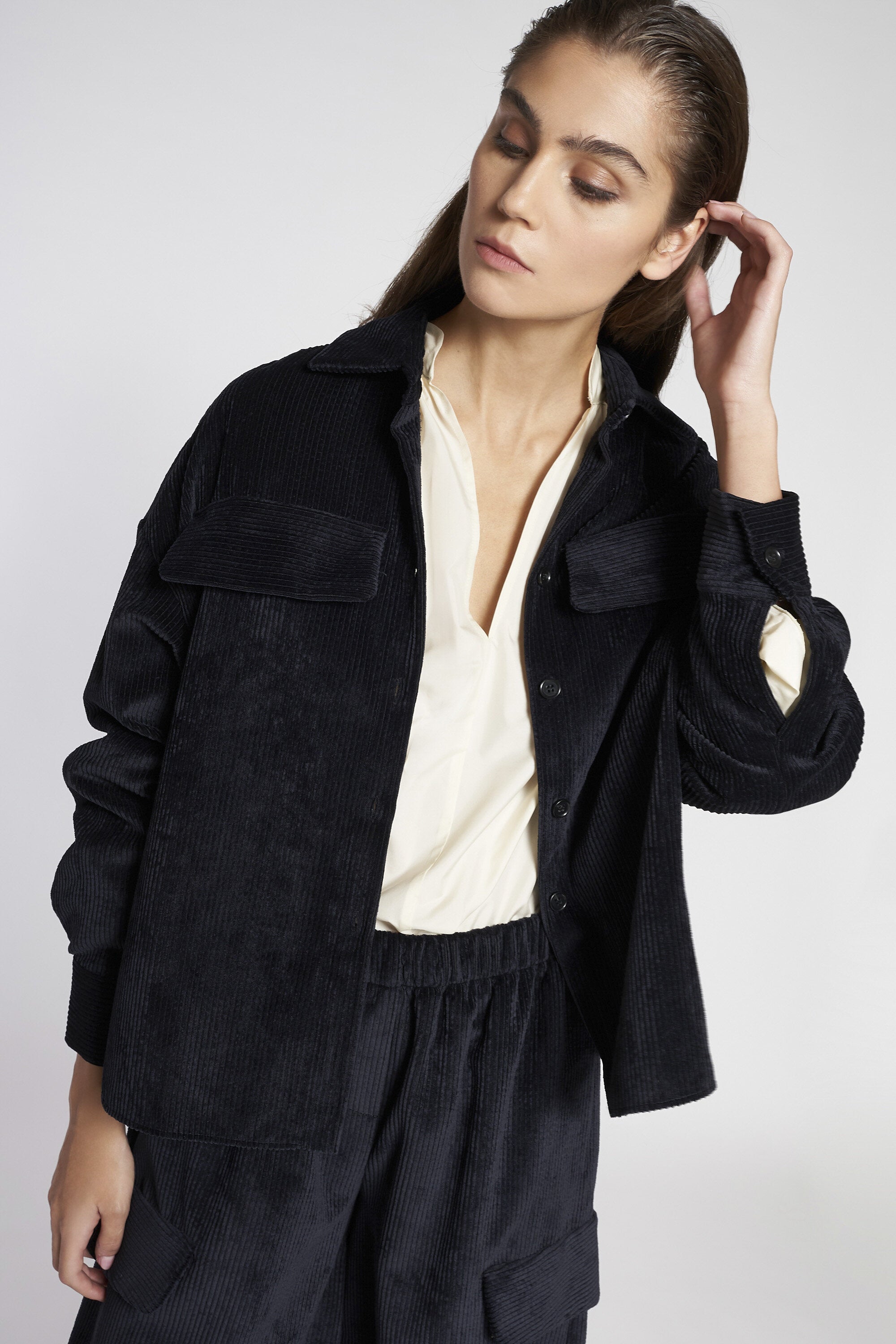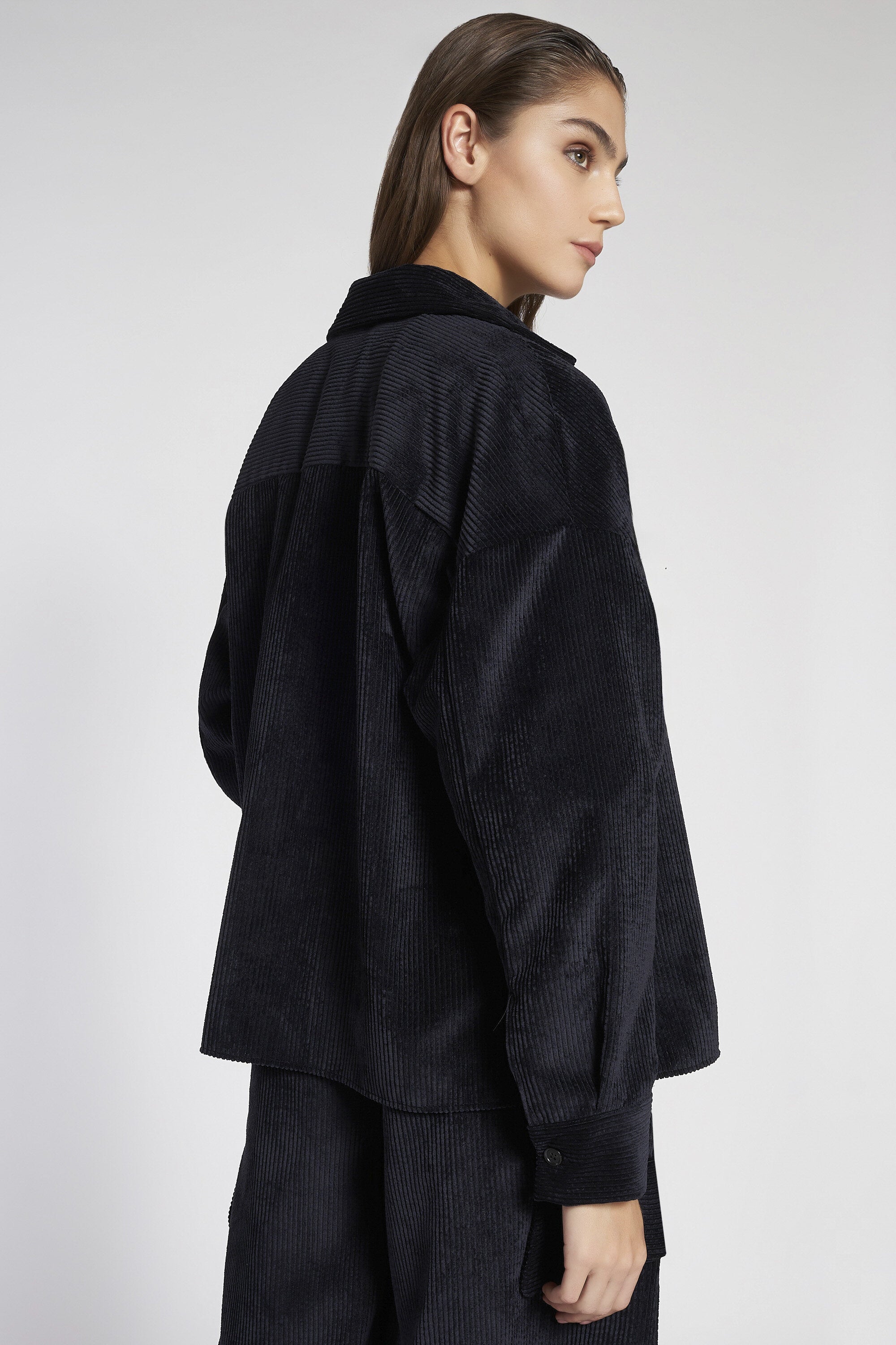 Camicia a maniche lunghe in velluto a coste. Colletto, polsini e allacciatura frontale chiusi da bottoni in eco-corno. Patte applicate effetto tasca. Lunghezza ai fianchi.