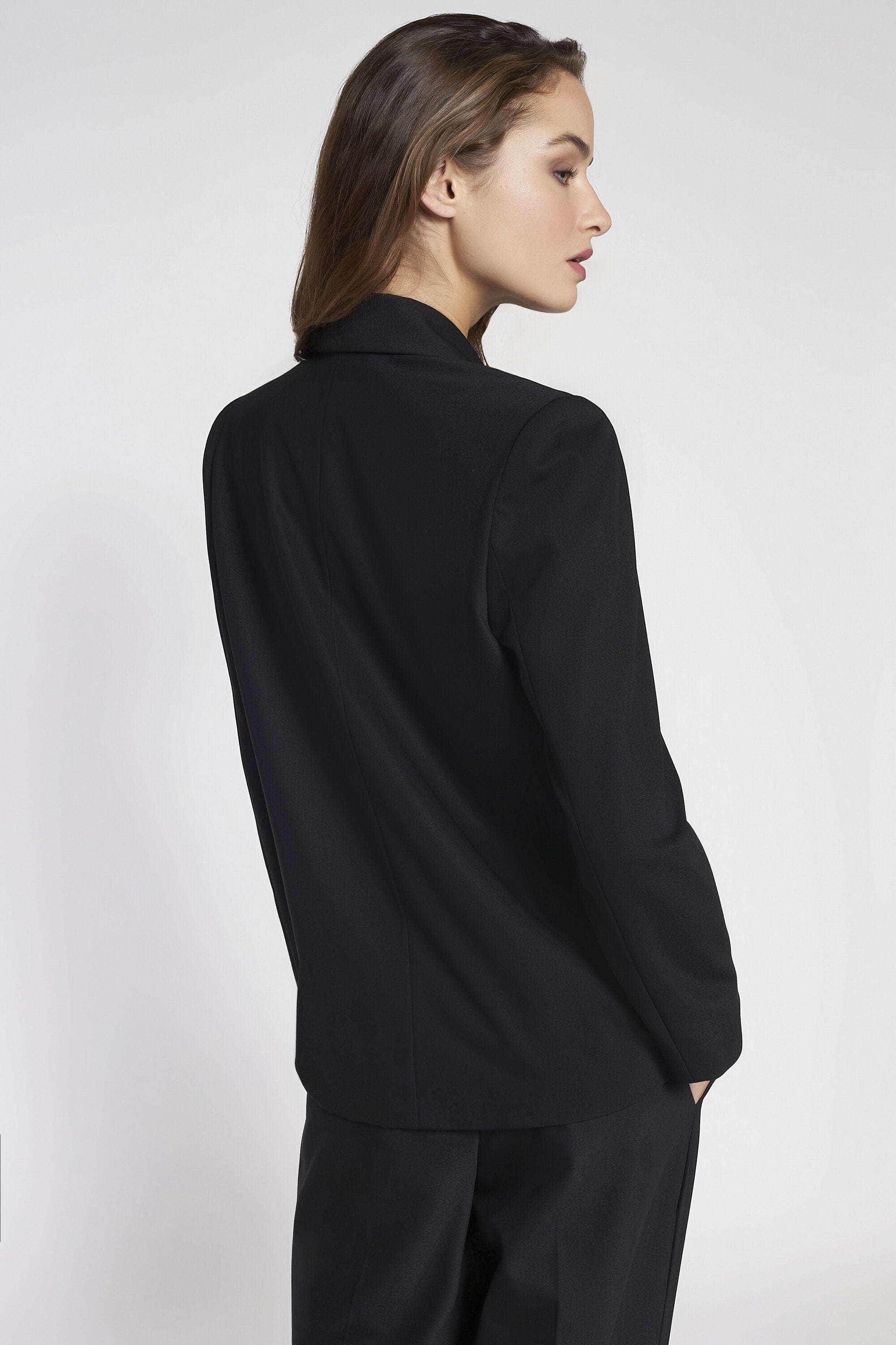 Blazer classico foderato in gabardine elasticizzata con spalline imbottite. Collo con revers a lancia e chiusura con bottone in eco-corno. Patte applicate effetto tasca. Lunghezza sotto ai fianchi.