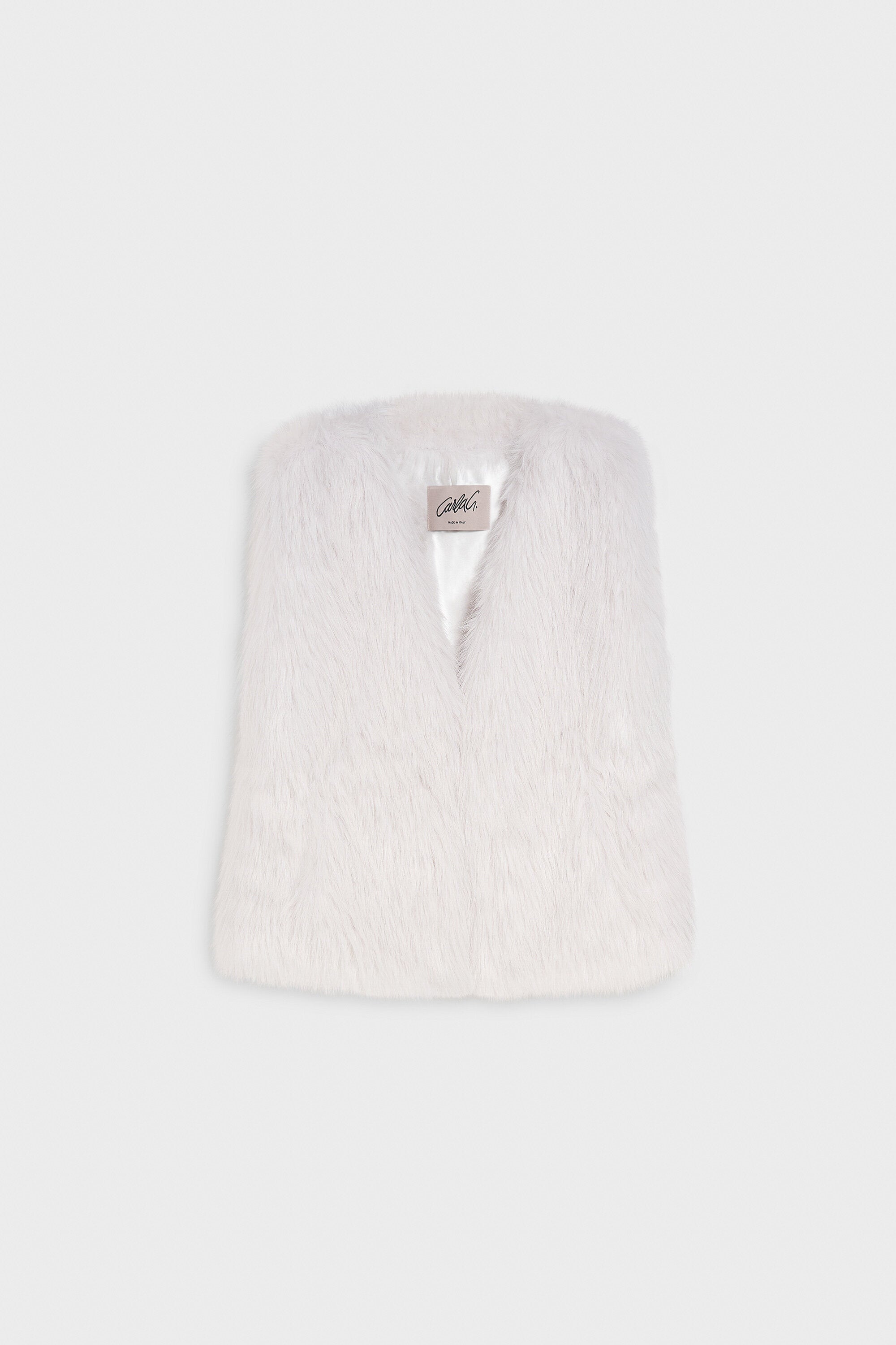 Gilet in ecovolpe. Scollo a V e allacciatura frontale con ganci ricoperti. Ampie tasche a filetto...Learn more
