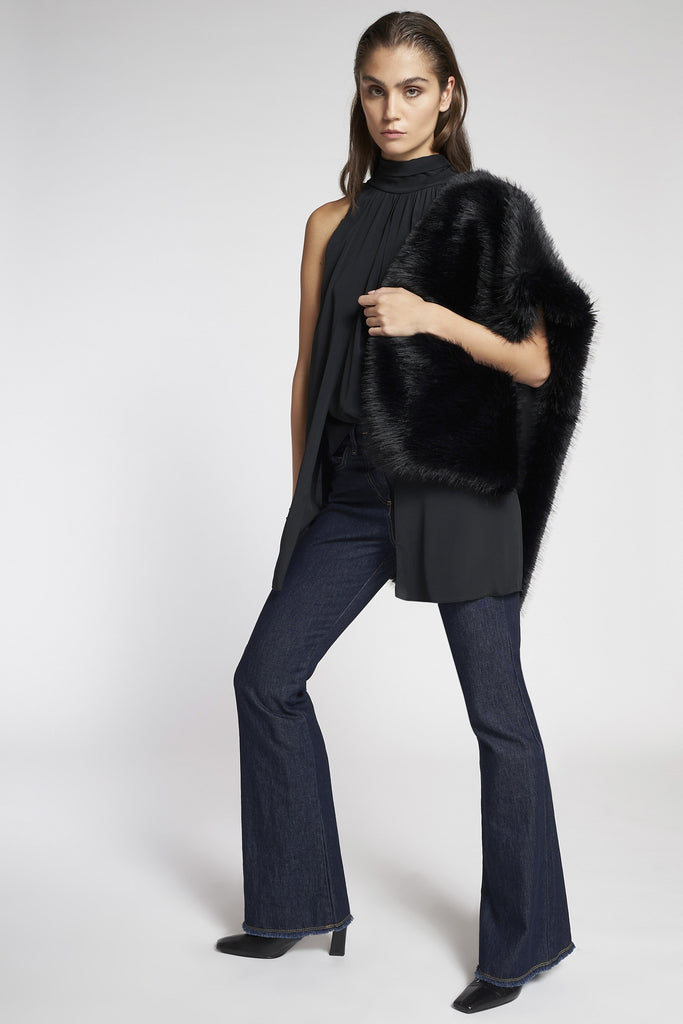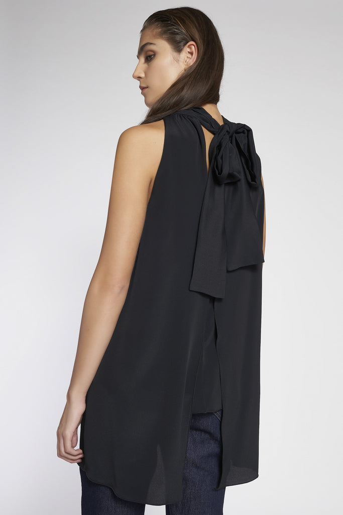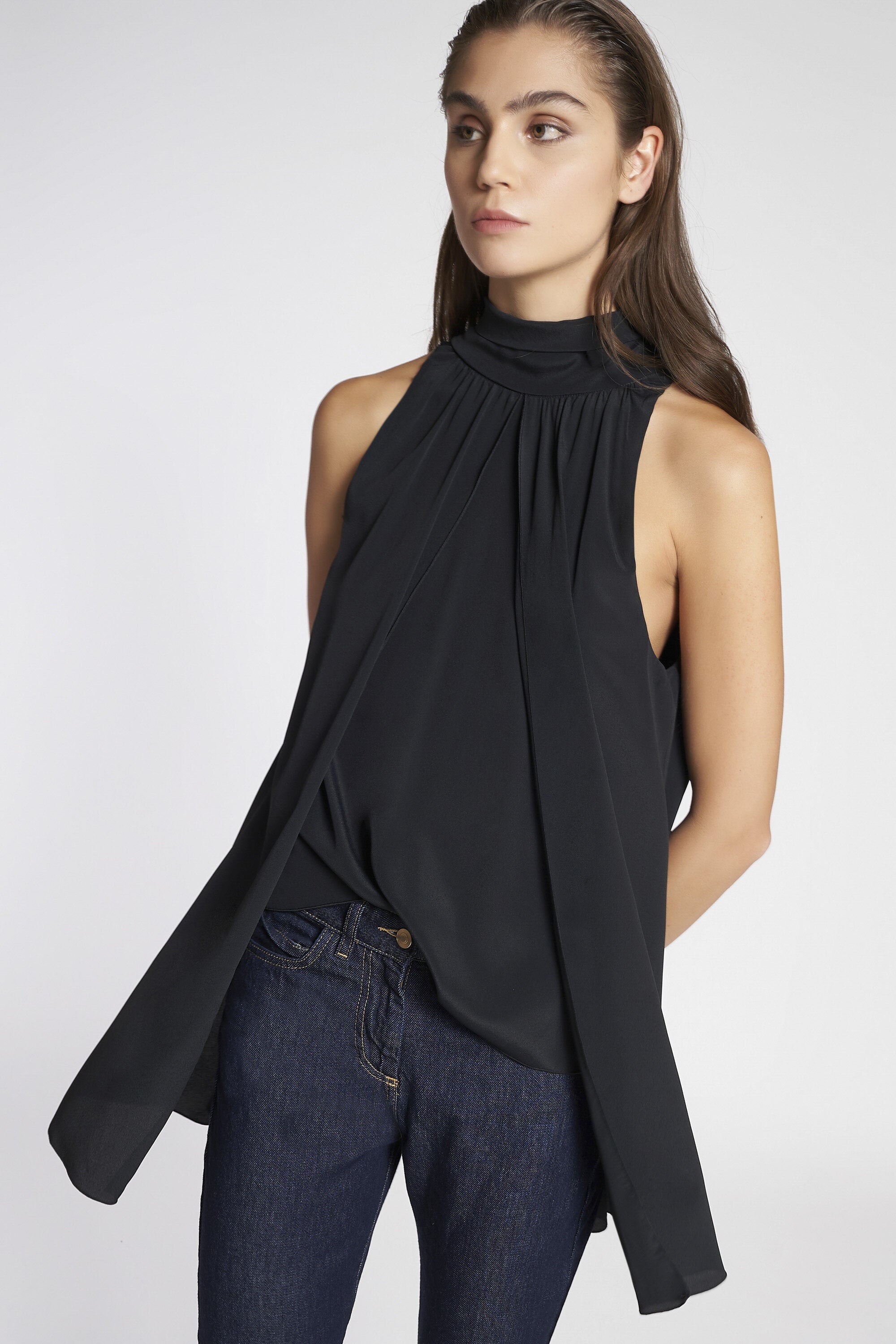 Maglia smanicata con pannelli in crepe de chine. Collo alto con chiusura nodo sul retro del collo.