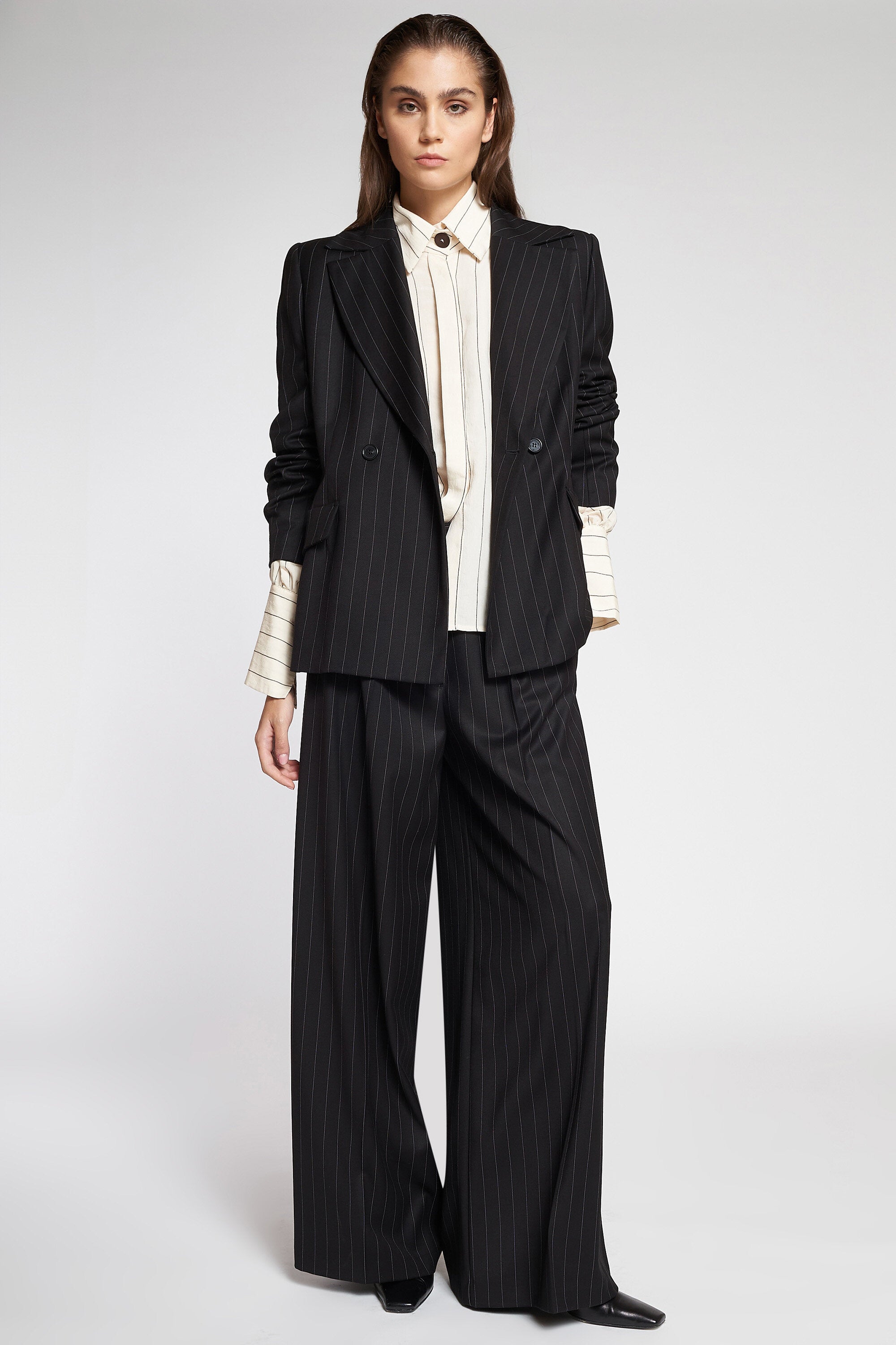 Pantaloni ampi in gessato elasticizzato. Vita regolare e cavallo basso. Chiusura con lampo e gancio sul davanti. Ampie riprese sul davanti ed entrata tasche laterale. Vestibilità morbida.